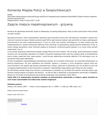 Komenda Miejska Policji w Świętochłowicach Źródło: http://www.swietochlowice.slaska.policja.gov.pl/k25/ruch-drogowy/czesto-zadawane-pytani/62911,Zajecie-miejsca-niepelnos prawnym-grzywna.html Wygenerowano: Środa, 8 marca 2017, 21:05 Zajęcie miejsca niepełnosprawnym - grzywną Kierowca źle zaparkował samochód. Został on odholowany na parking depozytowy. Kiedy za takie wykroczenie można dostać nie tylko mandat? Najczęściej kierowca, który nieprawidłowo zaparkuje swój samochód, karany jest 100-złotowym mandatem. Jednak kara może być znacznie surowsza. Mandat wyniesie nawet 500 zł, gdy kierowca zostawi swój samochód na miejscu parkingowym przeznaczonym dla osób niepełnosprawnych. Z tym że, jeżeli pod znakiem określającym, że dane miejsce jest dla niepełnosprawnych, została umieszczona tabliczka, która informuje, że pozostawiony pojazd zostanie odholowany (T-24), to koszty takiego parkowania rosną. Dochodzi zapłata za holowanie i przetrzymywanie pojazdu, co w sumie może wynieść nawet około 1 tys. zł. Co do zasady dyspozycję odholowania pojazdu wydają Policja lub straż miejska. Tak się dzieje, jeżeli pozostawiony pojazd utrudnia ruch lub powoduje zagrożenie na drodze. Oczywiście dyspozycja taka może być wydana także za pozostawienie auta w miejscu, gdzie jest znak „zakaz postoju”, a pod nim jest, wspomniana wcześniej, tabliczka T-24 informująca o tym, że samochód może zostać odholowany. W wielu przypadkach nieprawidłowego pozostawienia pojazdu nie ma jednak konieczności, by samochód odholowywać na parking depozytowy. Na koła zakładana jest blokada. Zgodnie z prawem o ruchu drogowym pojazd może być unieruchomiony w ten sposób, gdy kierowca pozostawił go w miejscu, gdzie jest to zabronione, lecz nie utrudnia to ruchu lub nie zagraża bezpieczeństwu innych kierowców czy pieszych. Taką blokadę mogą założyć tylko Policja lub straż miejska. Na 100-złotowy mandat mogą liczyć kierowcy za parkowanie na chodniku czy na drodze dla rowerów. Kara jest wyższa, gdy kierowca zostawi pojazd na przejściu dla pieszych – od 100 do 300 zł. Natomiast za pozostawienie samochodu w odległości bliższej niż 10 metrów od skrzyżowania lub przejazdu kolejowego może kosztować równe 300 zł. Także 300 zł to maksymalna wysokość mandatu za pozostawienie samochodu w miejscu, gdzie utrudnia on ruch innym samochodom lub widoczność znaków drogowych Podstawa prawna Ustawa z 20 czerwca 1997 r. – Prawo o ruchu drogowym (Dz. U. z 2005 r. nr 108, poz. 908 z późn. zm.). Źródło: Dziennik Gazeta Prawna Artykuł z dnia: 2011-05-11 Ocena: 0/5 (0) Tweetnij