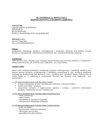 III. INFORMACJA DOTYCZĄCA BEZPIECZEŃSTWA I OCHRONY ZDROWIA INWESTOR: URZĄD GMINY W RZEWNIU, RZEWNIE 19, 06-225 RZEWNIE, POWIAT MAKOWSKI, WOJ. MAZOWIECKIE PROJEKTANT: mgr inż. Kinga Bolc upr. nr WAM/0029/POOS/10 Obiekt: -przebudowa istniejącego przyłącza wodociągowego i kanalizacji sanitarnej oraz budowa nowego przyłącza wodociągowego z hydrantem zewnętrznym p. poż., przyłącza kanalizacji sanitarnej. Lokalizacja: -hala sportowa wraz z boiskiem przy istniejącej Szkole Podstawowej na terenie działki nr 31, położonej w miejscowości Rzewnie, gm. Rzewnie, pow. makowski, woj. mazowieckie. 1.Zakres robót. Zakres robót obejmuje przebudowę istniejącego przyłącza wodociągowego i kanalizacji sanitarnej oraz budowę nowego przyłącza wodociągowego z hydrantem zewnętrznym p. poż., przyłącza kanalizacji sanitarnej do projektowanej hali sportowej wraz z boiskiem przy istniejącej Szkole Podstawowej na terenie działki nr 31, położonej w miejscowości Rzewnie, gm. Rzewnie, pow. makowski, woj. mazowieckie. 1.1. W zakres przedsięwzięcia wchodzą roboty ziemne: wykopy wykonywane ręcznie i mechanicznie, częściowo z odwozem urobku, montaż przewodów i urządzeń, zasypywanie wykopów, z zagęszczeniem, gruntem z wykopu, a częściowo dowiezionym piaskiem, wykonywane ręcznie i mechanicznie. 1.2. W zakres przedsięwzięcia wchodzą roboty przygotowawcze: - roboty pomiarowe, - roboty ziemne, - odwodnienie w zależności od potrzeb, - zabezpieczenie istniejącego uzbrojenia. 1.3. W zakres przedsięwzięcia wchodzą roboty wykończeniowe: - próby szczelności, - obetonowanie zwieńczeń uzbrojenia, - odtworzenie nawierzchni, - uporządkowanie placu budowy. Na cykl technologiczny robót składać się będą operacje: czynności przygotowawcze jak: zagospodarowanie placu budowy, pomiary, transport materiałów do strefy montażowej, roboty ziemne jak: wykopy, budowa zabezpieczenia ścian, montaż przewodów jak: tyczenie trasy, ustalenie spadków, przygotowanie podłoża, układanie rur, łączenie rur, kształtek i armatury, płukanie, próby hydrauliczne, roboty wykończeniowe jak: zasypka, zagęszczanie zasypki, zasypywanie wykopów, rozbiórka zabezpieczeń ścian wykopów, obetonowanie uzbrojenia i uporządkowanie placu budowy. Operacje powinny być wykonywane przez wykwalifikowanych pracowników. Ilość brygad należy uzależnić od narzuconego tempa robót i stopnia mechanizacji. 2.Wykaz istniejących obiektów budowlanych. W strefie prowadzonych robót znajdują się: - infrastruktura podziemna, - nie wyklucza się istnienia innych, nie ujawnionych urządzeń podziemnych. 3.Wskazania dotyczące przewidywanych zagrożeń występujących podczas realizacji robót budowlanych. Przewidywanym zagrożeniem przy wykonywaniu przedmiotowych robót jest: - osunięcie się ścian wykopów, przy robotach ziemnych, - zasypanie pracownika w wykopie przy braku zabezpieczenia ścian przed obsunięciem się lub obciążeniem klina naturalnego odłamu gruntu urobkiem pochodzącym z wykopu, - upadek pracownika lub osoby postronnej do wykopu przy braku wygrodzenia wykopu balustradami bądź braku przykrycia wykopu, - potrącenie pracownika lub osoby postronnej łyżką koparki przy braku wygrodzenia strefy niebezpiecznej, - najechania na pracownika przez sprzęt rozładowujący „pracujący na wstecznym biegu”, - porażenie prądem podczas używania elektronarzędzi, - uszkodzenie infrastruktury podziemnej przy nieprzestrzeganiu reżimu wykonywania ręcznie wykopów w strefie ochronnej. Wymogi bezpieczeństwa: • przed rozpoczęciem robót ziemnych należy podjąć wszystkie możliwe działania mające na celu zidentyfikowanie i zaznaczenie w terenie tras urządzeń podziemnych, • teren objęty wykonawstwem robót należy w miarę możliwości ogrodzić i oznakować tablicami informacyjnymi i ostrzegawczymi, • zabronione jest składowanie urobku i materiałów w granicach klina odłamu gruntu, jeśli ściany są nieumocnione, • jeżeli wykop osiągnie głębokość większą niż 1,0 m od poziomu terenu, należy wykonać zejście (wejście) do wykopu. Odległość pomiędzy zejściami do wykopu nie powinna przekraczać 20m, • przy wykonywaniu robót ziemnych sprzętem zmechanizowanym należy wyznaczyć przy maszynach strefę niebezpieczną, w której istnieje potencjalne zagrożenie wypadkowe, wynoszącą min. 6m, • umocnienia ścian wykopów usuwać z zachowanie ostrożności – równolegle z zasypką, ze względu na możliwość obsunięcia się ścian wykopu, • przy prowadzeniu robót ziemnych w bezpośrednim sąsiedztwie gazociągów, kabli telefonicznych, energetycznych, melioracyjnych, kanalizacyjnych należy zapewnić fachowy nadzór, a osoba nadzorująca roboty jest obowiązana w porozumieniu z właściwymi jednostkami (właścicielami instalacji) określić odległości od instalacji, w jakich można bezpiecznie wykonywać te roboty, w pionie i poziomie, • w razie przypadkowego odkrycia w trakcie robót ziemnych jakichkolwiek wymienionych wyżej instalacji - należy niezwłocznie przerwać roboty do czasu ustalenia pochodzenia tych instalacji i określenia czy i w jaki sposób jest możliwe dalsze bezpieczne prowadzenie robót, • składowanie ziemi w pobliżu wykopu bez zabezpieczenia jest dozwolone pod warunkiem zachowania takiej odległości, aby nie zachodziła obawa obsuwania się skarp, • przy zagęszczaniu gruntu ubijakami mechanicznymi miejsce pracy należy ogrodzić zaporami przenośnymi, • w miejscu wykonywania w/w prac zabrania się prowadzenia jakichkolwiek innych prac oraz przebywania osób postronnych, pracownicy obsługujący zagęszczarki mechaniczne powinni zmieniać się nie rzadziej, niż co pół godziny. Zabronione jest urządzanie stanowisk pracy, składowisk materiałów i elementów budowlanych lub maszyn i urządzeń budowlanych bezpośrednio pod liniami napowietrznymi lub w odległości mniejszej (licząc w poziomie) od skraj
