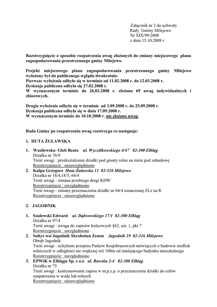 Załącznik nr 2 do uchwały Rady Gminy Milejewo Nr XIX/99/2008 z dnia 15.10.2008 r. Rozstrzygnięcie o sposobie rozpatrzenia uwag złożonych do zmiany miejscowego planu zagospodarowania przestrzennego gminy Milejewo. Projekt miejscowego planu zagospodarowania przestrzennego gminy Milejewo wyłożony był do publicznego wglądu dwukrotnie. Pierwsze wyłożenie odbyło się w terminie od 11.02.2008 r. do 12.03.2008 r. Dyskusja publiczna odbyła się 27.02.2008 r. W wyznaczonym terminie do 26.03.2008 r. złożono 69 uwag indywidualnych i zbiorowych. Drugie wyłożenie odbyło się w terminie od 3.09.2008 r. do 25.09.2008 r. Dyskusja publiczna odbyła się w dniu 17.09.2008 r. W wyznaczonym terminie do 10.10.2008 r. nie złożono uwag. Rada Gminy po rozpatrzeniu uwag rozstrzyga co następuje: 1. HUTA ŻUŁAWSKA 1. Wasilewska- Gleb Beata ul. Wyczółkowskiego 4/47 82-300 Elbląg Działka nr 76/9 Treść uwagi : przekształcenie działki pod grunty rolne na teren pod zabudowę Rozstrzygnięcie : nieuwzględniono 2. Kulpa Grzegorz Huta Żuławska 11 82-316 Milejewo Działka nr 18/4,18/5, 64/4 Treść uwagi : zmiana przebiegu drogi KDW Rozstrzygnięcie : uwzględniono Treść uwagi : zmiany przeznaczenia działki nr 64/4 oznaczonej ZLz na R Rozstrzygnięcie : nieuwzględniono 2. JAGODNIK 1. Szulewski Edward ul. Dąbrowskiego 17/1 82-300 Elbląg Działka nr 97/4 Treść uwagi : uwaga do zapisów końcowych §62, ust. 1, pkt 7 Rozstrzygnięcie : uwzględniono 2. Sołtys wsi Jagodnik Skrobotun Zenon Jagodnik 19 82-316 Milejewo Obręb Jagodnik Treść uwagi : uchylenie przepisu Parków Krajobrazowych mówiących o budowie siedlisk rolniczych w odległości nie większej niż 100m od istniejącego budynku mieszkalnego Rozstrzygnięcie : uwzględniono 3. EPWiK w Elblągu Sp. z o.o ul. Rawska 2-4 82-300 Elbląg Działka nr 75 Treść uwagi : kontynuowanie zapisu w m.p.z.p. o przeznaczeniu działki do celów zaopatrzenia w wodę lub rolnych Rozstrzygnięcie : nieuwzględniono 4. Juchniewicz Zbigniew ul. Daszyńskiego 20/16 82-300 Elbląg Działka nr 147/2 Treść uwagi : przesunięcie granicy obszaru pod zabudowę MR Rozstrzygnięcie : nieuwzględniono 5. Majewska- Gannon Renata Gannon Michael ul. Metalowców 22 82-300 Elbląg Działka nr 28/1 , 30/1, 28/1 Treść uwagi : przekształcenie gruntów oznaczonych symbolem R na MR oraz z ZP na teren RM Rozstrzygnięcie : uwzględniono 6. Płoczyńscy Aleksandra Waldemar Jagodnik 6a 82-316 Milejewo Wałeccy Zbigniew Janina Działki 89/6, 89/7, 81 Treść uwagi : przesunięcie strefy ekspozycji bliżej drogi KDD Rozstrzygnięcie : nieuwzględniono Treść uwagi : wprowadzenie drogi wewnętrznej Rozstrzygnięcie : nieuwzględniono 3. KAMIENNIK WIELKI 1. Sieczkowski Aleksander Kamiennik Wielki 36/1 82-316 Milejewo Działka nr 2/15 Treść uwagi : Przekształcenie części działek oznaczonych P i Zl na MR. Likwidacja korytarza przemieszczania zwierząt Rozstrzygnięcie : uwzględniono 2. Woźniak Krystyna Kamiennik Wielki 30a 82-316 Milejewo Treść uwagi : uwzględnienie w planie zagosp. przestrzennego chodnika na odcinku drogi krajowej 509, Stoboje- Stagniewo Rozstrzygnięcie : nie dotyczy obszaru planu 4. MAJEWO 1. Zakrzewska Katarzyna Majewo 47 82-316 Milejewo Działka nr 25/3 Treść uwagi : Zmiana przeznaczenia terenu ZP nr dz. 25/3, na drogę lokalną Rozstrzygnięcie : nieuwzględniono 2. Raczewski Paweł Majewo 50 82-316 Milejewo Działki nr 155 i 153/2 Treść uwagi : Przekształcenie działek z rolnej na budowlaną. Rozstrzygnięcie : nieuwzględniono 3. Kowalska Elżbieta ul. Twarda 18d/6 ,80-871 Gdańsk Działki nr 152 Treść uwagi : Przekształcenie działek z rolnej na budowlaną Rozstrzygnięcie : nieuwzględniono 4. Błaszkiewicz Katarzyna Majewo 42 82-316 Milejewo Działki nr 14/5 i 21 Treść uwagi : Likwidacja US na działce nr 14/5, proponowane tereny pod US na działce nr 21 Rozstrzygnięcie : uwzględniono 5. Lewińska Dorota ul. Myliusa 2/9 82-300 Elbląg Działka 14/5 Treść uwagi : Przekształcenie terenów oznaczonych US na tereny R Rozstrzygnięcie : uwzględniono 6. Gniadek Helena Majewo 4/2 82-316 Milejewo Działka 151 Treść uwagi : Zmiana przeznaczenia działki z rolniczej na budowlaną jednorodzinną rezydencjonalne Rozstrzygnięcie : nieuwzględniono 7. Raczewski Paweł i Raczewski Marcin Majewo 53 82-316 Milejewo Działki nr 153/2,155 Treść uwagi : Przeznaczenie działki na cele nierolnicze Rozstrzygnięcie : nieuwzględniono 8. Zakrzewscy Aleksander, Leokadia, Jan Majewo 55 82-316 Milejewo Łałyko Barbara Majewo 82-316 Milejewo Marzena Justyna Tomasz Mociccy Majewo 82-316 Milejewo Morgut Iwona Andrzej, Łałyko Zdzisława Majewo 82-316 Milejewo Raczewscy Marek i Halina Łałyko Roman Majewo 82-316 Milejewo Gross Alfred Majewo 82-316 Milejewo Gross Grażyna Majewo 82-316 Milejewo Dusza Bogusław Dusza Waldemar Machajewska Genowefa Majewo 82-316 Milejewo Duniec Adam Majewo 82-316 Milejewo Gross Zbigniew Majewo 82-316 Milejewo Działka nr 25/13 Treść uwagi : Przekształcenie działki oznaczonej jako US na ZI Rozstrzygnięcie : uwzględniono 5. MILEJEWO 1. Dydelowie Jerzy Franciszek, Maria, Aleksander, Stefan, ul. Odrodzenia 10, 82-300 Elbląg dz. NR 81/1 treść uwagi : przeznaczenie gruntów rolnych pod zabudowę mieszkaniowo- usługową. rozstrzygnięcie : nieuwzględniono 2. SPÓŁKA MEBLOWA „KAM”s.j. ul. Szkolna 5, 82-316 Milejewo Działka nr 52/9 Treść uwagi : Przekwalifikowanie działki oznaczonej jako ZLz, R, P na tereny obiektów produkcyjnych i składów. Rozstrzygnięcie : uwzględniono 3. Wasilewska- Gleb Beata ul. Wyczółkowskiego 4/47 82-300 Elbląg Dz. nr 76/3 Treść uwagi : Przekształcenie działki pod grunty rolne na teren pod zabudowę Rozstrzygnięcie : nieuwzględniono 4. Włoch Eugeniusz ul. Lipowa 12 82-316 Milejewo Dz. nr 98/6 Treść uwagi : przesunięcie drogi o 30m od granicy. Rozstrzygnięcie : nieuwzględniono 5. Kwietniewska Anna Maria ul. Elbląska 39a 82-316 Milejewo Dz. nr 46/1 Tr