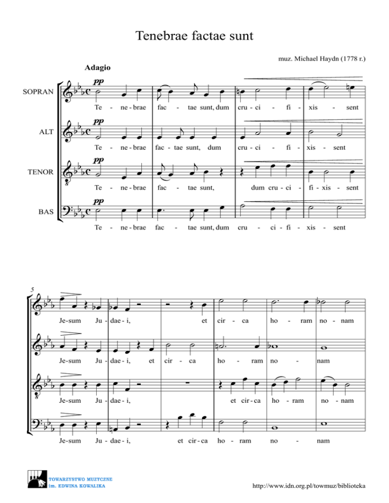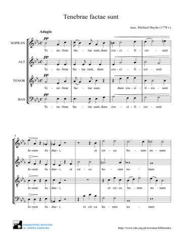 Tenebrae factae sunt muz. Michael Haydn (1778 r.) ° b pp SOPRAN & b b c ˙ Adagio Te ALT pp b & b bc ˙ Te b & b bc ˙ ‹ Te - - pp TENOR ?bc˙ BAS ¢ bb - pp Te - œ œ J fac - œ œ œ j œ œ ne - brae ne - brae œ œ j œ œ œ œ œ™ ne - brae fac ne - brae fac 5 b &b b œ œ Œ œ œ œ Ó ‹ Je - sum Ju - dae - i, ?b œ œ Œ œ nœ œ Ó ¢ bb Je - sum - Ó Ju - dae - i, cru - ci tae sunt, dum cir - ca ∑ ˙ fi - xis œ ˙ fi - xis cru - n˙ ™ ho - ram no - ˙ - ho - ram ho - ram w no sent œ - sent ˙ ram no - nam œ ˙ Œ œ œ œ œ et cir - ca ˙ ˙ œ b˙ œ bw - - sent fi - xis - sent ci - fi - xis ho - ˙ ˙™ ˙ nœ œ ˙ œ œ cir - ca œ œ œ ˙ Œ et cir - ca - œ ˙ œ œ Œ œ Œ œ ˙ ˙ - œ dum cru - ci œ œ œ J et et œ ˙ tae sunt, Ju - dae - i, Ju - dae - i, œ cru - ci j œ œ Œ - b &b b œ œ Œ œ œ œ Œ œ ˙ Je - sum tae sunt, dum fac - tae sunt, dum ° b œ & b b œ Œ bœ bœ œ Ó Je - sum j œ œ œ nœ ˙ œ œ w nam œ œ ˙ no - nam w - nam http://www.idn.org.pl/towmuz/biblioteka ° b œ œ œ œ ˙ &b b 2 11 ex - cla - ma - vit Je - sus f b &b b œ œ œ œ ˙ ex - cla - ma - vit ˙ - sus vo ? bb œ œ œ œ ˙ ¢ b dim. quid b Œ b & b ˙ me - ce ˙ - ce n˙ ™ - vo - ce ce de - re - li - quis b Œ œ -œ dim. b œ œ b˙ & b ‹ ut quid me de - re -œ dim. œ ?b ¢ bb œ œ œ œ b˙ ˙ mag - na: ˙™ de - re - li - qui "De - us me œ ˙ "De - f us ˙ - sti?" Et in œ p U œ nœ ˙ ˙ Œ œ U ˙ Ó ti?" U p ˙ ˙ sti?" Et in us, - us, ˙ "De - us Et œ Œ - me ˙ ˙ - us, ut œ œ™ œ œ Œ J f ˙ - - ˙- œ ti?" me ˙ p œ œ ˙ nœ œ œ ˙ us U ˙ Ó - - li - quis œ Ó - f mag - na: œ œ ff de - re - li - qui ut quid me mag - na: "De œ œ œ Ó bœ ˙ nœ n˙ ™ bœ œ- œ ˙ mag - na: bœ bœ œ Ó ˙™ Je - sus dim. ut quid me vo ff f 17 ˙™ œ ˙ nœ nœ ™ œ œ J œ f œ œ œ Ó ff ˙ f ° b & b b ˙- vo Je - sus b œ œ œ ˙ &b b œ ‹ ex - cla - ma - vit Je ex - cla - ma - vit b˙ ™ ff ˙ f me - us, ˙ - ˙ cli - na - bœ #œ ˙ - œ Œ cli - na - nœ to Œ œ œ œ nœ œ œ bœ p Et in - œ œ ˙ in - cli - na - œ œ ˙ cli - na - http://www.idn.org.pl/towmuz/biblioteka ° b &b b ˙ 23 to b &b b œ™ b˙ ca œ ˙ ca - ca ∑ œ œ j œ ‰ ˙ œ ˙™ b & b b ˙™ ‹ spi ?b ¢ bb w spi - - - sit - - œ Ó ˙ Œ spi spi - - œ œ ˙ pp œ e ˙ - - - - - ˙ pp œ - ˙ ri - - œ w ri - tum. w - - mi - œ - sit œ #œ ‰ nœ œ ‰ J J œ - œ mi - ˙ - j œ nœ ‰ bœ œj ‰ œ e œ pi - te b j & b b œ #œ ‰ nœ sit Ó ˙ œ œ j œ ‰ 27 mi Ó pp pi - te - œ e ° b j & b b œ nœ ‰ bœ - Œ pi - te ?b ¢ bb œ œ ˙ mi Ó e w b b & bœ œ œ œ ‹ - to ca to ∑ pi - te œ - j bœ ˙ 3 pp œ - - sit œ U w œ U w ri - tum. ri - tum. U w U w tum. http://www.idn.org.pl/towmuz/biblioteka f ° b œ œ œ ˙ &b b Œ ˙ f b &b b Œ œ œ œ ˙ ˙ 4 31 Œ ˙ Ex - cla - mans Je - sus vo - ce Œ Ex - cla - mans Je - sus sf b &b b Œ œ œ œ ˙ ‹ Ex - cla - mans Je ? b Œ bœ œ œ b˙ ¢ bb sf ° b w &b b "Pa b & b b #w "Pa ˙ n˙ - ˙ b & b b ˙™ ‹ "Pa ?b w ¢ bb "Pa - ter, ˙ ter, Ó Tu Œ œ ˙ in ˙ - Œ œ œ nœ ˙™ ˙ ˙ in ma ˙ w - a - it: Ó ˙ - - it: Ó ˙ it: ˙™ œ œ œ œ nœ as spi ˙ ma - nus com - men - do Tu - Tu ˙ ˙ ˙ ˙ nus Tu as com - œ as com - men in ma - nus - œ - j ™ œ ™ œ œ œ n˙ Œ œ œ nœ ˙™ - œ œ ˙ decresc. mf ∑ p a Ó it: - w ma - gna mf - a ˙ œ ˙ ˙ w ma - gna vo - ce in ma - nus ˙ œ ˙ Œ ˙ a ma - gna vo - ce ˙ ter, œ ˙ ˙ œ Œ ˙ - sus Ó w - mf ter, ˙ bw ˙ ma - gna vo - ce Ex - cla - mans Je - sus 37 œ ˙ - do decresc. œ œ œ œ œ as com - men - do ˙ - men - ˙ do http://www.idn.org.pl/towmuz/biblioteka ° b œ œ œ œ nœ nœnœ ˙ &b b pp 43 - ri - tum me b &b b ˙ - œ œ w spi - ri - tum me b ˙ b & b ‹ spi ?b ˙ ¢ bb œ œ w ° b <b>œ ™ &b b 49 um." um." Et U ˙ Ó - pp spi - ri - tum me b &b b - œ œ pp w - ri - tum me U ˙ Ó ˙ ˙ Et in p U ˙ Œ œ nœ ˙ pp - in ˙ - ˙ cli - na bœ #œ ˙ - cli - na - - Et in U p ˙ ˙ œ œ ˙ um." Et in ∑ to to ca ca - - cli - na œ œ ˙ cli - na Ó - - Œ ∑ to œ pi œ pi - - ˙ te ˙ te Ó œ pi - ca - œ œ ˙ to ca Ó Œ pp œ œ e - mi pp œ œ - mi œ œ e j nœ ‰ bœ - sit #œ ‰ nœ J - sit - pp œ - pp œ e Ó - - e te ?b ¢ bb œ b˙ nœ œ ˙ pi - te w b &b b œ ‹ - ˙ p Œ œ œ œ nœ œ œ bœ œ œ œ œ um." j bœ ˙ 5 p Largo rit. - j œ ‰ œ ‰ J http://www.idn.org.pl/towmuz/biblioteka ° b j b œ nœ ‰ bœ & b j œ ‰ b j & b b œ #œ ‰ nœ j ‰ œ ˙ - sit 6 52 - b & b b ˙™ ‹ spi ?b ¢ bb w spi mi - - mi - - - - œ œ sit ˙ spi spi - ˙ ˙ - ˙ ˙™ - - œ œ - - ri - ˙ ri - œ w tum. w - œ - œ - œ - œ U w œ U w ri - tum. U w ri - tum. U w tum. http://www.idn.org.pl/towmuz/biblioteka