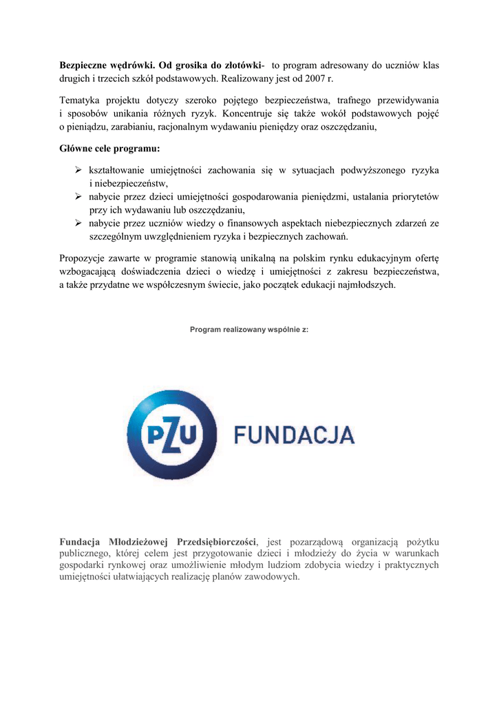 Bezpieczne wędrówki. Od grosika do złotówki- to program adresowany do uczniów klas drugich i trzecich szkół podstawowych. Realizowany jest od 2007 r. Tematyka projektu dotyczy szeroko pojętego bezpieczeństwa, trafnego przewidywania i sposobów unikania różnych ryzyk. Koncentruje się także wokół podstawowych pojęć o pieniądzu, zarabianiu, racjonalnym wydawaniu pieniędzy oraz oszczędzaniu, Główne cele programu: kształtowanie umiejętności zachowania się w sytuacjach podwyższonego ryzyka i niebezpieczeństw, nabycie przez dzieci umiejętności gospodarowania pieniędzmi, ustalania priorytetów przy ich wydawaniu lub oszczędzaniu, nabycie przez uczniów wiedzy o finansowych aspektach niebezpiecznych zdarzeń ze szczególnym uwzględnieniem ryzyka i bezpiecznych zachowań. Propozycje zawarte w programie stanowią unikalną na polskim rynku edukacyjnym ofertę wzbogacającą doświadczenia dzieci o wiedzę i umiejętności z zakresu bezpieczeństwa, a także przydatne we współczesnym świecie, jako początek edukacji najmłodszych. Program realizowany wspólnie z: Fundacja Młodzieżowej Przedsiębiorczości, jest pozarządową organizacją pożytku publicznego, której celem jest przygotowanie dzieci i młodzieży do życia w warunkach gospodarki rynkowej oraz umożliwienie młodym ludziom zdobycia wiedzy i praktycznych umiejętności ułatwiających realizację planów zawodowych. Działania podejmowane w ramach programu Bezpieczne wędrówki. Od grosika do złotówki mają na celu rozbudzenie ciekawości poznawczej uczniów oraz kształtowanie przez nich praktycznych umiejętności w miłej, opartej na zabawie atmosferze. Dzieci wykonują zadania o różnym stopniu trudności, a w efekcie rozwijają samodzielność w podejmowaniu decyzji wpływających na ich bezpieczeństwo oraz finanse, umacniają wiarę we własne siły i możliwości. Realizacja projektu trwa 10 miesięcy (klasa druga: styczeń-czerwiec, klasa trzecia: wrzesień-grudzień). Uczniowie odbywają podróż z przewodnikiem Grosikiem po Galaktyce Finanse i Galaktyce Oszczędzanie, w czasie której zdobywają określone w danym miesiącu umiejętności. Każdy z uczniów otrzymuje własny „Dziennik podróży”, w którym dokumentuje realizację poszczególnych zadań. Wdrażanie programu, jest również podstawą do wspólnych działań rodziców i nauczycieli w trosce o bezpieczeństwo i rozwój edukacji finansowej dziecka. Dzieci wracają do domu i proszą opiekunów o rozmowę na temat związany z treścią zajęć, umieszczony na naklejce, którą otrzymują, np. „Porozmawiaj ze mną o tym, jak bezpiecznie bawić się w domu i na dworze”. W trakcie podróży jest też czas, w którym rodzice pełnią rolę konsultantów i w ciągu 14 dni dokonują analizy, w jakiej dziedzinie ich dziecko oszczędza najlepiej. Wnioski z tych obserwacji stanowią bazę do dalszej pracy nauczyciela i uczniów. Podróżując po Galaktyce Oszczędzania opracowują strategie działań, aby nie dać się wciągnąć do czarnej dziury, która pochłania wszystkie finanse. Tematyka bezpieczeństwa podsumowywana jest przez dzieci i rodziców na tzw. Karcie bezpieczeństwa, na której dzieci zamieszczają naklejki informujące o rozmowach i działaniach podejmowanych w kolejnych miesiącach w szkole i w domu. Materiały W ramach realizacji programu przygotowany został bogaty pakiet materiałów dla nauczycieli, uczniów i rodziców.