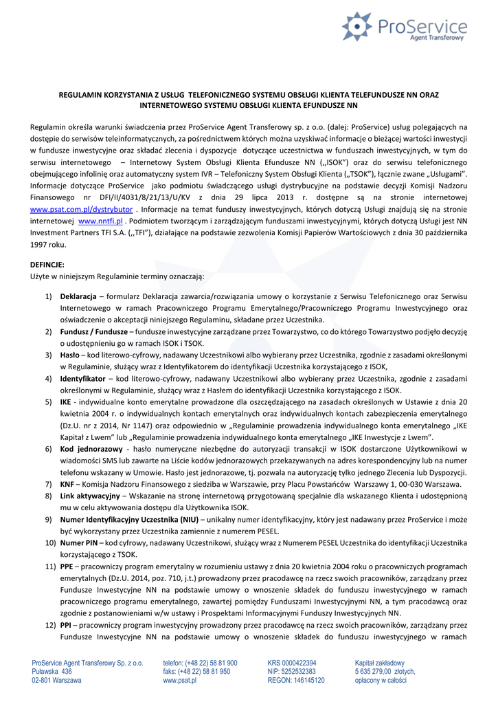 REGULAMIN KORZYSTANIA Z USŁUG TELEFONICZNEGO SYSTEMU OBSŁUGI KLIENTA TELEFUNDUSZE NN ORAZ INTERNETOWEGO SYSTEMU OBSŁUGI KLIENTA EFUNDUSZE NN Regulamin określa warunki świadczenia przez ProService Agent Transferowy sp. z o.o. (dalej: ProService) usług polegających na dostępie do serwisów teleinformatycznych, za pośrednictwem których można uzyskiwać informacje o bieżącej wartości inwestycji w fundusze inwestycyjne oraz składać zlecenia i dyspozycje dotyczące uczestnictwa w funduszach inwestycyjnych, w tym do serwisu internetowego – Internetowy System Obsługi Klienta Efundusze NN (,,ISOK”) oraz do serwisu telefonicznego obejmującego infolinię oraz automatyczny system IVR – Telefoniczny System Obsługi Klienta („TSOK”), łącznie zwane „Usługami”. Informacje dotyczące ProService jako podmiotu świadczącego usługi dystrybucyjne na podstawie decyzji Komisji Nadzoru Finansowego nr DFI/II/4031/8/21/13/U/KV z dnia 29 lipca 2013 r. dostępne są na stronie internetowej www.psat.com.pl/dystrybutor . Informacje na temat funduszy inwestycyjnych, których dotyczą Usługi znajdują się na stronie internetowej www.nntfi.pl . Podmiotem tworzącym i zarządzającym funduszami inwestycyjnymi, których dotyczą Usługi jest NN Investment Partners TFI S.A. (,,TFI”), działające na podstawie zezwolenia Komisji Papierów Wartościowych z dnia 30 października 1997 roku. DEFINCJE: Użyte w niniejszym Regulaminie terminy oznaczają: 1) Deklaracja – formularz Deklaracja zawarcia/rozwiązania umowy o korzystanie z Serwisu Telefonicznego oraz Serwisu Internetowego w ramach Pracowniczego Programu Emerytalnego/Pracowniczego Programu Inwestycyjnego oraz oświadczenie o akceptacji niniejszego Regulaminu, składane przez Uczestnika. 2) Fundusz / Fundusze – fundusze inwestycyjne zarządzane przez Towarzystwo, co do którego Towarzystwo podjęło decyzję o udostępnieniu go w ramach ISOK i TSOK. 3) Hasło – kod literowo-cyfrowy, nadawany Uczestnikowi albo wybierany przez Uczestnika, zgodnie z zasadami określonymi w Regulaminie, służący wraz z Identyfikatorem do identyfikacji Uczestnika korzystającego z ISOK, 4) Identyfikator – kod literowo-cyfrowy, nadawany Uczestnikowi albo wybierany przez Uczestnika, zgodnie z zasadami określonymi w Regulaminie, służący wraz z Hasłem do identyfikacji Uczestnika korzystającego z ISOK. 5) IKE - indywidualne konto emerytalne prowadzone dla oszczędzającego na zasadach określonych w Ustawie z dnia 20 kwietnia 2004 r. o indywidualnych kontach emerytalnych oraz indywidualnych kontach zabezpieczenia emerytalnego (Dz.U. nr z 2014, Nr 1147) oraz odpowiednio w „Regulaminie prowadzenia indywidualnego konta emerytalnego „IKE Kapitał z Lwem” lub „Regulaminie prowadzenia indywidualnego konta emerytalnego „IKE Inwestycje z Lwem”. 6) Kod jednorazowy - hasło numeryczne niezbędne do autoryzacji transakcji w ISOK dostarczone Użytkownikowi w wiadomości SMS lub zawarte na Liście kodów jednorazowych przekazywanych na adres korespondencyjny lub na numer telefonu wskazany w Umowie. Hasło jest jednorazowe, tj. pozwala na autoryzację tylko jednego Zlecenia lub Dyspozycji. 7) KNF – Komisja Nadzoru Finansowego z siedziba w Warszawie, przy Placu Powstańców Warszawy 1, 00-030 Warszawa. 8) Link aktywacyjny – Wskazanie na stronę internetową przygotowaną specjalnie dla wskazanego Klienta i udostępnioną mu w celu aktywowania dostępu dla Użytkownika ISOK. 9) Numer Identyfikacyjny Uczestnika (NIU) – unikalny numer identyfikacyjny, który jest nadawany przez ProService i może być wykorzystany przez Uczestnika zamiennie z numerem PESEL. 10) Numer PIN – kod cyfrowy, nadawany Uczestnikowi, służący wraz z Numerem PESEL Uczestnika do identyfikacji Uczestnika korzystającego z TSOK. 11) PPE – pracowniczy program emerytalny w rozumieniu ustawy z dnia 20 kwietnia 2004 roku o pracowniczych programach emerytalnych (Dz.U. 2014, poz. 710, j.t.) prowadzony przez pracodawcę na rzecz swoich pracowników, zarządzany przez Fundusze Inwestycyjne NN na podstawie umowy o wnoszenie składek do funduszu inwestycyjnego w ramach pracowniczego programu emerytalnego, zawartej pomiędzy Funduszami Inwestycyjnymi NN, a tym pracodawcą oraz zgodnie z postanowieniami w/w ustawy i Prospektami Informacyjnymi Funduszy Inwestycyjnych NN. 12) PPI – pracowniczy program inwestycyjny prowadzony przez pracodawcę na rzecz swoich pracowników, zarządzany przez Fundusze Inwestycyjne NN na podstawie umowy o wnoszenie składek do funduszu inwestycyjnego w ramach ProService Agent Transferowy Sp. z o.o. Puławska 436 02-801 Warszawa telefon: (+48 22) 58 81 900 faks: (+48 22) 58 81 950 www.psat.pl KRS 0000422394 NIP: 5252532383 REGON: 146145120 Kapitał zakładowy 5 635 279,00 złotych, opłacony w całości 13) 14) 15) 16) 17) pracowniczego programu inwestycyjnego, zawartej pomiędzy Funduszami Inwestycyjnymi NN, a tym pracodawcą oraz zgodnie z postanowieniami Prospektów Informacyjnych Funduszy Inwestycyjnych NN. Rejestry – rejestry Uczestnika prowadzone przez ProService na zlecenie Funduszy Inwestycyjnych NN, w tym IKE, PPE, PPI jak również rejestry zwykłe prowadzone na zasadach ogólnych w szczególnych przypadkach określnych w regulaminie PPI. Uczestnik – osoba fizyczna bądź osoba prawna będąca Uczestnikiem Funduszy Inwestycyjnych NN, w szczególności osoba, która przystąpiła do pracowniczego programu emerytalnego lub pracowniczego programu inwestycyjnego oraz osoba oszczędzająca na indywidualnym koncie emerytalnym. Użytkownik – osoba posiadająca Identyfikator i Hasło, która ma, na podstawie Umowy nabyła uprawnienia do korzystania z ISOK. Użytkownikiem może być tylko Uczestnik. Test odpowiedniości – test badający odpowiedniość inwestycji w Jednostki Uczestnictwa Funduszy przez Klienta/Uczestnika, przy uwzględnieniu jego wiedzy i doświadczenia w zakresie inwestowania w te instrumenty finansowe. Zgodnie z Rozporz