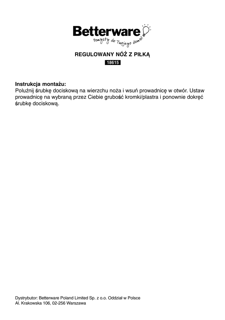 Regulowany nóż z piłką 18615 Instrukcja montażu: Poluźnij śrubkę dociskową na wierzchu noża i wsuń prowadnicę w otwór. Ustaw prowadnicę na wybraną przez Ciebie grubość kromki/plastra i ponownie dokręć śrubkę dociskową. Dystrybutor: Betterware Poland Limited Sp. z o.o. Oddział w Polsce Al. Krakowska 106, 02-256 Warszawa
