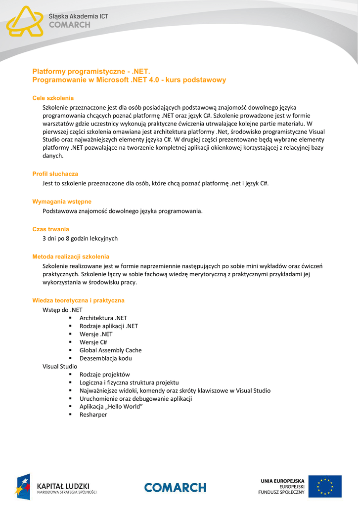 Platformy programistyczne - .NET. Programowanie w Microsoft .NET 4.0 - kurs podstawowy Cele szkolenia Szkolenie przeznaczone jest dla osób posiadających podstawową znajomość dowolnego języka programowania chcących poznać platformę .NET oraz język C#. Szkolenie prowadzone jest w formie warsztatów gdzie uczestnicy wykonują praktyczne ćwiczenia utrwalające kolejne partie materiału. W pierwszej części szkolenia omawiana jest architektura platformy .Net, środowisko programistyczne Visual Studio oraz najważniejszych elementy języka C#. W drugiej części prezentowane będą wybrane elementy platformy .NET pozwalające na tworzenie kompletnej aplikacji okienkowej korzystającej z relacyjnej bazy danych. Profil słuchacza Jest to szkolenie przeznaczone dla osób, które chcą poznać platformę .net i język C#. Wymagania wstępne Podstawowa znajomość dowolnego języka programowania. Czas trwania 3 dni po 8 godzin lekcyjnych Metoda realizacji szkolenia Szkolenie realizowane jest w formie naprzemiennie następujących po sobie mini wykładów oraz ćwiczeń praktycznych. Szkolenie łączy w sobie fachową wiedzę merytoryczną z praktycznymi przykładami jej wykorzystania w środowisku pracy. Wiedza teoretyczna i praktyczna Wstęp do .NET Architektura .NET Rodzaje aplikacji .NET Wersje .NET Wersje C# Global Assembly Cache Deasemblacja kodu Visual Studio Rodzaje projektów Logiczna i fizyczna struktura projektu Najważniejsze widoki, komendy oraz skróty klawiszowe w Visual Studio Uruchomienie oraz debugowanie aplikacji Aplikacja „Hello World” Resharper Wstęp do programowania w C# Komentarze, regiony Typy podstawowe Operatory Metody Tablice Pętle Instrukcje warunkowe Typy danych Typy generyczne Wnioskowanie typu (var) Typy wyliczeniowe Wstęp do obiektowości Klasy Struktury Konstruktory Pola Właściwości Zdarzenia Polimorfizm Delegaty Metody anonimowe Indeksery Interfejsy LINQ Metody rozszerzające Wyrażenia lambda LINQ to Objects LINQ to XML Wybrane elementy platformy .Net Zasoby, ustawienia, lokalizowanie aplikacji Obsługa IO (system plików, sieć) Serializacja (binarna, XML, JSON) Aplikacje okienkowe (WPF) Data Binding Wzorzec Model-View-ViewModel Komunikacja z relacyjną bazą danych (Entity Framework) Umiejętności Wiedza zdobyta podczas kursu pozwoli uczestnikom na tworzenie aplikacji w języku C# działających na platformie .NET. W szczególności aplikacji okienkowych korzystających z relacyjnej bazy danych. Ścieżka rozwoju Po zakończeniu szkolenia rekomendowane jest skorzystanie z: • szkolenie „Programowanie w Microsoft .NET 4.0 - kurs zaawansowany”
