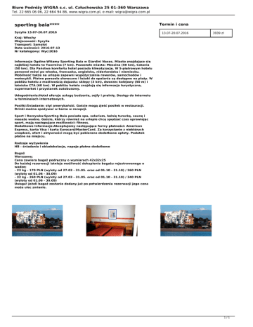 Biuro Podróży WIGRA s.c. ul. Człuchowska 25 01-360 Warszawa Tel. 22 665 06 06, 22 664 94 86, www.wigra.com.pl, e-mail: [email protected] sporting baia**** Sycylia 13.07-20.07.2016 Termin i cena 13.07-20.07.2016 3939 zł Kraj: Włochy Miejscowość: Sycylia Transport: Samolot Data ważności: 2016-07-13 Nr katalogowy: Wyc/2016 Informacje Ogólne:Witamy Sporting Baia w Giardini Naxos. Miasto znajdujące się najbliżej hotelu to Taormina (7 km). Pozostałe miasta: Messina (50 km), Catania (50 km). Dla Państwa komfortu hotel posiada klimatyzację. W 5-piętrowym hotelu personel mówi po włosku, francusku, angielsku, niderlandzku i niemiecku. Mobilność także na urlopie zapewni wypożyczalnia rowerów, samochodów i motocykli. Płatne parasole słoneczne i leżaki do opalania są dostępne na plaży. W pobliżu hotelu z możliwością dojazdu: sklepy (3 km), dworzec kolejowy (50 m) i lotnisko CTA (60 km). W pobliżu hotelu znajdują się informacja turystyczna, supermarket i przystanek autobusowy. Udogodnienia:Hotel oferuje usługę budzenia, sejfy i pralnię. Dostęp do Internetu w terminalach internetowych. Posiłki:Śniadanie: styl amerykański. Goście mogą zjeść posiłek w restauracji. Drinki można spożywać w barze w recepcji. Sport i Rozrywka:Sporting Baia posiada spa, solarium, łaźnię turecką, saunę i masaże wodne. Goście, którzy również na urlopie chcą spędzać czas uprawiając sport, mają następujące możliwości: fitness. Dodatkowe Informacje:Akceptujemy następujące formy płatności: American Express, karta Visa i karta Eurocard/MasterCard. Za korzystanie z niektórych urządzeń, ofert i aktywności mogą być pobierane dodatkowe opłaty. Podatek płatne na miejscu. Rodzaje wyżywienia HB - śniadania i obiadokolacje, napoje płatne dodatkowo Bagaż Warszawa; Cena zawiera bagaż podręczny o wymiarach 42x32x25 Do każdej rezerwacji istnieje możliwość dokupienia bagażu rejestrowanego o wadze; - 23 kg - 170 PLN (wyloty od 27.03 - 31.05. oraz od 01.10 - 31.10) / 260 PLN (wyloty od 01.06 - 30.09) - 32 kg - 260 PLN (wyloty od 27.03 - 31.05. oraz od 01.10 - 31.10) / 340 PLN (wyloty od 01.06 - 30.09) Uwaga! Jeżeli bagaż zostanie dodany już po potwierdzeniu rezerwacji jego cena może ulec zmianie. 1/1 Powered by TCPDF (www.tcpdf.org)