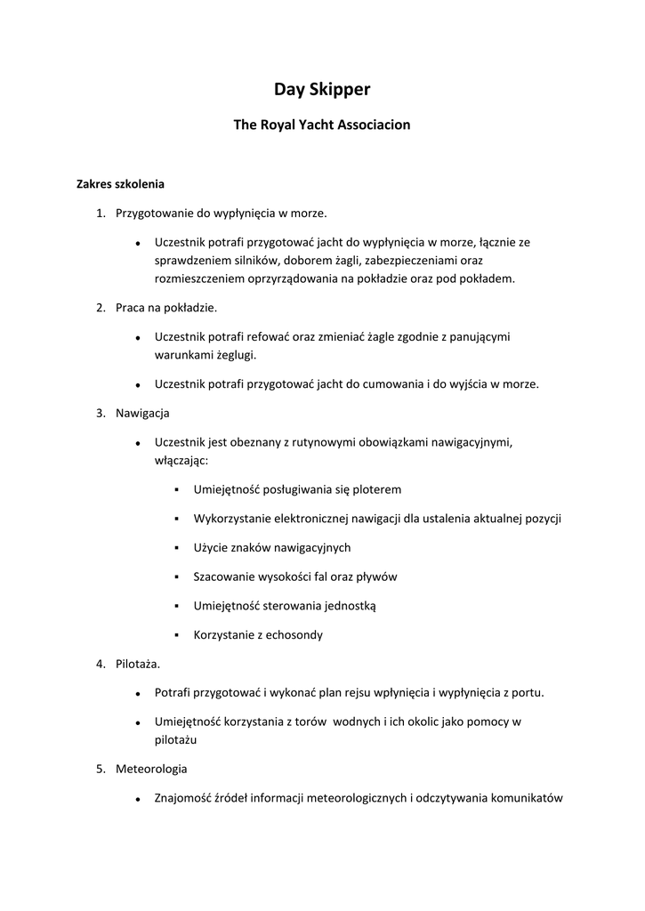 Day Skipper The Royal Yacht Associacion Zakres szkolenia 1. Przygotowanie do wypłynięcia w morze. Uczestnik potrafi przygotowad jacht do wypłynięcia w morze, łącznie ze sprawdzeniem silników, doborem żagli, zabezpieczeniami oraz rozmieszczeniem oprzyrządowania na pokładzie oraz pod pokładem. 2. Praca na pokładzie. Uczestnik potrafi refowad oraz zmieniad żagle zgodnie z panującymi warunkami żeglugi. Uczestnik potrafi przygotowad jacht do cumowania i do wyjścia w morze. 3. Nawigacja Uczestnik jest obeznany z rutynowymi obowiązkami nawigacyjnymi, włączając: Umiejętnośd posługiwania się ploterem Wykorzystanie elektronicznej nawigacji dla ustalenia aktualnej pozycji Użycie znaków nawigacyjnych Szacowanie wysokości fal oraz pływów Umiejętnośd sterowania jednostką Korzystanie z echosondy 4. Pilotaża. Potrafi przygotowad i wykonad plan rejsu wpłynięcia i wypłynięcia z portu. Umiejętnośd korzystania z torów wodnych i ich okolic jako pomocy w pilotażu 5. Meteorologia Znajomośd źródeł informacji meteorologicznych i odczytywania komunikatów Umiejętnośd interpretacji prognoz pogody oraz posługiwanie się barometrem 6. Kluczowe zasady Znajomośd zasad zapobiegania wypadkom na morzu 7. Prace konserwacyjne i naprawcze Umiejętnośd wykonywania czynności konserwacyjnych i naprawczych Znajomośd właściwości oraz zastosowania lin z włókien syntetycznych 8. Silnik Umiejętnośd wymiany filtrów paliwa i wody, pompy wirowej oraz odpowietrzenia układu paliwowego 9. Zaopatrzenie Umiejętnośd zaopatrzenia jachtu w prowiant i towary konieczne do rejsu 10. Nagłe sytuacje Naukę przeprowadzenia właściwie procedury „człowiek za burtą” Znajomośd zasad używania rakiet sygnalizacyjnych oraz korzystania z tratwy ratunkowej Naukę obsługi radiotelefonu w nagłych przypadkach I wysłania wiadomości SOS Dowiedzied się jak zabezpieczyd ładunek na pokładzie Zna procedury ratownicze w tym procedury ratowania przez śmigłowiec 11. Obsługa jachtu w trudnych warunkach Potrafi przycumowad jednostkę bezpiecznie do nabrzeża, boi cumowniczych lub stanąd na kotwicy w różnych warunkach pogodowych i hydrologicznych Potrafi skutecznie sterowad żaglami względem danego kursu 12. Podejście do nabrzeża Potrafi wykonad podejście do nabrzeża z uwzględnieniem niebezpieczeostw nawigacyjnych i ograniczeo nałożonych przez typ łodzi, oraz ocenid umiejętności załogi 13. Rejs nocny Uczestniczył w rejsie nocnym, potrafi wpłynąd i wypłynąd z portu. Rozumie szczególny sposób planowania, prowadzenia i identyfikacji znaków w porze nocnej. 14. Reakcja na chorobę morską i inne uciążliwości związane z pracą na jachcie 15. Sterowanie i żegluga Rozumie podstawowe zasady żeglowania. Potrafi sterowad i obsługiwad żagle w każdych warunkach żeglugi. Potrafi zachowad wyznaczony kursu jachtu pod żaglami oraz na silniku 16. Ogólne obowiązki umiejętnośd dostosowania się do warunków życia na jachcie i w codziennej obsłudze rejsu.