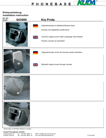 Einbauanleitung installation instruction Art.-Nr.: item# 043000 Kia Pride Originalschraube im Beifahrerfußraum lösen Konsole wie abgebildet positionieren Unscrew original screw within passenger side footwell Position console as illustrated Originalschraube durch die Konsole wieder eindrehen Reinstall original screw through console Änderungen vorbehalten Subject to change Kuda-Phonebase GmbH Industriestraße 16 D-49401 Damme tel: +49 5491 9695 -0 fax: +49 5491 9695 -30 eMail: [email protected] net: www.kuda-phonebase.de 07.06.2005 instrucciones de instalación Instructions d´ installation art: 043000 Kia Pride Desserrez la vis originale dans le plancher de passager Positionnez la console comme illustré Destornille el tornillo original en el espacio de pies del acompañante Posicione la consola como mostrado Vissez la vis orginale à travers la console Reinstale el tornillo original por la consola Nous nous réservons la possibilité de modification Salvo posibles modificaciones Kuda-Phonebase GmbH Industriestraße 16 D-49401 Damme tel: +49 5491 9695 -0 fax: +49 5491 9695 -30 eMail: [email protected] net: www.kuda-phonebase.de 07.06.2005 installatie instructie instrukcja montazu . art: 043000 Kia Pride Originele schroef in de voetenruimte van de passagier losdraaien Konsole zoals afgebeeld positioneren Odkrecic oryginalna srube przy skrzyni biegów od strony kierowcy Uchwyt umiescic jak na przedstawionym zdjeciu. Orginele schroef door de console heendraaien Srube przez konsole znowu wkrecic Nous nous réservons la possibilité de modification Salvo posibles modificaciones FormenArtikel Kuda-Phonebase GmbH Industriestraße 16 D-49401 Damme 04300X tel: +49 5491 9695 -0 fax: +49 5491 9695 -30 eMail: [email protected] net: www.kuda-phonebase.de 07.06.2005
