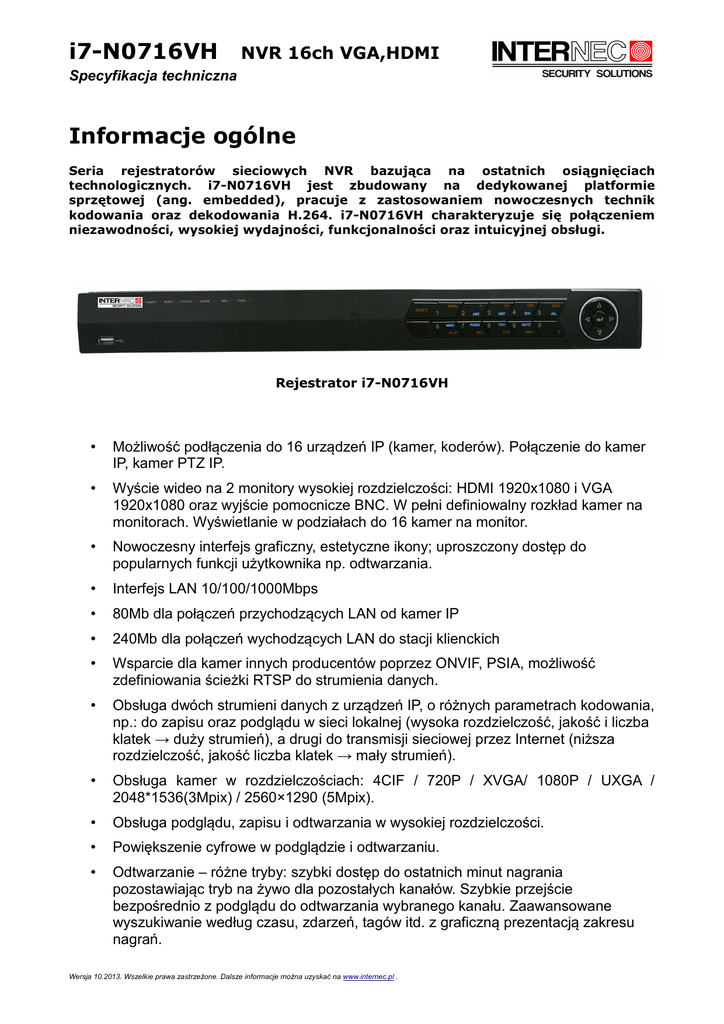 i7-N0716VH NVR 16ch VGA,HDMI Specyfikacja techniczna Informacje ogólne Seria rejestratorów sieciowych NVR bazująca na ostatnich osiągnięciach technologicznych. i7-N0716VH jest zbudowany na dedykowanej platformie sprzętowej (ang. embedded), pracuje z zastosowaniem nowoczesnych technik kodowania oraz dekodowania H.264. i7-N0716VH charakteryzuje się połączeniem niezawodności, wysokiej wydajności, funkcjonalności oraz intuicyjnej obsługi. Rejestrator i7-N0716VH • Możliwość podłączenia do 16 urządzeń IP (kamer, koderów). Połączenie do kamer IP, kamer PTZ IP. • Wyście wideo na 2 monitory wysokiej rozdzielczości: HDMI 1920x1080 i VGA 1920x1080 oraz wyjście pomocnicze BNC. W pełni definiowalny rozkład kamer na monitorach. Wyświetlanie w podziałach do 16 kamer na monitor. • Nowoczesny interfejs graficzny, estetyczne ikony; uproszczony dostęp do popularnych funkcji użytkownika np. odtwarzania. • Interfejs LAN 10/100/1000Mbps • 80Mb dla połączeń przychodzących LAN od kamer IP • 240Mb dla połączeń wychodzących LAN do stacji klienckich • Wsparcie dla kamer innych producentów poprzez ONVIF, PSIA, możliwość zdefiniowania ścieżki RTSP do strumienia danych. • Obsługa dwóch strumieni danych z urządzeń IP, o różnych parametrach kodowania, np.: do zapisu oraz podglądu w sieci lokalnej (wysoka rozdzielczość, jakość i liczba klatek → duży strumień), a drugi do transmisji sieciowej przez Internet (niższa rozdzielczość, jakość liczba klatek → mały strumień). • Obsługa kamer w rozdzielczościach: 4CIF / 720P / XVGA/ 1080P / UXGA / 2048*1536(3Mpix) / 2560×1290 (5Mpix). • Obsługa podglądu, zapisu i odtwarzania w wysokiej rozdzielczości. • Powiększenie cyfrowe w podglądzie i odtwarzaniu. • Odtwarzanie – różne tryby: szybki dostęp do ostatnich minut nagrania pozostawiając tryb na żywo dla pozostałych kanałów. Szybkie przejście bezpośrednio z podglądu do odtwarzania wybranego kanału. Zaawansowane wyszukiwanie według czasu, zdarzeń, tagów itd. z graficzną prezentacją zakresu nagrań. Wersja 10.2013. Wszelkie prawa zastrzeżone. Dalsze informacje można uzyskać na www.internec.pl . i7-N0716VH NVR 16ch VGA,HDMI Specyfikacja techniczna • Odtwarzanie - funkcje: jedno i wielokamerowe, w przód, wstecz, zwolnione, przyspieszone - duża prędkość przeglądania nagrań (aż do x16 dzięki algorytmowi odtwarzającemu tylko klatki kluczowe dla prędkości ponad x4). Dodawanie własnych znaczników na nagraniu tzw. tagów ułatwia późniejszy powrót do nagrania. Szybki backup nagrań na USB z poziomu odtwarzania. • Funkcja zrzutu zdjęć w trybach ręcznym na żywo i odtwarzaniu, a także automatycznym; wbudowana przeglądarka zdjęć. • Wsparcie dla myszy w sterowaniu PTZ, w tym tryb 3D - zaznaczając fragment obrazu kamera PTZ wykonuje zbliżenie optyczne fragmentu. • Tryb nagrywania ciągły bądź aktywowany zdarzeniem, określony harmonogramem, oddzielnie definiowalny dla każdego kanału. • Parametry: rozdzielczość, ilość klatek, przepływność bitowa oraz jakość obrazu oddzielnie definiowalne dla każdej kamery • Definiowanie oddzielnych parametrów dla zapisu ciągłego oraz dla zapisu alarmowego. • 4 wejcia alarmowe / 2 wyjścia alarmowe. Możliwość powiązania wejść alarmowych z szeregiem reakcji np. wywołanie zapisu z dowolnej kamery, pozycjonowanie kamery PTZ itp. Wyjścia alarmowe mogą informować o błędach i alarmach systemowych np. uszkodzenie dysku, utrata obrazu z kamery, itp. • Obudowa typu Rack 1U, miejsce na 2 dyski SATA. • Obsługa S.M.A.R.T., standby i pre-alokacji dla HDD, obsługa dysków SATA o pojemności do 4TB każdy. Możliwość łączenia dysków w grupy, przydziału dysków dla poszczególnych kamer, ustalenia limitów pojemności dla zapisu danego kanału. • Szeroki zakres diagnostyki z poziomu menu, informacje o zajętości sieci dla połączeń przychodzących oraz wychodzących. • Własny serwer DDNS umożliwia ułatwia konfigurację połączenia zdalnego w lokalizacjach o zmiennym IP (np. przez Neostradę, Dialnet itp.) • Protokoły TCP/IP: IPv6, PPPoE, DHCP, DNS, DDNS, NTP, SADP, SMTP, SNMP, NFS, UPnP™, iSCSI. • Możliwość pełnej obsługi rejestratorów przez sieć TCP/IP, w pakiecie zaawansowane oprogramowanie typu CMS: i7-VMS PL bez limitu stanowisk. • Oprogramowanie na urządzenia mobilne i7-MVS PL. Wersja 10.2013. Wszelkie prawa zastrzeżone. Dalsze informacje można uzyskać na www.internec.pl . i7-N0716VH NVR 16ch VGA,HDMI Specyfikacja techniczna Informacje podstawowe • • • • • • Do 16 urządzeń sieciowych IP (kamer, koderów). Możliwość podłączenia kamer IP innych producentów, kamer PTZ IP, koderów wideo IP. Możliwość zapisu strumienia wideo, lub wideo + audio, definiowalna oddzielnie dla każdego kanału. Każdy kanał obsługuje dwu-strumieniowość. Niezależna konfiguracja dla każdego kanału, w tym rozdzielczość, liczba klatek na sekundę, przepływność bitowa, jakość obrazu. Definiowalne ustawienia parametrów wyświetlania na monitorach Praca na monitorach lokalnych • • • • • • • • • Jednoczesne wyświetlanie na żywo na wyjściach HDMI, VGA i CVBS. Możliwość jednoczesnego wyświetlania na żywo i odtwarzania na wyjściach HDMI i VGA. Na wyjściach VGA i HDMI rozdzielczość do 1920x1080px. Podziały dla wyświetlania na żywo 1/4/6/8/9/16, z możliwością przełączania automatycznego. Obsługiwane przełączanie grup obrazów na żywo w trybie ręcznym i automatycznym z definiowalnym czasem sekwencji. Szybki dostęp do menu ustawień z trybu na żywo. Wybrane kanały mogą zostać wyłączone z podglądu na żywo – ukryte. Ikona informująca o alarmach dla detekcji ruchu, sabotażu, błędów wideo, utraty połączenia. Maski prywatności. Obsługa PTZ, sterowanie, presety, wywoływanie tras i patroli. Tryb powiększania zaznaczonego obszaru przy sterow