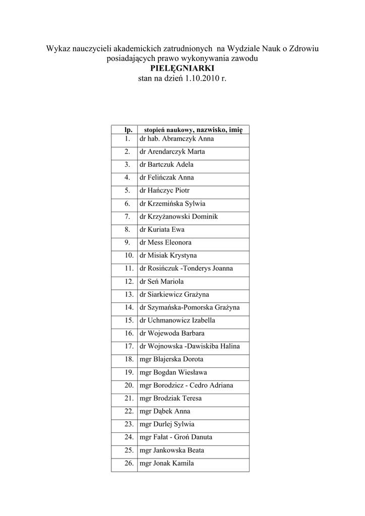 Wykaz nauczycieli akademickich zatrudnionych na Wydziale Nauk o Zdrowiu posiadających prawo wykonywania zawodu PIELĘGNIARKI stan na dzień 1.10.2010 r. lp. stopień naukowy, nazwisko, imię 1. dr hab. Abramczyk Anna 2. dr Arendarczyk Marta 3. dr Bartczuk Adela 4. dr Felińczak Anna 5. dr Hańczyc Piotr 6. dr Krzemińska Sylwia 7. dr Krzyżanowski Dominik 8. dr Kuriata Ewa 9. dr Mess Eleonora 10. dr Misiak Krystyna 11. dr Rosińczuk -Tonderys Joanna 12. dr Seń Mariola 13. dr Siarkiewicz Grażyna 14. dr Szymańska-Pomorska Grażyna 15. dr Uchmanowicz Izabella 16. dr Wojewoda Barbara 17. dr Wojnowska -Dawiskiba Halina 18. mgr Blajerska Dorota 19. mgr Bogdan Wiesława 20. mgr Borodzicz - Cedro Adriana 21. mgr Brodziak Teresa 22. mgr Dąbek Anna 23. mgr Durlej Sylwia 24. mgr Fałat - Groń Danuta 25. mgr Jankowska Beata 26. mgr Jonak Kamila 27. mgr Juzwiszyn Jan 28. mgr Klisowska Iwona 29. mgr Kolasińska Jolanta 30. mgr Kraińska Agnieszka 31. mgr Król Anna 32. mgr Krysa Marzena 33. mgr Kuriata-Kowalska Krystyna 34. mgr Lewicka-Rabska Agnieszka 35. mgr Lisowska Aleksandra 36. mgr Michalak Monika 37. mgr Ośmiałowska Edyta 38. mgr Pięta Elżbieta 39. mgr Pilarczyk-Wróblewska Iwona 40. mgr Przestrzelska Monika 41. mgr Rozensztrauch Anna 42. mgr Salik Katarzyna 43. mgr Staniszewska Jadwiga 44. mgr Stodolak Anna 45. mgr Strama Agnieszka 46. mgr Szynal Wioletta 47. mgr Trebenda Małgorzata Teresa 48. mgr Twardak Iwona 49. mgr Twardak Jerzy 50. mgr Witko Danuta 51. mgr Zborowska Iwona 52. mgr Żerkowska Urszula Wykaz nauczycieli akademickich zatrudnionych na Wydziale Nauk o Zdrowiu posiadających prawo wykonywania zawodu POŁOŻNEJ stan na dzień 1.10.2010 r. Lp. stopień naukowy, nazwisko, imię 1. dr Knihinicka-Mercik Zdzisława 2. mgr Jaros Anna 3. mgr Kawecka-Janik Elżbieta 4. mgr Korzeniewska Elżbieta 5. mgr Madej Marzena 6. mgr Mirska Barbara 7. mgr Przestrzelska Monika 8. mgr Skórzewska Agnieszka 9. mgr Stodolak Anna 10. mgr Strama Agnieszka 11. mgr Szostkowska Maria 12. mgr Szynal Wioletta 13. mgr Targosz Halina 14. mgr Terpiłowska Marzena 15. mgr Żebracka-Górniak Małgorzata