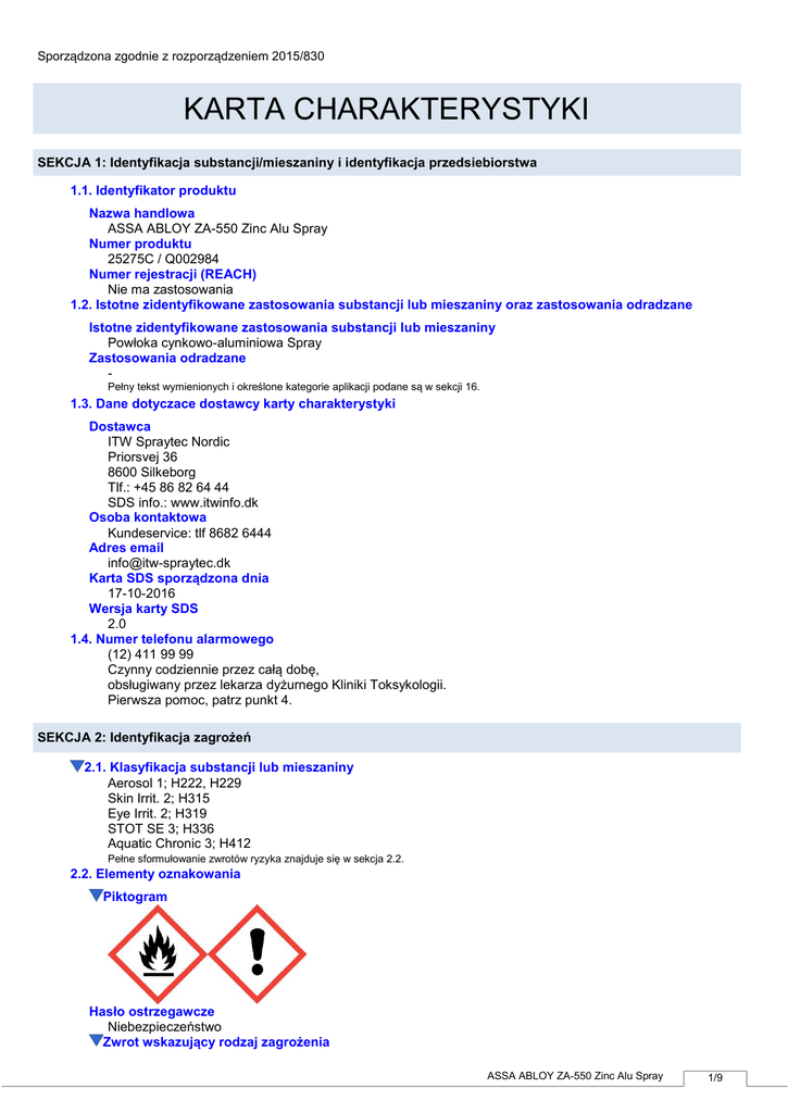 Sporządzona zgodnie z rozporządzeniem 2015/830 KARTA CHARAKTERYSTYKI SEKCJA 1: Identyfikacja substancji/mieszaniny i identyfikacja przedsiebiorstwa 1.1. Identyfikator produktu Nazwa handlowa ASSA ABLOY ZA-550 Zinc Alu Spray Numer produktu 25275C / Q002984 Numer rejestracji (REACH) Nie ma zastosowania 1.2. Istotne zidentyfikowane zastosowania substancji lub mieszaniny oraz zastosowania odradzane Istotne zidentyfikowane zastosowania substancji lub mieszaniny Powłoka cynkowo-aluminiowa Spray Zastosowania odradzane Pełny tekst wymienionych i określone kategorie aplikacji podane są w sekcji 16. 1.3. Dane dotyczace dostawcy karty charakterystyki Dostawca ITW Spraytec Nordic Priorsvej 36 8600 Silkeborg Tlf.: +45 86 82 64 44 SDS info.: www.itwinfo.dk Osoba kontaktowa Kundeservice: tlf 8682 6444 Adres email [email protected] Karta SDS sporządzona dnia 17-10-2016 Wersja karty SDS 2.0 1.4. Numer telefonu alarmowego (12) 411 99 99 Czynny codziennie przez całą dobę, obsługiwany przez lekarza dyżurnego Kliniki Toksykologii. Pierwsza pomoc, patrz punkt 4. SEKCJA 2: Identyfikacja zagrożeń 2.1. Klasyfikacja substancji lub mieszaniny Aerosol 1; H222, H229 Skin Irrit. 2; H315 Eye Irrit. 2; H319 STOT SE 3; H336 Aquatic Chronic 3; H412 Pełne sformułowanie zwrotów ryzyka znajduje się w sekcja 2.2. 2.2. Elementy oznakowania Piktogram Hasło ostrzegawcze Niebezpieczeństwo Zwrot wskazujący rodzaj zagrożenia ASSA ABLOY ZA-550 Zinc Alu Spray 1/9 Sporządzona zgodnie z rozporządzeniem 2015/830 Skrajnie łatwopalny aerozol. (H222) Pojemnik pod ciśnieniem: Ogrzanie grozi wybuchem. (H229) Działa drażniąco na skórę. (H315) Działa drażniąco na oczy. (H319) Może wywoływać uczucie senności lub zawroty głowy. (H336) Działa szkodliwie na organizmy wodne, powodując długotrwałe skutki. (H412) Zwroty wskazujące środki ostrożności Ogólne Zapobieganie Przechowywać z dala od źródeł ciepła, gorących powierzchni, źródeł iskrzenia, otwartego ognia i innych źródeł zapłonu. Nie palić. (P210). Nie rozpylać nad otwartym ogniem lub innym źródłem zapłonu. (P211). Nie przekłuwać ani nie spalać, nawet po zużyciu. (P251). Unikać wdychania rozpylonej cieczy/mgły. (P261). Stosować wyłącznie na zewnątrz lub w dobrze wentylowanym pomieszczeniu (P271). Reagowanie Przechowywanie Chronić przed światłem słonecznym. Nie wystawiać na działanie temperatury przekraczającej 50 °C/122 °F. (P410+P412). Usuwanie Zawiera 2.3. Inne zagrożenia Produkt zawiera organiczny rozpuszczalnik. Wielokrotne wystawienie na działanie organicznych rozcieńczalników może spowodowań uszkodzenia systemu nerwowego i narządów wewnętrznych, np. wątroby i nerek. Informacje uzupełniające na etykiecie Inne VOC VOC-MAX: 600 g/l, VOC-limit (B/e): 840 g/l. SEKCJA 3: Skład/ informacja o składnikach 3.1/3.2. Substancje/ Mieszaniny NAZWA: NUMERY IDENTYFIKACYJNE: ZAWARTOŚĆ: CLP KLASYFIKACJA: UWAGA: NAZWA: NUMERY IDENTYFIKACYJNE: ZAWARTOŚĆ: CLP KLASYFIKACJA: NAZWA: NUMERY IDENTYFIKACYJNE: ZAWARTOŚĆ: CLP KLASYFIKACJA: UWAGA: NAZWA: NUMERY IDENTYFIKACYJNE: Butane (<0,1 % butadiene (203-450-8) CAS-nr: 106-97-8 WEr-nr: 203-448-7 Nr indeksowy: 601-004-00-0 25-40% Flam. Gas 1 H220 S propan CAS-nr: 74-98-6 WEr-nr: 200-827-9 Nr indeksowy: 601-003-00-5 25-40% Press. Gas H220 acetone CAS-nr: 67-64-1 WEr-nr: 200-662-2 Nr indeksowy: 606-001-00-8 10-15% Flam. Liq. 2, Eye Irrit. 2, STOT SE 3 H225, H319, H336, EUH066 SL UWAGA: xylene CAS-nr: 1330-20-7 WEr-nr: 215-535-7 Nr indeksowy: 601-022-00-9 10-15% Flam. Liq. 3, Acute tox. 4, Skin Irrit. 2 H226, H312, H315, H332 SL NAZWA: Hydrocarbons, C6, isoalkanes, <5% n-hexane ZAWARTOŚĆ: CLP KLASYFIKACJA: ASSA ABLOY ZA-550 Zinc Alu Spray 2/9 Sporządzona zgodnie z rozporządzeniem 2015/830 NUMERY IDENTYFIKACYJNE: ZAWARTOŚĆ: CLP KLASYFIKACJA: WEr-nr: 931-254-9 REACH-nr: 01-2119484651-34 5-10% Flam. Liq. 2, STOT SE 3, Asp. Tox. 1, Aquatic Chronic 2 H225, H304, H336, H411 NAZWA: NUMERY IDENTYFIKACYJNE: cynk CAS-nr: 7440-66-6 WEr-nr: 231-175-3 Nr indeksowy: 030-001-00-1 1-3% Aquatic Acute 1, Aquatic Chronic 1 H400, H410 ZAWARTOŚĆ: CLP KLASYFIKACJA: (*) Pełne sformułowanie zwrotów ryzyka znajduje się w sekcji 16. Wartości graniczne dotyczące higieny pracy wymienione są w sekcji 8, jeśli są dostępne. S = organiczny rozpuszczalnik. Inne informacje ATEmix(inhale, vapour) > 20 ATEmix(dermal) > 2000 Eye Cat. 2 Sum = Sum(Ci/S(G)CLi) = 1,192 - 1,788 Skin Cat. 2 Sum = Sum(Ci/S(G)CLi) = > 1 - 1,44 N chronic (CAT 3) Sum = Sum(Ci/M(chronic)i*25*0.1*10^CATi) = 5,504 - 8,256 N acute (CAT 1) Sum = Sum(Ci/M(acute)i*25) = 0,0384 - 0,0576 SEKCJA 4: Środki pierwszej pomocy 4.1. Opis środków pierwszej pomocy Ogólnie W razie wypadku: skontaktować się z lekarzem lub pogotowiem – zabrać ze sobą etykietę lub niniejszą kartę bezpieczeństwa. Lekarz może się zwrócić do Kliniki Medycyny Pracy i Środowiska w szpitalu. Jeśli objawy nie ustają, lub jeśli są wątpliwości co do stanu osoby poszkodowanej, trzeba się zwrócić po pomoc lekarską. Nigdy nie podawaj wody ani podobnych płynów osobie nieprzytomnej. Wdychanie Osobę należy umieścić na świeżym powietrzu i trzymać pod obserwacją. Kontakt ze skórą Należy usunąć zanieczyszczone ubranie i obuwie. Skórę, która weszła w kontakt z materiałem, należy umyć dokładnie wodą i mydłem. Można zastosować środki do czyszczenia skóry. NIE używać rozpuszczalników ani rozcieńczalników. Kontakt z oczami Usunąć ewentualne szkła kontaktowe. Natychmiast spłukać wodą (20-30 °C) przez przynajmniej 15 minut. Zawezwać lekarza. Połknięcia Dać osobie dużo płynu do picia i trzymać ją pod obserwacją. W przypadku złego samopoczucia: należy się natychmiast skontaktować z lekarzem i mieć przy sobie niniejszą kartę bezpieczeństwa lub etykietę produktu. Nie należy wywoływać wymiotów, jeśli lekarz tego nie zalecił. Ułożyć głowę nisko, tak, aby w razie wymiotów ich zawa