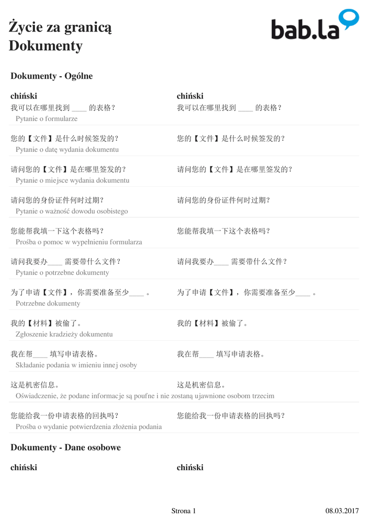 Życie za granicą Dokumenty Dokumenty - Ogólne chiński chiński 我可以在哪里找到 ____ 的表格? Pytanie o formularze 我可以在哪里找到 ____ 的表格? 您的【文件】是什么时候签发的? Pytanie o datę wydania dokumentu 您的【文件】是什么时候签发的? 请问您的【文件】是在哪里签发的? Pytanie o miejsce wydania dokumentu 请问您的【文件】是在哪里签发的? 请问您的身份证件何时过期? Pytanie o ważność dowodu osobistego 请问您的身份证件何时过期? 您能帮我填一下这个表格吗? Prośba o pomoc w wypełnieniu formularza 您能帮我填一下这个表格吗? 请问我要办____ 需要带什么文件? Pytanie o potrzebne dokumenty 请问我要办____ 需要带什么文件? 为了申请【文件】,你需要准备至少____ 。 Potrzebne dokumenty 为了申请【文件】,你需要准备至少____ 。 我的【材料】被偷了。 Zgłoszenie kradzieży dokumentu 我的【材料】被偷了。 我在帮____ 填写申请表格。 Składanie podania w imieniu innej osoby 我在帮____ 填写申请表格。 这是机密信息。 这是机密信息。 Oświadczenie, że podane informacje są poufne i nie zostaną ujawnione osobom trzecim 您能给我一份申请表格的回执吗? Prośba o wydanie potwierdzenia złożenia podania 您能给我一份申请表格的回执吗? Dokumenty - Dane osobowe chiński chiński Strona 1 08.03.2017 Życie za granicą Dokumenty 你叫什么名字? Pytanie o imię (imiona) i nazwisko 你叫什么名字? 您能告诉我您的出生日期和地点么? Pytanie o datę i miejsce urodzenia 您能告诉我您的出生日期和地点么? 请问您住在哪里? Pytanie o miejsce zamieszkania 请问您住在哪里? 请问您的地址是什么? Pytanie o adres zamieszkania 请问您的地址是什么? 请问您的国籍是什么? Pytanie o obywatelstwo 请问您的国籍是什么? 请问您是何时到达【该国】的? Pytanie o datę przybycia do danego kraju 请问您是何时到达【该国】的? 您能出示一下您的身份证件么? Prośba o okazanie dowodu osobistego 您能出示一下您的身份证件么? Dokumenty - Stan cywilny chiński chiński 我的婚姻状况是____ 。 Stan cywilny 我的婚姻状况是____ 。 单身 Stan cywilny 单身 已婚 Stan cywilny 已婚 分居 Stan cywilny 分居 离异 Stan cywilny 离异 Strona 2 08.03.2017 Życie za granicą Dokumenty 同居 Stan cywilny 同居 民事结婚 Stan cywilny 民事结婚 未婚伴侣 Stan cywilny 未婚伴侣 同居伴侣关系 Stan cywilny 同居伴侣关系 鳏居 Stan cywilny 鳏居 请问您有孩子吗? Dzieci 请问您有孩子吗? 请问有依靠您的财政资助的人和您住在一起吗 ? Osoby na utrzymaniu 请问有依靠您的财政资助的人和您住在一起吗? 我想要和家人团聚。 Łączenie rodzin 我想要和家人团聚。 Dokumenty - Meldunek chiński chiński 我想要在这个城市登记入户。 Meldunek 我想要在这个城市登记入户。 请问我应该带什么材料? Pytanie o wymagane dokumenty 请问我应该带什么材料? 请问有注册费吗? Koszt meldunku 请问有注册费吗? Strona 3 08.03.2017 Życie za granicą Dokumenty 我是来进行住址登记。 Zameldowanie na pobyt stały 我是来进行住址登记。 我想要申请一份无犯罪记录证明。 Zaświadczenie o niekaralności 我想要申请一份无犯罪记录证明。 我想要申请居住证。 Zezwolenie na pobyt stały 我想要申请居住证。 Dokumenty - Ubezpieczenie zdrowotne chiński chiński 我想要问一下关于保险的问题。 Pytanie o ubezpieczenie zdrowotne 我想要问一下关于保险的问题。 我需要私人的健康保险吗? Pytanie o prywatne ubezpieczenie zdrowotne 我需要私人的健康保险吗? 请问该保险涵盖哪些方面? Pytanie o ochronę ubezpieczeniową 请问该保险涵盖哪些方面? 住院费 Zakres ubezpieczenia 住院费 专家费 Zakres ubezpieczenia 专家费 诊疗费 Zakres ubezpieczenia 诊疗费 外科手术 Zakres ubezpieczenia 外科手术 精神治疗 Zakres ubezpieczenia 精神治疗 牙齿治疗 Zakres ubezpieczenia 牙齿治疗 Strona 4 08.03.2017 Życie za granicą Dokumenty 眼科治疗 Zakres ubezpieczenia 眼科治疗 Dokumenty - Wiza chiński chiński 请问您为什么需要入境签证? Pytanie o powód ubiegania się o wizę 请问您为什么需要入境签证? 请问我需要入境签证来访问【国家】吗? Pytanie o obowiązek wizowy 请问我需要入境签证来访问【国家】吗? 我该如何续签我的签证? Pytanie o przedłużenie wizy 我该如何续签我的签证? 为什么我的签证申请被拒绝了? Pytanie o przyczynę nieprzyznania wizy 为什么我的签证申请被拒绝了? 请问我是否可以申请成为永久居民? Pytanie o ubieganie się o zezwolenie na pobyt stały 请问我是否可以申请成为永久居民? Dokumenty - Prowadzenie pojazdów chiński chiński 请问我需要更换我的车牌号吗? 请问我需要更换我的车牌号吗? Pytanie o wymianę tablic rejestracyjnych samochodu sprowadzonego z ojczyzny 我想要登记我的车辆。 Rejestracja pojazdu 我想要登记我的车辆。 请问我的驾照可以在这里使用吗? Pytanie o ważność prawa jazdy za granicą 请问我的驾照可以在这里使用吗? 我想要申请临时驾照。 Ubieganie się o tymczasowe prawo jazdy 我想要申请临时驾照。 我想要预约__________。 Rezerwacja terminu na egzamin na prawo jazdy 我想要预约__________。 Strona 5 08.03.2017 Życie za granicą Dokumenty 理论考试 Rodzaj egzaminu 理论考试 路考 Rodzaj egzaminu 路考 我想要改动驾照上的__________。 Zmiana danych na prawie jazdy 我想要改动驾照上的__________。 地址 Rodzaj zmiany 地址 名字 Rodzaj zmiany 名字 照片 Rodzaj zmiany 照片 我想要给驾照添加更高的级别。 我想要给驾照添加更高的级别。 Dodawanie wyższej kategorii do bieżące