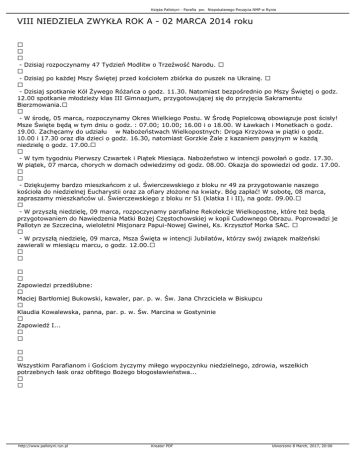 Księża Pallotyni - Parafia pw. Niepokalanego Poczęcia NMP w Rynie VIII NIEDZIELA ZWYKŁA ROK A - 02 MARCA 2014 roku - Dzisiaj rozpoczynamy 47 Tydzień Modlitw o Trzeźwość Narodu. - Dzisiaj po każdej Mszy Świętej przed kościołem zbiórka do puszek na Ukrainę. - Dzisiaj spotkanie Kół Żywego Różańca o godz. 11.30. Natomiast bezpośrednio po Mszy Świętej o godz. 12.00 spotkanie młodzieży klas III Gimnazjum, przygotowującej się do przyjęcia Sakramentu Bierzmowania. - W środę, 05 marca, rozpoczynamy Okres Wielkiego Postu. W Środę Popielcową obowiązuje post ścisły! Msze Święte będą w tym dniu o godz. : 07.00; 10.00; 16.00 i o 18.00. W Ławkach i Monetkach o godz. 19.00. Zachęcamy do udziału w Nabożeństwach Wielkopostnych: Droga Krzyżowa w piątki o godz. 10.00 i 17.30 oraz dla dzieci o godz. 16.30, natomiast Gorzkie Żale z kazaniem pasyjnym w każdą niedzielę o godz. 17.00. - W tym tygodniu Pierwszy Czwartek i Piątek Miesiąca. Nabożeństwo w intencji powołań o godz. 17.30. W piątek, 07 marca, chorych w domach odwiedzimy od godz. 08.00. Okazja do spowiedzi od godz. 17.00. - Dziękujemy bardzo mieszkańcom z ul. Świerczewskiego z bloku nr 49 za przygotowanie naszego kościoła do niedzielnej Eucharystii oraz za ofiary złożone na kwiaty. Bóg zapłać! W sobotę, 08 marca, zapraszamy mieszkańców ul. Świerczewskiego z bloku nr 51 (klatka I i II), na godz. 09.00. - W przyszłą niedzielę, 09 marca, rozpoczynamy parafialne Rekolekcje Wielkopostne, które też będą przygotowaniem do Nawiedzenia Matki Bożej Częstochowskiej w kopii Cudownego Obrazu. Poprowadzi je Pallotyn ze Szczecina, wieloletni Misjonarz Papui-Nowej Gwinei, Ks. Krzysztof Morka SAC. - W przyszłą niedzielę, 09 marca, Msza Święta w intencji Jubilatów, którzy swój związek małżeński zawierali w miesiącu marcu, o godz. 12.00. Zapowiedzi przedślubne: Maciej Bartłomiej Bukowski, kawaler, par. p. w. Św. Jana Chrzciciela w Biskupcu Klaudia Kowalewska, panna, par. p. w. Św. Marcina w Gostyninie Zapowiedź I... Wszystkim Parafianom i Gościom życzymy miłego wypoczynku niedzielnego, zdrowia, wszelkich potrzebnych łask oraz obfitego Bożego błogosławieństwa... http://www.pallotyni.ryn.pl Kreator PDF Utworzono 8 March, 2017, 20:06