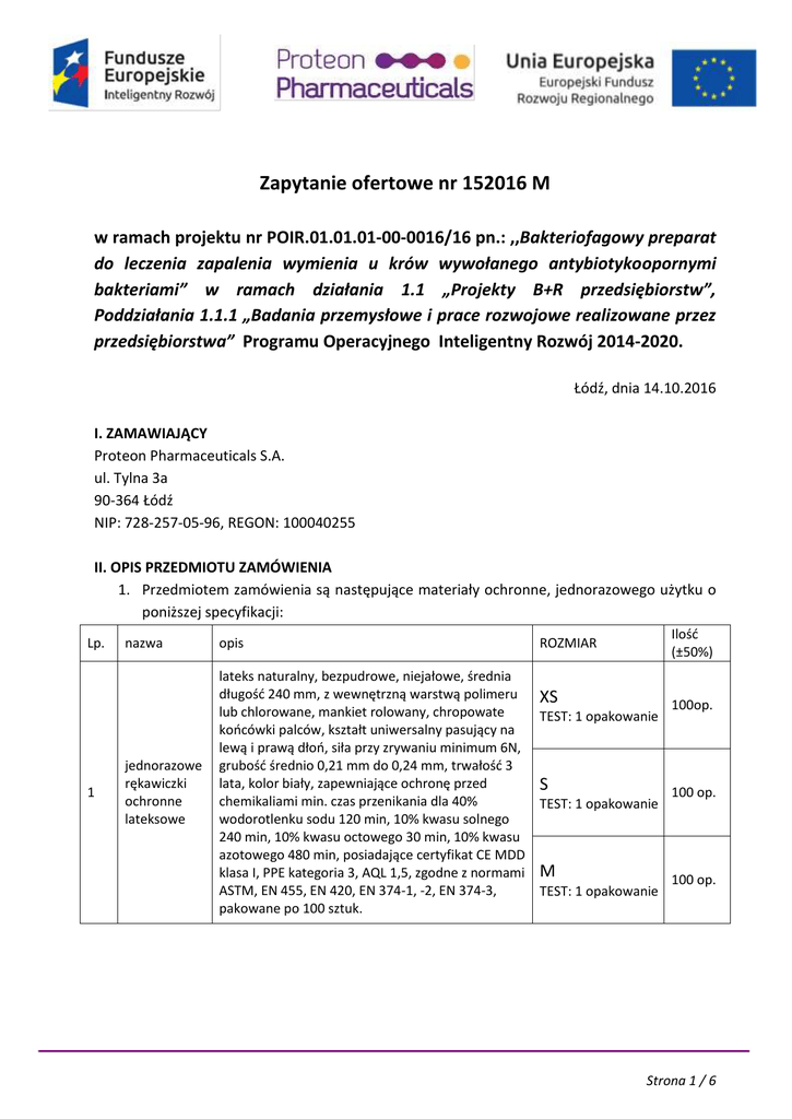 Zapytanie ofertowe nr 152016 M w ramach projektu nr POIR.01.01.01-00-0016/16 pn.: ,,Bakteriofagowy preparat do leczenia zapalenia wymienia u krów wywołanego antybiotykoopornymi bakteriami” w ramach działania 1.1 „Projekty B+R przedsiębiorstw”, Poddziałania 1.1.1 „Badania przemysłowe i prace rozwojowe realizowane przez przedsiębiorstwa” Programu Operacyjnego Inteligentny Rozwój 2014-2020. Łódź, dnia 14.10.2016 I. ZAMAWIAJĄCY Proteon Pharmaceuticals S.A. ul. Tylna 3a 90-364 Łódź NIP: 728-257-05-96, REGON: 100040255 II. OPIS PRZEDMIOTU ZAMÓWIENIA 1. Przedmiotem zamówienia są następujące materiały ochronne, jednorazowego użytku o poniższej specyfikacji: Lp. 1 ROZMIAR Ilość (±50%) nazwa opis jednorazowe rękawiczki ochronne lateksowe lateks naturalny, bezpudrowe, niejałowe, średnia długość 240 mm, z wewnętrzną warstwą polimeru XS 100op. lub chlorowane, mankiet rolowany, chropowate TEST: 1 opakowanie końcówki palców, kształt uniwersalny pasujący na lewą i prawą dłoń, siła przy zrywaniu minimum 6N, grubość średnio 0,21 mm do 0,24 mm, trwałość 3 lata, kolor biały, zapewniające ochronę przed S 100 op. chemikaliami min. czas przenikania dla 40% TEST: 1 opakowanie wodorotlenku sodu 120 min, 10% kwasu solnego 240 min, 10% kwasu octowego 30 min, 10% kwasu azotowego 480 min, posiadające certyfikat CE MDD klasa I, PPE kategoria 3, AQL 1,5, zgodne z normami M 100 op. ASTM, EN 455, EN 420, EN 374-1, -2, EN 374-3, TEST: 1 opakowanie pakowane po 100 sztuk. Strona 1 / 6 2 3 jednorazowe rękawiczki nitrylowe jednorazowe rękawiczki nitrylowe bezpudrowe, niejałowe, bezlateksowe, pokryte kolagenem i alantoiną, teksturowana powierzchnia na końcach palców, wykończenie mankietu: równomiernie rolowany brzeg, grubość rękawicy część dłoniowa 0,08 mm, na palcach 0,09 mm, kształt uniwersalny pasujący na lewą i prawą dłoń, pakowane po 100 sztuk, zgodne z normami: EN 455-1-2-3; ISO 9001; ISO 13485 Rękawice spełniają normy BHP: EN-374-2 zabezpieczenie przed mikroorganizmami, EN-374 odporność na środki chemiczne, EN-388 ochrona mechaniczna bezpudrowe, niejałowe, bez protein lateksu, średnia długość 240 mm, z wewnętrzną warstwą polimeru lub chlorowane, mankiet zawinięty, gładkie, chropowate końcówki palców, kształt uniwersalny pasujący na lewą i prawą dłoń, siła przy zrywaniu minimum 6N, grubość średnio 0,14 mm, trwałość 3 lata, kolor niebieski, posiadające certyfikat CE MDD klasa I, PPE kategoria 3, AQL 1, zgodne z normami ASTM, EN 455, EN 420, EN 3741, -2, EN 374-3, pakowane po 100 sztuk. XS TEST: 1 opakowanie S TEST: 1 opakowanie XS TEST: 1 opakowanie S TEST: 1 opakowanie M TEST: 1 opakowanie L TEST: 1 opakowanie 100 op. 100 op. 100 op. 100 op. 50 op. 50 op. Informacje dodatkowe: Podane ilości są szacunkowe (+/- 50%) i dotyczą zamówień składanych w ciągu 12 miesięcy. Termin ważności produktów powinien wynosić minimum rok od daty dostarczenia. Wybrany Dostawca będzie zobowiązany do zapewnienia stanów magazynowych, tak aby umożliwić sukcesywną dostawę materiałów. TESTOWANIE: Spośród ofert spełniających wszystkie kryteria zapytania (ważność oferty, termin realizacji, opis zgodny ze specyfikacją podaną w zapytaniu) Zamawiający dokona wstępnego porównania ofert. Następnie zwróci się do Dostawcy/Dostawców, który/którzy złoży/złożą najtańszą ofertę na dany produkt, do przesłania 1 testowego opakowania produktów w każdym rozmiarze w celu weryfikacji zgodności ze specyfikacją. Testowi zostaną poddane następujące parametry: weryfikacja rozmiaru dostarczonego produktu, komfort noszenia, wytrzymałość na rozerwania, możliwość wystąpienia reakcji alergicznej na produkt. Po przeprowadzeniu testów Zamawiający dokona ostatecznej oceny produktu. W przypadku, kiedy testowany produkt nie przejdzie pozytywnie testów Zamawiający zwróci się do następnego z kolei Dostawcy, który złożył najtańszą ofertę, o przesłanie produktu do weryfikacji. Kod CPV: 18424300-0 Strona 2 / 6 Termin dostawy przedmiotu zamówienia - nieprzekraczający wskazanego w zapytaniu terminu - 14 dni kalendarzowych od dnia zamówienia, w przypadku podania przedziału czasowego pod uwagę będzie brany maks. czas dostawy; Termin płatności - min. 30 dni od daty wystawienia faktury. Koszty dostawy - po stronie Dostawcy. Zamawiający dopuszcza/nie dopuszcza możliwości składania ofert częściowych. Zamawiający dopuszcza/nie dopuszcza możliwości składania ofert wariantowych. III. WARUNKI UDZIAŁU W POSTĘPOWANIU 1. Wykluczeniu z postępowania podlegają Wykonawcy, którzy są powiązani osobowo lub kapitałowo z Zamawiającym. Przez powiązania kapitałowe lub osobowe rozumie się wzajemne powiązania między zamawiającym lub osobami upoważnionymi do zaciągania zobowiązań w mieniu zamawiającego lub osobami wykonującymi w imieniu zamawiającego czynności związane z przygotowaniem i przeprowadzaniem procedury wyboru wykonawcy, a wykonawcą, polegające w szczególności na: uczestniczeniu w spółce, jako wspólnik spółki cywilnej lub spółki osobowej, posiadaniu co najmniej 10 % udziałów lub akcji, pełnieniu funkcji członka organu nadzorczego lub zarządzającego, prokurenta, pełnomocnika, pozostawaniu w związku małżeńskim, w stosunku pokrewieństwa lub powinowactwa w linii prostej, pokrewieństwa drugiego stopnia lub powinowactwa drugiego stopnia w linii bocznej lub w stosunku przysposobienia, opieki lub kurateli. IV. OPIS SPOSOBU PRZYGOTOWANIA OFERTY 1. Oferta powinna być sporządzona w języku polskim na papierze firmowym lub opatrzona pieczątką firmową. 2. Oferta powinna: zawierać pełną nazwę Oferenta, adres lub siedzibę Oferenta, numer telefonu, adres e-mail; posiadać datę wystawienia; posiadać termin ważności oferty - minimum 60 dni; zawierać termin realizacji zamówienia - w przypadku podania przedziału czasowego przy ocenie oferty pod uw