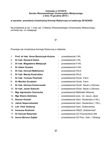 Uchwała nr 87/2015 Senatu Warszawskiego Uniwersytetu Medycznego z dnia 14 grudnia 2015 r. w sprawie: powołania Uczelnianej Komisji Wyborczej na kadencję 2016/2020 Na podstawie § ust. 1 oraz ust. 3 Statutu Warszawskiego Uniwersytetu Medycznego, uchwala się, co następuje: §1 Powołuje się Uczelnianą Komisję Wyborczą w składzie: 1. Prof. dr hab. Anna Barańczyk-Kuźma - przedstawiciel I WL 2. Dr hab. Ryszard Galus - przedstawiciel I WL 3. Dr hab. Magdalena Malejczyk - przedstawiciel II WL 4. Dr Adam Soszka - przedstawiciel II WL 5. Dr hab. Konrad Małkiewicz - przedstawiciel WLD 6. Dr hab. Maciej Kostrubiec - przedstawiciel WLD 7. Dr hab. Tomasz Pawiński - przedstawiciel Wydz. Farm. 8. Dr Monika Grudzień - przedstawiciel Wydz. Farm. 9. Dr hab. Dariusz Koziorowski - przedstawiciel Wydz. Nauki o Zdrowiu 10. Dr hab. Jacek Sobocki - przedstawiciel Wydz. Nauki o Zdrowiu 11. Mgr Agnieszka Czarnecka - przedstawiciel Biblioteki Głównej 12. Mgr Elwira Zielińska - przedstawiciel prac. nb. naucz. akad. 13. Roman Koński - przedstawiciel Sam. Studentów (I WL) 14. Jakub Szpernalowski - przedstawiciel Sam. Studentów ( I WL) 15. Lek. Piotr Sobieraj - przedstawiciel Sam. Doktorantów 16. Ireneusz Rudnicki - przedstawiciel NSZZ „Solidarność" 17. Dr Henryk Rebandel - przedstawiciel ZZ Pracowników AM 18. Iwona Berson-Zajdel - przedstawiciel ZZ Prac. Adm. i Obsługi §2 Tworzy się listę rezerwową członków Uczelnianej Komisji Wyborczej w składzie: 1. Dr hab. Krzysztof Dudek - przedstawiciel I WL 2. Dr Łukasz Koperski - przedstawiciel I WL 3. Dr hab. Rafał Słapa - przedstawiciel II WL 4. Dr Beata Kucińska - przedstawiciel II WL 5. Dr Zbigniew Kucharski - przedstawiciel WLD 6. Lek. dent. Piotr Rożniatowski - przedstawiciel WLD 7. Dr hab. Katarzyna Sykłowska-Baranek - przedstawiciel Wydz. Farm. 8. Dr Wojciech Szypuła - przedstawiciel Wydz. Farm 9. Dr hab. Joanna Gotlib - przedstawiciel Wydz. Nauki o Zdrowiu 10. Dr hab. Gabriela Olędzka - przedstawiciel Wydz. Nauki o Zdrowiu 11. Mgr Magdalena Książek - przedstawiciel Biblioteki Głównej 12. Mgr Ewa Lewicka - przedstawiciel prac. nb. naucz. akad. 13. Ewa Kamińska - przedstawiciel Sam. Studentów (WNoZ) 14. Maciej Sobieraj - przedstawiciel Sam. Studentów (II WL) 15. Mgr Sandra Górska - przedstawiciel Sam. Doktorantów 16. Małgorzata Krzywicka - przedstawiciel NSZZ „Solidarność" 17. Mgr Magdalena Jóźwik - przedstawiciel ZZ Pracowników AM 18. Mgr Ewa Kondratowicz - przedstawiciel ZZ Prac. Adm. i Obsługi §3 Tryb i zasady działania Uczelnianej Komisji Wyborczej określa Statut Warszawskiego Uniwersytetu Medycznego. §4 Uchwała wchodzi w życie z dniem podjęcia. Marek KRAWCZYK REKTOR