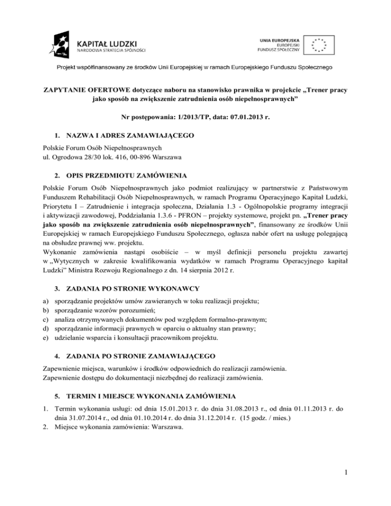 ZAPYTANIE OFERTOWE dotyczące naboru na stanowisko prawnika w projekcie „Trener pracy jako sposób na zwiększenie zatrudnienia osób niepełnosprawnych” Nr postępowania: 1/2013/TP, data: 07.01.2013 r. 1. NAZWA I ADRES ZAMAWIAJĄCEGO Polskie Forum Osób Niepełnosprawnych ul. Ogrodowa 28/30 lok. 416, 00-896 Warszawa 2. OPIS PRZEDMIOTU ZAMÓWIENIA Polskie Forum Osób Niepełnosprawnych jako podmiot realizujący w partnerstwie z Państwowym Funduszem Rehabilitacji Osób Niepełnosprawnych, w ramach Programu Operacyjnego Kapitał Ludzki, Priorytetu I – Zatrudnienie i integracja społeczna, Działania 1.3 - Ogólnopolskie programy integracji i aktywizacji zawodowej, Poddziałania 1.3.6 - PFRON – projekty systemowe, projekt pn. „Trener pracy jako sposób na zwiększenie zatrudnienia osób niepełnosprawnych”, finansowany ze środków Unii Europejskiej w ramach Europejskiego Funduszu Społecznego, ogłasza nabór ofert na usługę polegającą na obsłudze prawnej ww. projektu. Wykonanie zamówienia nastąpi osobiście – w myśl definicji personelu projektu zawartej w „Wytycznych w zakresie kwalifikowania wydatków w ramach Programu Operacyjnego kapitał Ludzki” Ministra Rozwoju Regionalnego z dn. 14 sierpnia 2012 r. 3. ZADANIA PO STRONIE WYKONAWCY a) b) c) d) e) sporządzanie projektów umów zawieranych w toku realizacji projektu; sporządzanie wzorów porozumień; analiza otrzymywanych dokumentów pod względem formalno-prawnym; sporządzanie informacji prawnych w oparciu o aktualny stan prawny; udzielanie wsparcia i konsultacji pracownikom projektu. 4. ZADANIA PO STRONIE ZAMAWIAJĄCEGO Zapewnienie miejsca, warunków i środków odpowiednich do realizacji zamówienia. Zapewnienie dostępu do dokumentacji niezbędnej do realizacji zamówienia. 5. TERMIN I MIEJSCE WYKONANIA ZAMÓWIENIA 1. Termin wykonania usługi: od dnia 15.01.2013 r. do dnia 31.08.2013 r., od dnia 01.11.2013 r. do dnia 31.07.2014 r., od dnia 01.10.2014 r. do dnia 31.12.2014 r. (15 godz. / mies.) 2. Miejsce wykonania zamówienia: Warszawa. 1 6. WARUNKI UDZIAŁU W POSTĘPOWANIU O udzielenie zamówienia może ubiegać się Wykonawca, który: a) posiada uprawnienia do świadczenia usług prawniczych, co oznacza, że o zamówienie mogą ubiegać się: i) osoby fizyczne posiadające uprawnienia do świadczenia pomocy prawnej w rozumieniu ustawy z dnia 6 lipca 1982 r. o radcach prawnych (tekst jedn. Dz. U. z 2010 r. Nr 10, poz. 65 z późn. zm.) albo ustawy z dnia 26 maja 1982 r. Prawo o adwokaturze (tekst jedn. Dz. U. z 2009 r. Nr 146, poz. 1188 z późn. zm.), w postaci tytułu zawodowego radcy prawnego lub adwokata; ii) prawnicy zagraniczni posiadający uprawnienia do świadczenia pomocy prawnej na terenie Rzeczpospolitej Polskiej zgodnie z postanowieniami ustawy z dnia z dnia 5 lipca 2002 r. o świadczeniu przez prawników zagranicznych pomocy prawnej na terenie Rzeczpospolitej Polskiej (Dz. U. z 2002 r. Nr 126, poz. 1069 ze zm.) b) posiada co najmniej roczne doświadczenie zawodowe w zakresie świadczenia usług prawniczych na rzecz organizacji pozarządowych działających na rzecz osób niepełnosprawnych; c) wykona zamówienie osobiście – w myśl definicji personelu projektu zawartej w „Wytycznych w zakresie kwalifikowania wydatków w ramach Programu Operacyjnego Kapitał Ludzki” Ministra Rozwoju Regionalnego z dn. 14 sierpnia 2012 r. Niespełnienie chociażby jednego z wymienionych wyżej warunków skutkować będzie wykluczeniem Wykonawcy z postępowania. Ofertę Wykonawcy wykluczonego uważa się za odrzuconą. 7. DOKUMENTY WYMAGANE W CELU POTWIERDZENIA SPEŁNIENIA WARUNKÓW 1. Oświadczenie o spełnianiu warunków udziału w postępowaniu wg wzoru stanowiącego załącznik nr 1 do zapytania ofertowego. 2. Kopia dyplomu potwierdzającego posiadanie wykształcenia wyższego prawniczego. 3. Życiorys zawierający m.in.: przebieg pracy zawodowej. 4. Referencje potwierdzające doświadczenie i umiejętności. 8. WALUTA, W JAKIEJ BĘDĄ PROWADZONE ROZLICZENIA ZWIĄZANE Z REALIZACJĄ NINIEJSZEGO ZAMÓWIENIA PLN 9. OPIS SPOSOBU PRZYGOTOWANIA OFERTY Ofertę należy sporządzić w formie papierowej w języku polskim. Kompletna oferta musi zawierać: 1) dane dotyczące Wykonawcy (imię i nazwisko, adres, telefon, e-mail); 2) proponowaną stawkę godzinową brutto za wykonanie zamówienia; 2 3) oświadczenie o spełnianiu warunków udziału w postępowaniu wg wzoru stanowiącego załącznik nr 1 do zapytania; 4) kopię dyplomu potwierdzającego posiadanie wykształcenia wyższego prawniczego; 5) życiorys; 6) referencje. 10. OSOBY UPRAWNIONE DO POROZUMIEWANIA SIĘ Z POTENCJALNYMI WYKONAWCAMI Joanna Wojtyńska, Dyrektor Biura PFON, e-mail: [email protected] 11. MIEJSCE, TERMIN I SPOSÓB ZŁOŻENIA OFERTY Ofertę (skan) należy przesłać drogą elektroniczną na adres e-mail: [email protected] w nieprzekraczalnym terminie do dnia 15 stycznia 2013 r. do godz. 10:00. Decyduje data i godzina wpływu oferty. W temacie wiadomości należy wpisać „Prawnik - oferta". 12. KRYTERIA OCENY OFERT I WYBORU WYKONAWCY Dokonując wyboru oferty najkorzystniejszej Zamawiający będzie kierował się następującymi kryteriami: 1. cena za realizację zamówienia – max 70 pkt; 2. doświadczenie zawodowe w zakresie świadczenia usług prawniczych – max 30 pkt. 13. SPOSÓB OBLICZENIA OFERTY Zamawiający dokona oceny ofert na podstawie zsumowanej liczby punktów w oparciu o przedstawione kryteria i ustaloną punktację. Maksymalnie oferta może uzyskać 100 pkt. 1. Punktacja dla kryterium „cena za realizację zamówienia” - ocena na podstawie ceny (stawki godzinowej brutto) wskazanej przez Wykonawcę w ofercie. Maksymalna liczba punktów dla tego kryterium wynosi 70. Oferta z najniższą ceną otrzyma 70 punktów. Punkty zostaną obliczone wg wzoru: C = ( Cmin/Co„x”) x 70 pkt gdzie: C – liczba punktów dla oferty ocenianej za kryterium ceny Cmin – najniższa stawka godzinowa brutto spośród złożonych ofert 