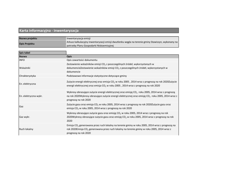 Karta informacyjna - inwentaryzacja Nazwa projektu Opis Projektu Spis tabel Nazwa INFO Wskaźniki Chrakterystyka Inwentaryzacja emisji Arkusz kalkulacyjny inwentaryzacji emisji dwutlenku węgla na terenie gminy Stawiszyn, wykonany na potrzeby Planu Gospodarki Niskoemisyjnej Opis Opis zawartości dokumentu Zestawienie wskaźników emisji CO2 z poszczególnych źródeł, wykorzystanych w dokumencieZestawienie wskaźników emisji CO2 z poszczególnych źródeł, wykorzystanych w dokumencie Podstawowe informacje statystyczne dotyczące gminy En. elektryczna Zużycie energii elektrycznej oraz emisja CO2 w roku 2005 , 2014 wraz z prognozą na rok 2020Zużycie energii elektrycznej oraz emisja CO2 w roku 2005 , 2014 wraz z prognozą na rok 2020 En. elektryczna wykr. Wykresy obrazujące zużycie energii elektrycznej oraz emisję CO2 roku 2005, 2014 wraz z prognozą na rok 2020Wykresy obrazujące zużycie energii elektrycznej oraz emisję CO2 roku 2005, 2014 wraz z prognozą na rok 2020 Gaz Zużycie gazu oraz emisja CO2 w roku 2005, 2014 wraz z prognozą na rok 2020Zużycie gazu oraz emisja CO2 w roku 2005, 2014 wraz z prognozą na rok 2020 Gaz wykr. Wykresy obrazujące zużycie gazu oraz emisję CO2 w roku 2005, 2014 wraz z prognozą na rok 2020Wykresy obrazujące zużycie gazu oraz emisję CO2 w roku 2005, 2014 wraz z prognozą na rok 2020 Ruch lokalny Emisja CO2 generowana przez ruch lokalny na terenie gminy w roku 2005, 2014 wraz z prognozą na rok 2020Emisja CO2 generowana przez ruch lokalny na terenie gminy w roku 2005, 2014 wraz z prognozą na rok 2020 Tranzyt Natężenie ruchu oraz Emisja CO2 na drogach tranzytowych przebiegających przez teren gminy w roku 2005, 2014 wraz z prognozą na rok 2020Natężenie ruchu oraz Emisja CO2 na drogach tranzytowych przebiegających przez teren gminy w roku 2005, 2014 wraz z prognozą na rok 2020 Transport wykr. Wykresy obrazujące emisję CO2 z ruchu tranzytowego i lokalnego Wykresy obrazujące emisję CO2 z ruchu tranzytowego i lokalnego Ciepło Zużycie paliw opałowych oraz ciepła sieciowego oraz emisja CO2 w roku 2005, 2014 i prognoza na rok 2020 Zużycie paliw opałowych oraz ciepła sieciowego oraz emisja CO2 w roku 2005, 2014 i prognoza na rok 2020 Ciepło wykr. Wykresy obrazujące emisję CO2 generowaną przez wykorzystanie ciepła sieciowego oraz spalanie paliw opałowychWykresy obrazujące emisję CO2 generowaną przez wykorzystanie ciepła sieciowego oraz spalanie paliw opałowych Ob. publ. Zestawienie obiektów publicznych wraz z informacją o generowanej emisji CO2Zestawienie obiektów publicznych wraz z informacją o generowanej emisji CO2 Oświetlenie Informacja o emisji CO2 generowanej porzez zużycia energii elektrycznej na cele oświetleniowe Informacja o emisji CO2 generowanej porzez zużycia energii elektrycznej na cele oświetleniowe Bilans Łączne zestawienie emisji CO2 z podziałem na nośniki energii oraz sektory w roku 2005, 2014 wraz z prognozą na rok 2020 i obliczniem statystycznej emisji na 1 mieszkańca gminy.