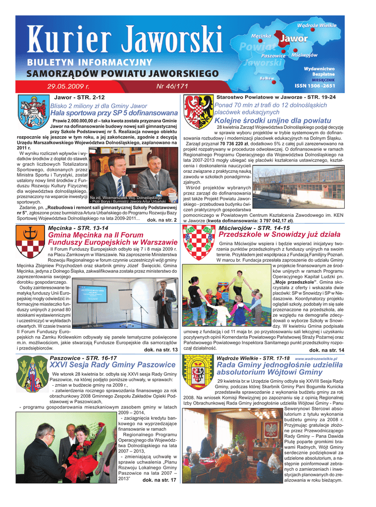 Jawor - STR. 2-12 Blisko 2 miliony zł dla Gminy Jawor Hala sportowa przy SP 5 dofinansowana Prawie 2.000.000,00 zł – taka kwota została przyznana Gminie Jawor na dofinansowanie budowy nowej sali gimnastycznej przy Szkole Podstawowej nr 5. Realizacja nowego obiektu rozpocznie się jeszcze w tym roku, a jej zakończenie, zgodnie z decyzją Urzędu Marszałkowskiego Województwa Dolnośląskiego, zaplanowano na 2011 r. W wyniku rozliczeń wpływów i wydatków środków z dopłat do stawek w grach liczbowych Totalizatora Sportowego, dokonanych przez Ministra Sportu i Turystyki, został ustalony nowy limit środków z Funduszu Rozwoju Kultury Fizycznej dla województwa dolnośląskiego, przeznaczony na wsparcie inwestycji Na zdj. Wicemarszałek Woj. Dolnąśląskiego - Piotr Borys i Burmistrz Jawora Artur Urbański sportowych. Zadanie, pn. „Rozbudowa i remont sali gimnastycznej Szkoły Podstawowej nr 5”, zgłoszone przez burmistrza Artura Urbańskiego do Programu Rozwoju Bazy Sportowej Województwa Dolnośląskiego na lata 2009-2011... dok. na str. 2 Męcinka - STR. 13-14 Gmina Męcinka na II Forum Funduszy Europejskich w Warszawie II Forum Funduszy Europejskich odbyło się 7 i 8 maja 2009 r. na Placu Zamkowym w Warszawie. Na zaproszenie Ministerstwa Rozwoju Regionalnego w forum czynnie uczestniczyli wójt gminy Męcinka Zbigniew Przychodzeń oraz skarbnik gminy Józef Święcicki. Gmina Męcinka, jedyna z Dolnego Śląska, zakwalifikowana została przez ministerstwo do zaprezentowania swojego dorobku gospodarczego. Osoby zainteresowane tematyką funduszy Unii Europejskiej mogły odwiedzić informacyjne miasteczko funduszy unijnych z ponad 80 stoiskami wystawienniczymi i uczestniczyć w wykładach otwartych. W czasie trwania II Forum Funduszy Europejskich na Zamku Królewskim odbywały się panele tematyczne poświęcone m.in. możliwościom, jakie stwarzają Fundusze Europejskie dla samorządów i przedsiębiorców. dok. na str. 13 Paszowice - STR. 16-17 XXVI Sesja Rady Gminy Paszowice We wtorek 28 kwietnia br. odbyła się XXVI sesja Rady Gminy Paszowice, na której podjęto poniższe uchwały, w sprawach: - zmian w budżecie gminy na 2009 r., - zatwierdzenia rocznego sprawozdania finansowego za rok obrachunkowy 2008 Gminnego Zespołu Zakładów Opieki Podstawowej w Paszowicach, - programu gospodarowania mieszkaniowym zasobem gminy w latach 2009 – 2014, - zaciągnięcia kredytu bankowego na wyprzedzające finansowanie w ramach Regionalnego Programu Operacyjnego dla Województwa Dolnośląskiego na lata 2007 – 2013, - zmieniającą uchwałę w sprawie uchwalenia „Planu Rozwoju Lokalnego Gminy Paszowice na lata 2007 – 2013” dok. na str. 17 Starostwo Powiatowe w Jaworze - STR. 19-24 Ponad 70 mln zł trafi do 12 dolnośląskich placówek edukacjynych Kolejne środki unijne dla powiatu 28 kwietnia Zarząd Województwa Dolnośląskiego podjął decyzję w sprawie wyboru projektów w trybie systemowym do dofinansowania rozbudowy i modernizacji placówek edukacyjnych na Dolnym Śląsku. Zarząd przyznał 70 736 220 zł, dodatkowo 5% z całej puli zarezerwowano na projekt rozpatrywany w procedurze odwoławczej. O dofinansowanie w ramach Regionalnego Programu Operacyjnego dla Województwa Dolnośląskiego na lata 2007-2013 mogły ubiegać się placówki kształcenia ustawicznego, kształcenia i doskonalenia nauczycieli oraz związane z praktyczną nauką zawodu w szkołach ponadgimnazjalnych. Wśród projektów wybranych przez zarząd do dofinansowania jest także Projekt Powiatu Jaworskiego - przebudowa budynku ćwiczeń praktycznych gospodarstwa pomocniczego w Powiatowym Centrum Kształcenia Zawodowego im. KEN w Jaworze (kwota dofinansowania: 3 797 042,17 zł). Mściwojów - STR. 14-15 Przedszkole w Snowidzy już działa Gmina Mściwojów wspiera i będzie wspierać inicjatywy tworzenia punktów przedszkolnych z funduszy unijnych na swoim terenie. Przykładem jest współpraca z Fundacją Familijny Poznań. W marcu br. Fundacja przesłała zaproszenie do udziału Gminy w projekcie finansowanym ze środków unijnych w ramach Programu Operacyjnego Kapitał Ludzki pn. ,,Moje przedszkole”. Gmina skorzystała z oferty i wskazała dwie placówki: SP w Snowidzy i SP w Niedaszowie. Koordynatorzy projektu oglądali szkoły, podobały im się sale przeznaczone na przedszkola, ale ze względu na demografie zdecydowali o wyborze Szkoły w Snowidzy. W kwietniu Gmina podpisała umowę z fundacją i od 11 maja br. po przystosowaniu sali lekcyjnej i uzyskaniu pozytywnych opinii Komendanta Powiatowego Państwowej Straży Pożarnej oraz Państwowego Powiatowego Inspektora Sanitarnego punkt przedszkolny rozpoczął działalność. dok. na str. 14 Wądroże Wielkie - STR. 17-18 www.wadrozewielkie.pl Rada Gminy jednogłośnie udzieliła absolutorium Wójtowi Gminy 29 kwietnia br.w Urzędzie Gminy odbyła się XXVIII Sesja Rady Gminy, podczas której Skarbnik Gminy Pani Bogumiła Kunicka przedstawiła sprawozdanie z wykonania budżetu gminy za rok 2008. Na wniosek Komisji Rewizyjnej po zapoznaniu się z opinią Regionalnej Izby Obrachunkowej Rada Gminy jednogłośnie udzieliła Wójtowi Gminy - Panu Sewerynowi Stercowi absolutorium z tytułu wykonania budżetu gminy za 2008 r. Przyjmując gratulacje złożone przez Przewodniczącego Rady Gminy – Pana Dawida Plutę poparte gromkimi brawami Radnych, Wójt Gminy serdecznie podziękował za udzielone absolutorium, a następnie poinformował zebranych o zamierzeniach i inwestycjach planowanych do zrealizowania w roku bieżącym. JAWOR 29.05.2009 r. - Kurier Jaworski - Biuletyn Informacyjny Samorządów Powiatu Jaworskiego - str. 2 Blisko 2 miliony zł dla Gminy Jawor Z życia samorządu Zadanie, pn. „Rozbudowa i remont sali gimnastycznej Szkoły Podstawowej nr 5”, zgłoszone przez burmistrza Artura Urbańskiego do Programu Rozwoju Bazy Sportowej Województwa Dolnośląskiego na lata 2009-2011, zostało pozytywnie zaopiniowane i przyjęte do dofin