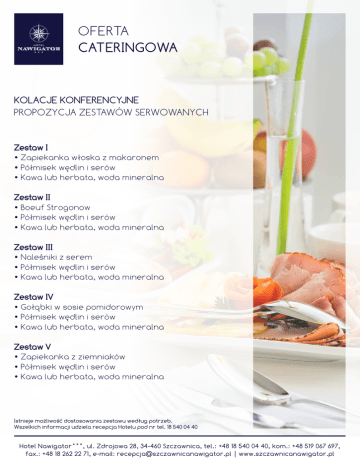 OFERTA CATERINGOWA KOLACJE KONFERENCYJNE PROPOZYCJA ZESTAWÓW SERWOWANYCH Zestaw I • Zapiekanka włoska z makaronem • Półmisek wędlin i serów • Kawa lub herbata, woda mineralna Zestaw II • Boeuf Strogonow • Półmisek wędlin i serów • Kawa lub herbata, woda mineralna Zestaw III • Naleśniki z serem • Półmisek wędlin i serów • Kawa lub herbata, woda mineralna Zestaw IV • Gołąbki w sosie pomidorowym • Półmisek wędlin i serów • Kawa lub herbata, woda mineralna Zestaw V • Zapiekanka z ziemniaków • Półmisek wędlin i serów • Kawa lub herbata, woda mineralna Istnieje możliwość dostosowania zestawu według potrzeb. Wszelkich informacji udziela recepcja Hotelu pod nr tel. 18 540 04 40 Hotel Nawigator***, ul. Zdrojowa 28, 34-460 Szczawnica, tel.: +48 18 540 04 40, kom.: +48 519 067 697, fax.: +48 18 262 22 71, e-mail: [email protected] | www.szczawnicanawigator.pl