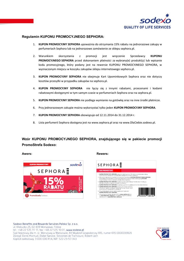 Regulamin KUPONU PROMOCYJNEGO SEPHORA: 1. KUPON PROMOCYJNY SEPHORA upoważnia do otrzymania 15% rabatu na jednorazowe zakupy w perfumeriach Sephora lub na jednorazowe zamówienie ze sklepu sephora.pl. 2. Warunkiem skorzystania z promocji jest wręczenie Sprzedawcy KUPONU PROMOCYJNEGO SEPHORA przed dokonaniem płatności za wybrany(e) produkt(y) lub wpisanie kodu promocyjnego, który podany jest na rewersie KUPONU PROMOCYJNEGO SEPHORA, w wyznaczonym miejscu w koszyku zakupów sklepu internetowego sephora.pl. 3. KUPON PROMOCYJNY SEPHORA nie obejmuje Kart Upominkowych Sephora oraz nie dotyczy kosztów przesyłki w przypadku zakupów na sephora.pl. 4. KUPON PROMOCYJNY SEPHORA nie łączy się z innymi rabatami, przecenami i kodami rabatowymi dostępnymi w tym samym czasie w perfumeriach Sephora oraz na sephora.pl. 5. KUPON PROMOCYJNY SEPHORA nie podlega wymianie na gotówkę oraz na inne środki płatnicze. 6. Przy jednorazowym zakupie można wykorzystać tylko jeden KUPON PROMOCYJNY SEPHORA. 7. KUPON PROMOCYJNY SEPHORA obowiązuje od 12.11.2014 do 31.12.2014 r. 8. Lista perfumerii Sephora dostępna jest na www.sephora.pl oraz na www.DlaCiebie.sodexo.pl. Wzór KUPONU PROMOCYJNEGO SEPHORA, znajdującego się w pakiecie promocji PromoStrefa Sodexo: Awers: Rewers: