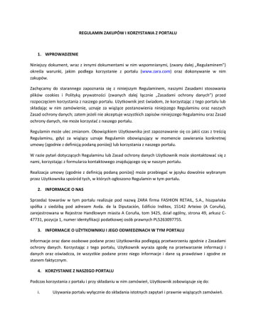 REGULAMIN ZAKUPÓW I KORZYSTANIA Z PORTALU 1. WPROWADZENIE Niniejszy dokument, wraz z innymi dokumentami w nim wspomnianymi, (zwany dalej „Regulaminem”) określa warunki, jakim podlega korzystanie z portalu (www.zara.com) oraz dokonywanie w nim zakupów. Zachęcamy do starannego zapoznania się z niniejszym Regulaminem, naszymi Zasadami stosowania plików cookies i Polityką prywatności (zwanych dalej łącznie „Zasadami ochrony danych”) przed rozpoczęciem korzystania z naszego portalu. Użytkownik jest świadom, że korzystając z tego portalu lub składając w nim zamówienie, uznaje za wiążące postanowienia niniejszego Regulaminu oraz naszych Zasad ochrony danych; zatem jeżeli nie akceptuje wszystkich zapisów niniejszego Regulaminu oraz Zasad ochrony danych, nie może korzystać z naszego portalu. Regulamin może ulec zmianom. Obowiązkiem Użytkownika jest zapoznawanie się co jakiś czas z treścią Regulaminu, gdyż za wiążący uznaje Regulamin obowiązujący w momencie zawierania konkretnej umowy (zgodnie z definicją podaną poniżej) lub korzystania z naszego portalu. W razie pytań dotyczących Regulaminu lub Zasad ochrony danych Użytkownik może skontaktować się z nami, korzystając z formularza kontaktowego znajdującego się w naszym portalu. Realizacja umowy (zgodnie z definicją podaną poniżej) może przebiegać w języku dowolnie wybranym przez Użytkownika spośród tych, w których ogłoszono Regulamin w tym portalu. 2. INFORMACJE O NAS Sprzedaż towarów w tym portalu realizuje pod nazwą ZARA firma FASHION RETAIL, S.A., hiszpańska spółka z siedzibą pod adresem Avda. de la Diputación, Edificio Inditex, 15142 Arteixo (A Coruña), zarejestrowana w Rejestrze Handlowym miasta A Coruña, tom 3425, dział ogólny, strona 49, arkusz C47731, pozycja 1, numer identyfikacji podatkowej osób prawnych PL5263097755. 3. INFORMACJE O UŻYTKOWNIKU I JEGO ODWIEDZINACH W TYM PORTALU Informacje oraz dane osobowe podane przez Użytkownika podlegają przetworzeniu zgodnie z Zasadami ochrony danych. Korzystając z tego portalu, Użytkownik wyraża zgodę na przetwarzanie informacji i danych oraz oświadcza, że wszystkie podane przez niego informacje i dane są prawdziwe i zgodne ze stanem faktycznym. 4. KORZYSTANIE Z NASZEGO PORTALU Podczas korzystania z portalu i przy składaniu w nim zamówień, Użytkownik zobowiązuje się do: i. Używania portalu wyłącznie do składania istotnych zapytań i prawnie wiążących zamówień. ii. iii. Nieskładania fałszywych lub nieuczciwych zamówień. W razie wystąpienia uzasadnionych przesłanek przypuszczenia, że złożono tego rodzaju zamówienie, mamy prawo je anulować i powiadomić stosowne władze o zaistniałej sytuacji. Proszę podać nam swój prawdziwy i dokładny adres e-mail i adres do korespondencji oraz (lub) inne dane kontaktowe. Użytkownik zgadza się na korzystanie przez nas z tych informacji do kontaktu z nim w razie potrzeby (patrz nasza Polityka prywatności). Jeżeli Użytkownik nie poda nam wszystkich wymaganych informacji, nie będzie mógł złożyć zamówienia. Składając zamówienie w tym portalu, Użytkownik oświadcza, że jest pełnoletni i posiada zdolność prawną do zawierania umów. 5. DOSTĘPNOŚĆ USŁUG Artykuły oferowane w tym portalu mogą zostać dostarczone wyłącznie na terytorium Polski. 6. ZAWARCIE UMOWY Informacje zawarte w niniejszym Regulaminie i szczegóły podane w portalu nie stanowią oferty handlowej, lecz zaproszenie do negocjacji. Umowę w sprawie dowolnego produktu uznaje się za zawartą między nami a Użytkownikiem dopiero po jednoznacznym potwierdzeniu przyjęcia zamówienia z naszej strony. Jeżeli oferta Użytkownika nie zostanie przyjęta, a jego rachunek bankowy zostałby wcześniej obciążony, kwota obciążenia podlega zwrotowi w całości. Aby złożyć zamówienie, Użytkownik musi przejść całą procedurę zakupu online i kliknąć przycisk „Autoryzacja płatności”. Następnie Użytkownik otrzyma od nas e-list potwierdzający otrzymanie przez nas zamówienia („Potwierdzenie zamówienia”). Proszę pamiętać, że nie oznacza to, iż zamówienie zostało przyjęte do realizacji, gdyż stanowi ono jedynie ofertę kupna od nas jednego lub kilku produktów. Wszystkie zamówienia wymagają naszej akceptacji, o czym Użytkownik zostanie powiadomiony e-listem, w którego treści potwierdzimy, że realizacja zamówienia jest w toku („Potwierdzenie wysyłki”). Umowa kupna produktu („Umowa”) zostaje formalnie zawarta wyłącznie w przypadku przesłania przez nas Potwierdzenia wysyłki. Przedmiotem Umowy będą wyłącznie produkty wymienione w Potwierdzeniu wysyłki. Nie mamy obowiązku dostarczyć Użytkownikowi innego produktu, który nie został zamówiony, do momentu potwierdzenia jego wysyłki w Potwierdzeniu wysyłki. 7. DOSTĘPNOŚĆ PRODUKTÓW Dostawa wszelkich zamówionych produktów zależy od ich dostępności. Wobec powyższego w razie wystąpienia problemów z podażą produktów lub braku danych pozycji w magazynie, zastrzegamy sobie prawo do poinformowania Użytkownika o możliwości zamówienia produktów zastępczych takie samej lub wyższej jakości i w podobnej cenie. Jeżeli Użytkownik nie zechce zamówić produktów zastępczych, dokonamy w całości zwrotu kwoty wpłaconej ewentualnie przez Użytkownika. 8. ODMOWA REALIZACJI ZAMÓWIENIA Zastrzegamy sobie prawo do wycofania dowolnego produktu z tego portalu w dowolnym terminie oraz usunięcia lub zmiany wszelkich materiałów lub treści dostępnych w portalu. Wprawdzie dokładamy wszelkich starań, aby zawsze realizować wszystkie zamówienia, lecz w przypadku wystąpienia wyjątkowych okoliczności może się zdarzyć, że będziemy musieli odmówić realizacji zamówienia po wysłaniu Potwierdzenia zamówienia; zastrzegamy sobie prawo do uczynienia tego w dowolnym momencie. Nie ponosimy odpowiedzialności wobec Użytkownika lub osób trzecich za wycofanie dowolneg