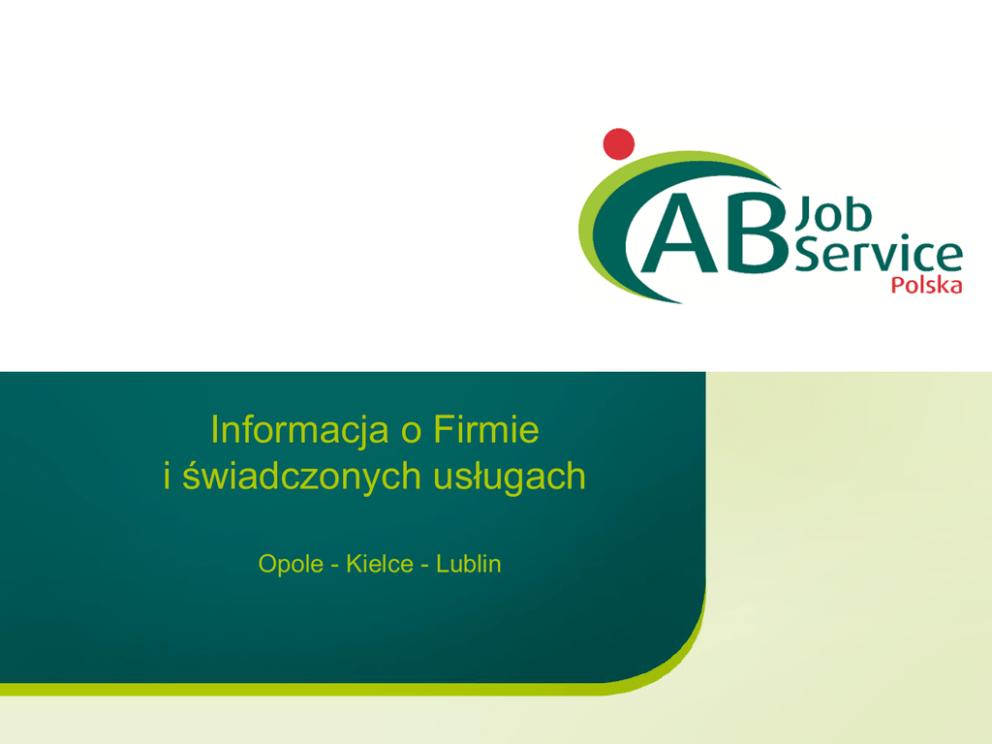 Informacja o Firmie i świadczonych usługach Opole - Kielce - Lublin Kim jesteśmy • Jesteśmy spółką z kapitałem holenderskim, która działa na rynku polskim od 2000 roku, najpierw poprzez sieć biur przedstawicielskich holenderskiej firmy-matki, a następnie również poprzez sieć własnych oddziałów. • Należymy do grupy kapitałowej AB Nederland, która istnieje od ponad 40 lat na holenderskim rynku pracy, posiada ponad 40 biur w całym kraju, zatrudnia 4000 stałych pracowników oraz 10.000 pracowników tymczasowych i ma obrót roczny prawie 200 milionów Euro. • Posiadamy certyfikat jako agencja zatrudnienia (nr cert. 5971) • Jesteśmy członkiem OKAP - Ogólnopolskiego Konwentu Agencji Pracy oraz Polsko-Niemieckiej Izby Gospodarczej Dla kogo pracujemy - Holandia • Naszymi Klientami w Holandii są członkowie naszego koncernu agencje pracy tymczasowej AB Service. • W Holandii pracujemy głównie dla: • branży rolniczo-ogrodniczej • firm produkcyjnych • budownictwa • firm usługowych (sortowanie, pakowanie, logistyka, transport) Dla kogo pracujemy - Polska • Naszymi Klientami w Polsce są firmy z kapitałem polskim i zagranicznym, dla których świadczymy usługi: • • • • pracy tymczasowej doradztwa personalnego doradztwa z zakresu zarządzania zasobami ludzkimi szkoleń dla pracowników i kadry zarządzającej • W Polsce pracujemy dla całej gamy branż od branży rolniczoogrodniczej przez branżę outsourcingową po branżę produkcyjną i usługową Rekrutacja - baza danych • W każdym oddziale dysponujemy bazą danych około 6000 tysięcy kandydatów z całej Polski • Codziennie pracujemy nad aktualizowaniem naszych baz, aby dzięki temu móc zareagować na potrzeby Klienta jak najszybciej i jak najefektywniej pod kątem jakości przedstawianych kandydatów • W czasie współpracy z danym Klientem prowadzimy rekrutację na Jego potrzeby nawet w okresie pełnego zatrudnienia, dlatego też w przypadku nagłego zapotrzebowania, możemy szybko zareagować Rekrutacja obsługa klienta na odległość • Nie ograniczamy się do współpracy z Klientami w miastach, w których mamy oddziały • Rekrutujemy również dla firm z siedzibami m.in. w: Rudzie Śląskiej, Wrocławiu, Krakowie, Katowicach, Gliwicach, Łodzi, Leonowie, Ostrowcu Świętokrzyskim • Na potrzeby jednego z naszych klientów rekrutowaliśmy osoby w północno-zachodnim regionie Polski, w takich miastach jak: Szczecin, Trzebiatów, Drawsko Pomorskie czy Wałcz Nasz zespół • Dyrektor/Kierownik projektów • Jagoda Szałaj: 14 lat doświadczenia w branży pracy tymczasowej i rekrutacji, 12 lat doświadczenia jako dyrektor operacyjny i kierownik projektów w Polsce i w Holandii, opiniowała dla Związku Pracodawców Dolnego Śląska projekt ustawy o agencjach pracy tymczasowej, przedstawiała rozwiązania holenderskie w dziedzinie elastycznych form zatrudniania posłom do polskiego parlamentu oraz przedstawicielom Ministerstwa Pracy, certyfikowany Specjalista Akademii Outplacementu programu „Bezrobocie – co robić" PolskoAmerykańskiej Fundacji Wolności, edycja 2004 • Specjaliści ds rekrutacji • na tym stanowisku pracują osoby, które mają największe doświadczenie w zakresie rekrutacji i obsługi klienta; to specjaliści są bezpośrednio odpowiedzialni za to, żeby dany projekt rekrutacji i/lub pracy tymczasowej przebiegał sprawnie i na odpowiednim poziomie jakościowym • Wsparcie w biurze • asystenci ds rekrutacji oraz osoby odpowiedzialne za sprawy kadrowo-płacowe wspierają specjalistów zarówno w rekrutacjach jak i dbaniu o porządek w kwestiach formalno-prawnych Nasze biura w Polsce • Biuro Kielce ul. Okrzei 32/9 25-528 Kielce • Biuro Lublin ul. Grabskiego 25J lokal 2 (I piętro) 20-022 Lublin • Biuro Opole ul. Kołłątaja 15/2 45-064 Opole
