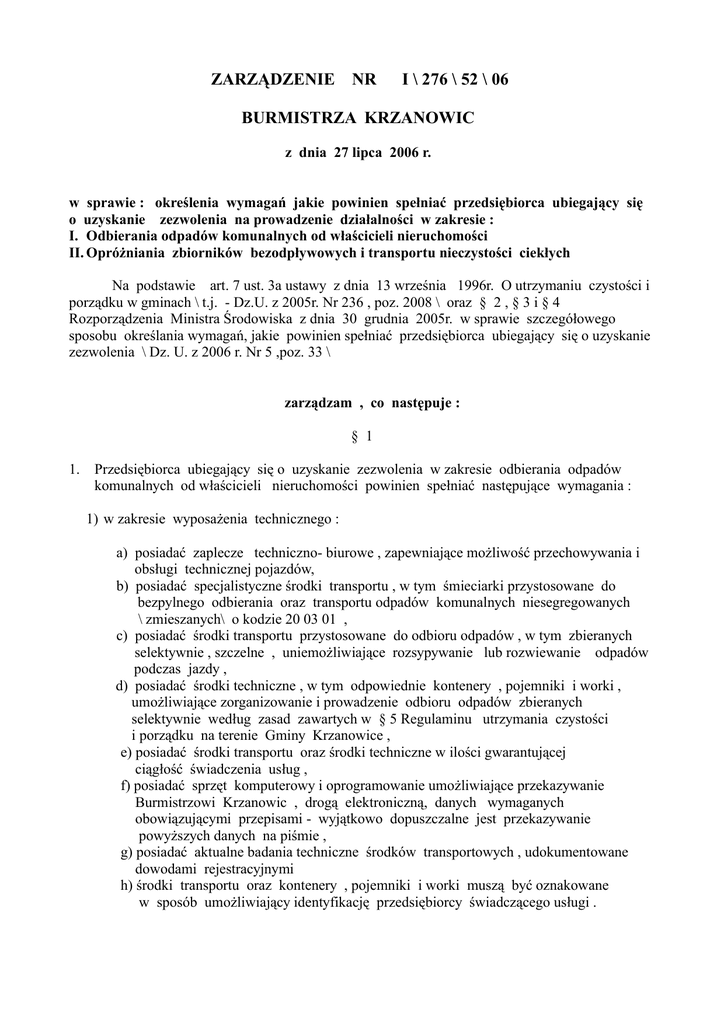 ZARZĄDZENIE NR I \ 276 \ 52 \ 06 BURMISTRZA KRZANOWIC z dnia 27 lipca 2006 r. w sprawie : określenia wymagań jakie powinien spełniać przedsiębiorca ubiegający się o uzyskanie zezwolenia na prowadzenie działalności w zakresie : I. Odbierania odpadów komunalnych od właścicieli nieruchomości II. Opróżniania zbiorników bezodpływowych i transportu nieczystości ciekłych Na podstawie art. 7 ust. 3a ustawy z dnia 13 września 1996r. O utrzymaniu czystości i porządku w gminach \ t.j. - Dz.U. z 2005r. Nr 236 , poz. 2008 \ oraz § 2 , § 3 i § 4 Rozporządzenia Ministra Środowiska z dnia 30 grudnia 2005r. w sprawie szczegółowego sposobu określania wymagań, jakie powinien spełniać przedsiębiorca ubiegający się o uzyskanie zezwolenia \ Dz. U. z 2006 r. Nr 5 ,poz. 33 \ zarządzam , co następuje : § 1 1. Przedsiębiorca ubiegający się o uzyskanie zezwolenia w zakresie odbierania odpadów komunalnych od właścicieli nieruchomości powinien spełniać następujące wymagania : 1) w zakresie wyposażenia technicznego : a) posiadać zaplecze techniczno- biurowe , zapewniające możliwość przechowywania i obsługi technicznej pojazdów, b) posiadać specjalistyczne środki transportu , w tym śmieciarki przystosowane do bezpylnego odbierania oraz transportu odpadów komunalnych niesegregowanych \ zmieszanych\ o kodzie 20 03 01 , c) posiadać środki transportu przystosowane do odbioru odpadów , w tym zbieranych selektywnie , szczelne , uniemożliwiające rozsypywanie lub rozwiewanie odpadów podczas jazdy , d) posiadać środki techniczne , w tym odpowiednie kontenery , pojemniki i worki , umożliwiające zorganizowanie i prowadzenie odbioru odpadów zbieranych selektywnie według zasad zawartych w § 5 Regulaminu utrzymania czystości i porządku na terenie Gminy Krzanowice , e) posiadać środki transportu oraz środki techniczne w ilości gwarantującej ciągłość świadczenia usług , f) posiadać sprzęt komputerowy i oprogramowanie umożliwiające przekazywanie Burmistrzowi Krzanowic , drogą elektroniczną, danych wymaganych obowiązującymi przepisami - wyjątkowo dopuszczalne jest przekazywanie powyższych danych na piśmie , g) posiadać aktualne badania techniczne środków transportowych , udokumentowane dowodami rejestracyjnymi h) środki transportu oraz kontenery , pojemniki i worki muszą być oznakowane w sposób umożliwiający identyfikację przedsiębiorcy świadczącego usługi . 2) w zakresie miejsc odzysku i unieszkodliwiania odpadów komunalnych: a) zmieszane odpady komunalne nie podlegające segregacji przekazywać na międzygminne składowisko odpadów komunalnych w Tworkowie – gmina Krzyżanowice b) zebrane selektywnie odpady przekazywać podmiotom prowadzącym działalność w zakresie odzysku , spełniającym warunki , o których mowa w art. 26 ust.1 oraz art. 9 ust. 2,3 i 4 ustawy z dnia 27 kwietnia 2001r. o odpadach \ Dz.U. Nr 62 poz. 628 z późn. zm. \ 3) w zakresie zabiegów sanitarnych i porządkowych związanych ze świadczonymi usługami : a) pojazdy służące do odbioru odpadów komunalnych należy myć , odkażać i dezynfekować na bieżąco , zapewniając właściwy standard usług , b) miejsce postoju i mycia pojazdów musi być tak usytuowane i spełniać takie warunki techniczne by były zachowane wymogi ochrony środowiska i nie stanowiło uciążliwości dla osób trzecich ze względu na hałas , odory , warunki higieniczne i sanitarne , c) przedsiębiorca zapewnia wykonanie usługi mycia i odkażania pojemników służących do gromadzenia odpadów komunalnych na indywidualne zlecenie właściciela obsługiwanej nieruchomości , d) przedsiębiorca zobowiązany jest uprzątnąć odpady komunalne rozsypane podczas prac załadunkowych 2. Powyższe wymagania powinny być uprawdopodobnione odpowiednimi dokumentami : 1) tytuł prawny do nieruchomości, na której znajduje się zaplecze techniczno-biurowe, 2) umowa kupna-sprzedaży, najmu ,leasingu,faktura lub inny dokument potwierdzający posiadanie środków transportu , wraz z ich opisem technicznym . § 2 1. Przedsiębiorca ubiegający się o uzyskanie zezwolenia w zakresie opróżniania zbiorników bezodpływowych i transportu nieczystości ciekłych powinien spełniać następujące wymagania ; 1) w zakresie wyposażenia technicznego : a) posiadać zaplecze techniczno-biurowe, zapewniające możliwość przechowywania i obsługi technicznej pojazdów, b) posiadać pojazdy asenizacyjne do opróżniania zbiorników bezodpływowych i transportu nieczystości ciekłych, oznakowane wzorem identyfikatora firmowego . c) posiadać sprzęt komputerowy i oprogramowanie umożliwiające przekazywanie Burmistrzowi Krzanowic , drogą elektroniczną, danych wymaganych obowiązującymi przepisami - wyjątkowo dopuszczalne jest przekazywanie powyższych danych na piśmie , 2) W zakresie zabiegów sanitarnych i porządkowych związanych ze świadczonymi usługami : a) pojazdy asenizacyjne, służące do opróżniania zbiorników bezodpływowych i transportu nieczystości ciekłych należy myć , odkażać i dezynfekować na bieżąco , zapewniając właściwy standard usług , b) miejsce postoju i mycia pojazdów musi być tak usytuowane i spełniać takie warunki techniczne by były zachowane wymogi ochrony środowiska i nie stanowiło uciążliwości dla osób trzecich ze względu na hałas , odory , warunki higieniczne i sanitarne , 3) W zakresie miejsca zrzutu nieczystości ciekłych: - najbliższy punkt zlewny - oczyszczalnia Krzanowice . 2. Powyższe wymagania powinny być uprawdopodobnione odpowiednimi dokumentami : 1) tytuł prawny do nieruchomości, na której znajduje się zaplecze techniczno-biurowe, 2) umowa kupna-sprzedaży, najmu ,leasingu, faktura lub inny dokument potwierdzający posiadanie środków transportu , wraz z ich opisem technicznym . § 3 Wykonanie zarządzenia powierzam zastępcy Burmistrza . §4 Zarządzenie wchodzi w życie z dniem podpisania i podlega pod