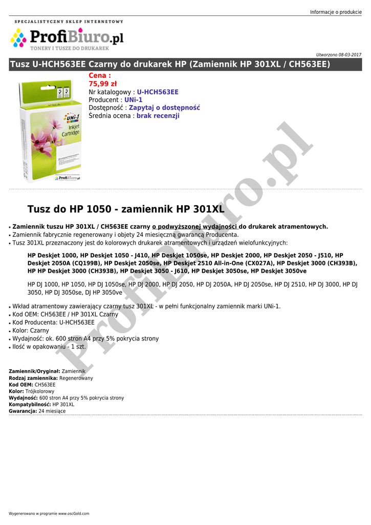 Informacje o produkcie Utworzono 08-03-2017 Tusz U-HCH563EE Czarny do drukarek HP (Zamiennik HP 301XL / CH563EE) Cena : 75,99 zł o. pl Nr katalogowy : U-HCH563EE Producent : UNi-1 Dostępność : Zapytaj o dostępność Średnia ocena : brak recenzji ● ● ● iu r Tusz do HP 1050 - zamiennik HP 301XL Zamiennik tuszu HP 301XL / CH563EE czarny o podwyższonej wydajności do drukarek atramentowych. Zamiennik fabrycznie regenerowany i objety 24 miesięczną gwarancą Producenta. Tusz 301XL przeznaczony jest do kolorowych drukarek atramentowych i urządzeń wielofunkcyjnych: iB HP Deskjet 1000, HP Deskjet 1050 - J410, HP Deskjet 1050se, HP Deskjet 2000, HP Deskjet 2050 - J510, HP Deskjet 2050A (CQ199B), HP Deskjet 2050se, HP Deskjet 2510 All-in-One (CX027A), HP Deskjet 3000 (CH393B), HP HP Deskjet 3000 (CH393B), HP Deskjet 3050 - J610, HP Deskjet 3050se, HP Deskjet 3050ve HP DJ 1000, HP 1050, HP DJ 1050se, HP DJ 2000, HP DJ 2050, HP DJ 2050A, HP DJ 2050se, HP DJ 2510, HP DJ 3000, HP DJ 3050, HP DJ 3050se, DJ HP 3050ve ● ● ● ● Wkład atramentowy zawierający czarny tusz 301XL - w pełni funkcjonalny zamiennik marki UNi-1. Kod OEM: CH563EE / HP 301XL Czarny Kod Producenta: U-HCH563EE Kolor: Czarny Wydajność: ok. 600 stron A4 przy 5% pokrycia strony Ilość w opakowaniu - 1 szt. of ● Pr ● Zamiennik/Oryginał: Zamiennik Rodzaj zamiennika: Regenerowany Kod OEM: CH563EE Kolor: Trójkolorowy Wydajność: 600 stron A4 przy 5% pokrycia strony Kompatybilność: HP 301XL Gwarancja: 24 miesiące Wygenerowano w programie www.oscGold.com