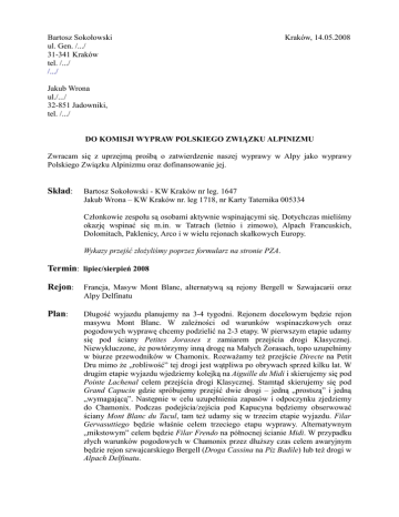 Bartosz Sokołowski ul. Gen. /.../ 31-341 Kraków tel. /.../ /.../ Kraków, 14.05.2008 Jakub Wrona ul./.../ 32-851 Jadowniki, tel. /.../ DO KOMISJI WYPRAW POLSKIEGO ZWIĄZKU ALPINIZMU Zwracam się z uprzejmą prośbą o zatwierdzenie naszej wyprawy w Alpy jako wyprawy Polskiego Związku Alpinizmu oraz dofinansowanie jej. Skład: Bartosz Sokołowski - KW Kraków nr leg. 1647 Jakub Wrona – KW Kraków nr. leg 1718, nr Karty Taternika 005334 Członkowie zespołu są osobami aktywnie wspinającymi się. Dotychczas mieliśmy okazję wspinać się m.in. w Tatrach (letnio i zimowo), Alpach Francuskich, Dolomitach, Paklenicy, Arco i w wielu rejonach skałkowych Europy. Wykazy przejść złożyliśmy poprzez formularz na stronie PZA. Termin: lipiec/sierpień 2008 Rejon: Francja, Masyw Mont Blanc, alternatywą są rejony Bergell w Szwajacarii oraz Alpy Delfinatu Plan: Długość wyjazdu planujemy na 3-4 tygodni. Rejonem docelowym będzie rejon masywu Mont Blanc. W zależności od warunków wspinaczkowych oraz pogodowych wyprawę chcemy podzielić na 2-3 etapy. W pierwszym etapie udamy się pod ściany Petites Jorasses z zamiarem przejścia drogi Klasycznej. Niewykluczone, że powtórzymy inną drogę na Małych Żorasach, topo uzupełnimy w biurze przewodników w Chamonix. Rozważamy też przejście Directe na Petit Dru mimo że „robliwość” tej drogi jest wątpliwa po obrywach sprzed kilku lat. W drugim etapie wyjazdu wjedziemy kolejką na Aiguille du Midi i skierujemy się pod Pointe Lachenal celem przejścia drogi Klasycznej. Stamtąd skierujemy się pod Grand Capucin gdzie spróbujemy przejść dwie drogi – jedną „prostszą” i jedną „wymagającą”. Następnie w celu uzupełnienia zapasów i odpoczynku zjedziemy do Chamonix. Podczas podejścia/zejścia pod Kapucyna będziemy obserwować ściany Mont Blanc du Tacul, tam też udamy się w trzecim etapie wyjazdu. Filar Gervasuttiego będzie właśnie celem trzeciego etapu wyprawy. Alternatywnym „mikstowym” celem będzie Filar Frendo na północnej ścianie Midi. W przypadku złych warunków pogodowych w Chamonix przez dłuższy czas celem awaryjnym będzie rejon szwajcarskiego Bergell (Droga Cassina na Piz Badile) lub też drogi w Alpach Delfinatu. Cele w rejonie Masywu Mont Blanc: Rejon Valee Blanche: • Pilier Gervasutti TD 800m na Mont Blanc du Tacul • Voie Classique ED inf 250m na Point Lachenal alternatywnie • Filar Frendo na północnej ścianie Aiguille du Midi Drogi na Grand Capucin (wybór dwóch dróg): • Voie Bonatti-Ghigo ED sup 350m lubVoyage selon Gulliver ABO inf 350m • Voie des Suisses ED inf 300m lub O sole mio ED 300m Rejon Mer de Glace / Gl. de Leschaux: • Face Ouest Classique TD inf 700m na Petites Jorasses • inna droga na Petites Jorasses – topo uzupełnimy w Chamonix lub • Directe Americane ED 1000m na Petit Dru (rozważamy tę drogę aczkolwiek jesteśmy sceptycznie nastawieni do jej „robliwości”, ostateczną decyzję podejmiemy w Chamonix gdy poznamy warunki panujące na Dru) Alternatywą są rejony szwajcarskiego Bergell (Droga Cassina) oraz Alpy Delfinatu. Materiały: • • • • • "Le topo du massif du Mont Blanc tome II" Michel Piola „The Mont Blanc Range Topo Guide vol. I“ Michel Piola "Góry" czerwiec i sierpień 2005, sierpień 2006 schematy z http://www.climbweb.cz strona http://topo.uka.pl/content/topo/chamonix/chamonix.php Koszty (1 osoba): 1500 zł • • • • Dojazd: 500 zł (przy założeniu jazdy autem 3-ech osób) Wyżywienie: 500 zł (część jedzenia przywieziemy z Polski, część zakupimy w Chamonix) Kolejki linowe: 350 zł (Montenvers 21E i Aiguille du Midi ok 2x38E) Uzupełnienie sprzętu, nieprzewidzianie koszty: 150 zł Zasady finansowania: • • Udział własny: Dofinansowanie PZA: 500 zł 1000 zł Informacje o dofinansowaniach PZA w przeszłości: Bartosz Sokołowski: rejon Chamonix, lipiec/sierpień 2007, dofinansowanie PZA – 400zł Jakub Wrona: rejon Chamonix, zima – luty/marzec 2007, dofinanasowanie PZA - 300zł W imieniu zespołu dziękuję za rozpatrzenie naszej prośby, Z pozdrowieniami, Bartosz Sokołowski