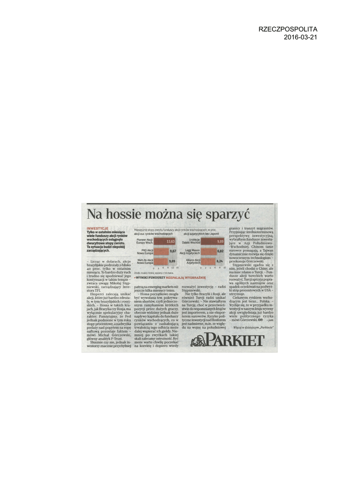 RZECZPOSPOLITA 2016-03-21 Na hossie można się sparzyć INWESTYCJE Tylko w ostatnim miesiącu wiele funduszy akcji rynków wschodzących osiągnęło dwucyfrowe stopy zwrotu. Ta sytuacja budzi niepokój zarządzających. - Licząc w dolarach, akcje brazylijskie podrożały o blisko 40 proc. tylko w ostatnim miesiącu. To bardzo duży ruch i trudno się spodziewać jego kontynuacji w takim tempie zwraca uwagę Mikołaj Stęp niewski, zarządzający Inve stors TFI. Eksperci zalecają unikać akcji, które już bardzo zdroża ły, w tym brazylijskich i rosyj skich. - Hossa w takich kra jach, jak Brazyliaczy Rosja,ma wyłącznie spekulacyjny cha rakter. Pamiętajmy, że Fed jednak podniesie w tym roku stopy procentowe, a nadwyżka podaży nad popytem na ropę naftową pozostaje faktem mówi Michał Górczewski, główny analityk F-Trust. Słusznie czy nie, jednak in westorzy znacznie przychylniej Miesięczne stopy zwrotu funduszy akcji rynków wschodzących, w proc. akcji eur. rynków wschodzących UniAkcje: Daleki Wschód Pioneer Akcji Europy Wscn. 9.67 PKO Akcji Nowa Europa MetLife Akcji Nowa Europa 9,09 0 akcji azjatycykich bez Japonii 3 6 Legg Mason Akcji Azjatyckich Allianz Akcji Azjatyckich 9 12 15 8 10 Źródło: Analizy Online, wyceny z16 marca. •WYNIKI FUNDUSZY ROZPALAJĄ WYOBRAŹNIĘ patrzą na emerging markets niż jeszcze kilka miesięcy temu. - Hossa początkowo mogła być wywołana tzw. pokrywa niem shortów, czyli jednocze snym zamykaniem krótkich pozycji przez dużych graczy, obecnie widzimy jednak duże napływy kapitału do funduszy rynków wschodzących, co w powiązaniu z zaskakującą trwałością tego odbicia może dalej wspierać ich giełdy. Nie mniej po zwyżkach takiej skali zalecamy ostrożność. Być może warto chwilę poczekać na korektę i dopiero wtedy rozważyć inwestycję - radzi Stępniewski. Nie tylko Brazylii i Rosji, ale również Turcji radzi unikać Górczewski. - Nie stawiałbym na Turcję, choć w przeciwień stwie do wspomnianych krajów jest importerem, a nie ekspor terem surowców. Ryzyko poli tyczne inwestycji nad Bosforem jest nadmierne, m.in. ze wzglę du na wojnę na południowej granicy i tranzyt migrantów. Przyjmując średnioterminową perspektywę inwestycyjną, wybrałbym fundusze inwestu jące w Azji Południowo-Wschodniej. Chinom tanie surowce pomagają, a Tajwan dynamicznie rozwija się dzięki nowoczesnym technologiom przekonuje Górczewski. Stępniewski zgadza się z nim, jeżeli chodzi o Chiny, ale ma inne zdanie o Turcji. - Fun dusze akcji tureckich warto rozważyć, Turcji sprzyja popra wa ogólnych nastrojów oraz spadek oczekiwań na podwyż ki stóp procentowych w USA utrzymuje. Ciekawym rynkiem wscho dzącym jest teraz... Polska. Wydaje się, że w przypadku in westycji w naszym kraju wyceny akcji uwzględniają już bardzo wiele politycznego ryzyka - mówi Górczewski. ©® -jam Więcej w dzisiejszym „Parkiecie" TVRKIET