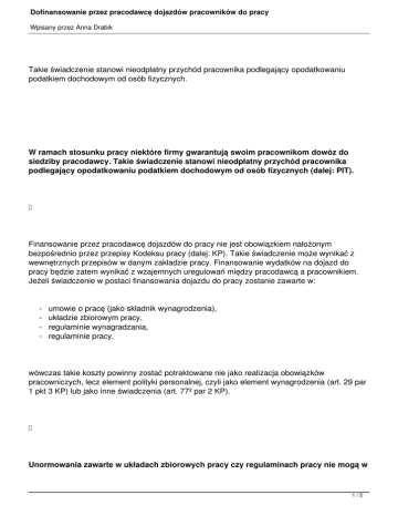 Dofinansowanie przez pracodawcę dojazdów pracowników do pracy Wpisany przez Anna Drabik Takie świadczenie stanowi nieodpłatny przychód pracownika podlegający opodatkowaniu podatkiem dochodowym od osób fizycznych. W ramach stosunku pracy niektóre firmy gwarantują swoim pracownikom dowóz do siedziby pracodawcy. Takie świadczenie stanowi nieodpłatny przychód pracownika podlegający opodatkowaniu podatkiem dochodowym od osób fizycznych (dalej: PIT). Finansowanie przez pracodawcę dojazdów do pracy nie jest obowiązkiem nałożonym bezpośrednio przez przepisy Kodeksu pracy (dalej: KP). Takie świadczenie może wynikać z wewnętrznych przepisów w danym zakładzie pracy. Finansowanie wydatków na dojazd do pracy będzie zatem wynikać z wzajemnych uregulowań między pracodawcą a pracownikiem. Jeżeli świadczenie w postaci finansowania dojazdu do pracy zostanie zawarte w: - umowie o pracę (jako składnik wynagrodzenia), układzie zbiorowym pracy, regulaminie wynagradzania, regulaminie pracy, wówczas takie koszty powinny zostać potraktowane nie jako realizacja obowiązków pracowniczych, lecz element polityki personalnej, czyli jako element wynagrodzenia (art. 29 par 1 pkt 3 KP) lub jako inne świadczenia (art. 77² par 2 KP). Unormowania zawarte w układach zbiorowych pracy czy regulaminach pracy nie mogą w 1/5 Dofinansowanie przez pracodawcę dojazdów pracowników do pracy Wpisany przez Anna Drabik żadnym zakresie oddziaływać i wywierać skutków w sferze obowiązków publicznoprawnych, a w szczególności w zakresie zobowiązań podatkowych. Akty te są zaliczane do źródeł prawa pracy jako kategoria aktów wewnątrzzakładowych. Obowiązują one jedynie na terenie konkretnego zakładu pracy. Dlatego nie mogą zawierać regulacji niezgodnych z obowiązującymi przepisami prawa. Zdarza się jednak, iż pracodawca niezależnie od regulacji wewnątrzzakładowych decyduje się na finansowanie dojazdów do pracy swoim pracownikom. W świetle ustawy o podatku dochodowym od osób fizycznych (dalej: UPDOF) finansowanie przez pracodawcę dojazdów do pracy stanowi nieodpłatne świadczenie dla pracownika. Zgodnie z art. 12 UPDOF za przychody ze stosunku służbowego, stosunku pracy, pracy nakładczej oraz spółdzielczego stosunku pracy uważa się wszelkiego rodzaju wypłaty pieniężne oraz wartość pieniężną świadczeń w naturze bądź ich ekwiwalenty, bez względu na ich źródło finansowania, a w szczególności: wynagrodzenia zasadnicze, wynagrodzenia za nadgodziny, różnego rodzaju dodatki, nagrody, ekwiwalenty za niewykorzystany urlop i inne kwoty niezależnie od tego, czy ich wysokość została z góry ustalona, a ponadto świadczenia pieniężne ponoszone za pracownika, jak też wartość innych nieodpłatnych lub świadczeń częściowo odpłatnych. Opodatkowaniu podatkiem dochodowym podlegają wszelkiego rodzaju dochody, z wyjątkiem dochodów wymienionych w art. 21 UPDOF i zwolnionych od podatku na podstawie odrębnych przepisów. Z kolei zgodnie z art. 11 ust. 1 UPDOF do przychodów podatnika zaliczone są otrzymane lub postawione do dyspozycji podatnika w roku kalendarzowym pieniądze i wartości pieniężne oraz wartość otrzymanych świadczeń w naturze i innych nieodpłatnych świadczeń. Zatem wartość otrzymanego od pracodawcy świadczenia w postaci sfinansowania przewozu pracownika do pracy stanowi przychód pracownika ze stosunku pracy, o którym mowa w art. 12 ust. 1 UPDOF, podlegający opodatkowaniu podatkiem dochodowym. 2/5 Dofinansowanie przez pracodawcę dojazdów pracowników do pracy Wpisany przez Anna Drabik Kwestia finansowania przez pracodawców przewozów pracowników była niejednokrotnie przedmiotem interpretacji wydawanych przez organy podatkowe oraz przedmiotem sporów rozstrzyganych przez sądy. Zdaniem organów skarbowych finansowanie przez pracodawcę przewozu pracowników to świadczenie, które polega na samym zakupieniu możliwości korzystania przez pracowników z przewozu i to wartość owej możliwości powinna stanowić przychód dla poszczególnych pracowników. Takie stanowisko zaprezentował m.in. dyrektor Izby Skarbowej w Poznaniu w interpretacji indywidualnej z dnia 29 kwietnia 2008 r., sygn. ILPB1/415-85/08-2/RP: (...) o powstaniu obowiązku podatkowego po stronie pracownika nie decyduje to, ile razy pracownik faktycznie skorzystał z przewozu zorganizowanego przez zakład pracy (w ramach umowy z przewoźnikiem) ale sam fakt otrzymania od pracodawcy świadczenia w postaci możliwości korzystania z wykupionej u przewoźnika usługi. Nie ma zatem problemu z ustaleniem wartości przychodu przypadającego imiennie na pracownika. Z przytoczonej interpretacji wynika, iż pracodawca bez problemu jest w stanie zidentyfikować pracowników korzystających z przewozów, natomiast okoliczność czy pracownicy ci w równym stopniu będą korzystać z wykupionego przez pracodawcę świadczenia pozostaje bez znaczenia dla powstania po ich stronie przychodu z tego tytułu. Wartość otrzymanego od pracodawcy nieodpłatnego świadczenia stanowi przychód dla pracownika z tytułu stosunku pracy pod warunkiem, iż możliwe jest ustalenie wartości tego świadczenia przypadającego na poszczególnych pracowników. Udowodnienie jednak, iż niemożliwe jest przypisanie poszczególnym pracownikom kwoty przychodu jest niezwykle trudne przed organami skarbowymi. Zgodnie z wyrokiem Naczelnego Sądu Administracyjnego z dnia 3 czerwca 1998 r., sygn. akt I SA/Ka 1719/96 (...) ewentualne trudności towarzyszące 3/5 Dofinansowanie przez pracodawcę dojazdów pracowników do pracy Wpisany przez Anna Drabik indywidualizacji świadczeń na rzecz poszczególnych pracowników mają charakter drugorzędny i nie mogą wpływać na byt i zakres obowiązku podatkowego . Dlatego obowiązkiem pracodawcy organizującego przewóz pracowników jest dołożenie wszelkich starań w celu przypisania poszczególnych pracownikom kwot przychodu z tego tytu