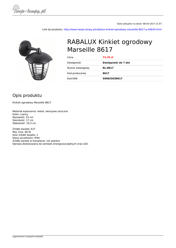 Dane aktualne na dzień: 08-03-2017 21:07 Link do produktu: http://www.twoje-lampy.pl/rabalux-kinkiet-ogrodowy-marseille-8617-p-40834.html RABALUX Kinkiet ogrodowy Marseille 8617 Cena 73,70 zł Dostępność Dostępność do 7 dni Numer katalogowy RL-8617 Kod producenta 8617 Kod EAN 599825038617 Opis produktu Kinkiet ogrodowy Marseille 8617 Materiał wykonania: metal, tworzywo sztuczne Kolor: czarny Wysokość: 23 cm Szerokość: 17 cm Głębokość: 19,3 cm Źródło światła: E27 Moc max: 60 W Ilość źródeł światła: 1 Klasa szczelności: IP44 Źródło światła w komplecie: nie zawiera Oprawa dostosowana do żarówek energooszczędnych oraz LED. wygenerowano w programie shopGold Powered by TCPDF (www.tcpdf.org)