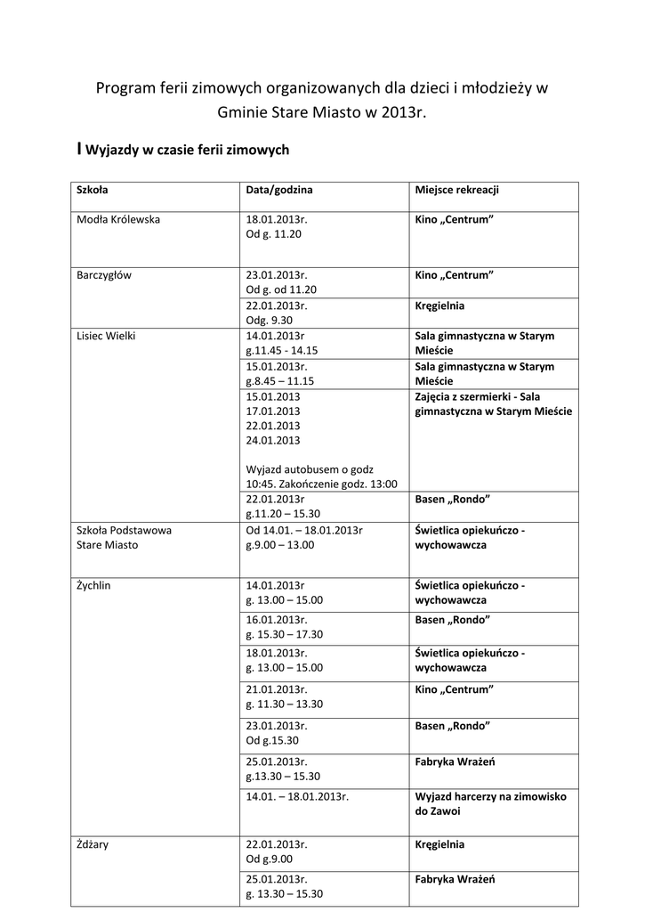 Program ferii zimowych organizowanych dla dzieci i młodzieży w Gminie Stare Miasto w 2013r. I Wyjazdy w czasie ferii zimowych Szkoła Data/godzina Miejsce rekreacji Modła Królewska 18.01.2013r. Od g. 11.20 Kino „Centrum” Barczygłów 23.01.2013r. Od g. od 11.20 22.01.2013r. Odg. 9.30 14.01.2013r g.11.45 - 14.15 15.01.2013r. g.8.45 – 11.15 15.01.2013 17.01.2013 22.01.2013 24.01.2013 Kino „Centrum” Lisiec Wielki Szkoła Podstawowa Stare Miasto Żychlin Żdżary Wyjazd autobusem o godz 10:45. Zakończenie godz. 13:00 22.01.2013r g.11.20 – 15.30 Od 14.01. – 18.01.2013r g.9.00 – 13.00 Kręgielnia Sala gimnastyczna w Starym Mieście Sala gimnastyczna w Starym Mieście Zajęcia z szermierki - Sala gimnastyczna w Starym Mieście Basen „Rondo” Świetlica opiekuńczo wychowawcza 14.01.2013r g. 13.00 – 15.00 Świetlica opiekuńczo wychowawcza 16.01.2013r. g. 15.30 – 17.30 Basen „Rondo” 18.01.2013r. g. 13.00 – 15.00 Świetlica opiekuńczo wychowawcza 21.01.2013r. g. 11.30 – 13.30 Kino „Centrum” 23.01.2013r. Od g.15.30 Basen „Rondo” 25.01.2013r. g.13.30 – 15.30 Fabryka Wrażeń 14.01. – 18.01.2013r. Wyjazd harcerzy na zimowisko do Zawoi 22.01.2013r. Od g.9.00 Kręgielnia 25.01.2013r. g. 13.30 – 15.30 Fabryka Wrażeń