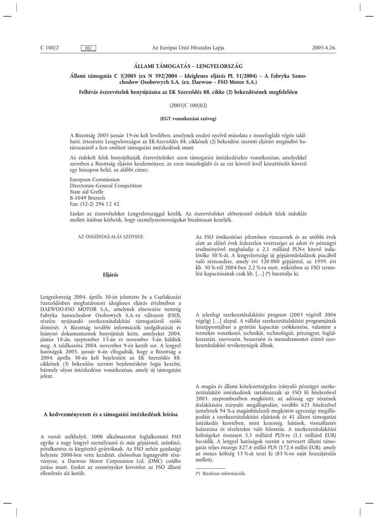 C 100/2 Az Európai Unió Hivatalos Lapja HU 2005.4.26. ÁLLAMI TÁMOGATÁS – LENGYELORSZÁG Állami támogatás C 3/2005 (ex N 592/2004 – Ideiglenes eljárás PL 51/2004) – A Fabryka Samochodow Osobowych S.A. (ex. Daewoo – FSO Motor S.A.) Felhívás észrevételek benyújtására az EK Szerződés 88. cikke (2) bekezdésének megfelelően (2005/C 100/02) (EGT vonatkozású szöveg) A Bizottság 2005 január 19-én kelt levelében, amelynek eredeti nyelvű másolata e összefoglaló végén található, értesítette Lengyelországot az EK-Szerződés 88. cikkének (2) bekezdése szerinti eljárást megindító határozatáról a fent említett támogatási intézkedések miatt. Az érdekelt felek benyújthatják észrevételeiket azon támogatási intézkedésekre vonatkozóan, amelyekkel szemben a Bizottság eljárást kezdeményez, az ezen összefoglaló és az ezt követő levél közzétételét követő egy hónapon belül, az alábbi címre: European Commission Directorate-General Competition State aid Greffe B-1049 Brussels Fax: (32-2) 296 12 42 Ezeket az észrevételeket Lengyelországgal közlik. Az észrevételeket előterjesztő érdekelt felek indoklás mellett írásban kérhetik, hogy személyazonosságukat bizalmasan kezeljék. AZ ÖSSZEFOGLALÁS SZÖVEGE Eljárás Lengyelország 2004. április 30-án jelentette be a Csatlakozási Szerződésben meghatározott ideiglenes eljárás értelmében a DAEWOO-FSO MOTOR S.A., amelynek elnevezése nemrég Fabryka Samochodow Osobowych S.A.-ra változott (FSO), részére nyújtandó szerkezetátalakítási támogatásról szóló döntését. A Bizottság további információk szolgáltatását és hiányzó dokumentumok benyújtását kérte, amelyeket 2004. június 18-án, szeptember 13-án és november 3-án küldtek meg. A találkozóra 2004. november 9-én került sor. A lengyel hatóságok 2005. január 6-án elfogadták, hogy a Bizottság a 2004. április 30-án kelt bejelentést az EK Szerződés 88. cikkének (3) bekezdése szerinti bejelentésként fogja kezelni, bármely olyan intézkedésre vonatkozóan, amely új támogatást jelent. A kedvezményezett és a támogatási intézkedések leírása A varsói székhelyű, 3000 alkalmazottat foglalkoztató FSO egyike a nagy lengyel személyautó és más gépjármű, utánfutó, pótalkatrész és kiegészítő gyártóknak. Az FSO nehéz gazdasági helyzete 2000-ben vette kezdetét, elsősorban legnagyobb részvényese, a Daewoo Motor Corporation Ltd. (DMC) csődbe jutása miatt. Ezeket az eseményeket követően az FSO állami ellenőrzés alá került. Az FSO értékesítései jelentősen visszaestek és az utóbbi évek alatt az előző évek fedezetlen veszteségei az adott év pénzügyi eredményével meghaladja a 2,1 milliárd PLN-t kitevő indulótőke 50 %-át. A lengyelországi új gépjárműeladások piacából való részesedése, amely évi 320 000 gépjármű, az 1999. évi kb. 30 %-ról 2004-ben 2,2 %-ra esett, miközben az FSO termelési kapacitásának csak kb. […] (*) használja ki. A jelenlegi szerkezatátalakítási program (2003 végétől 2006 végéig) […] alapul. A vállalat szerkezetátalakítási programjának középpontjában a gyártási kapacitás csökkentése, valamint a termékre vonatkozó, technikát, technológiát, pénzügyet, foglalkoztatást, szervezést, beszerzést és menedzsmentet érintő szerkezetátalakító tevékenységek állnak. A magán és állami kötelezettségekre irányuló pénzügyi szerkezetátalakító intézkedések tartalmazzák az FSO fő hitelezőivel 2003. szeptemberében megkötött, az adósság egy részének átalakítására irányuló megállapodást, további 621 hitelezővel (amelynek 94 %-a magánhitelező) megkötött egyezségi megállapodást a szerkezetátalakítási eljárások és 41 állami támogatási intézkedés keretében, mint kezesség, leírások, visszafizetés halasztása és részletekre való felosztás. A szerkezetátalakítási költségeket összesen 5,5 milliárd PLN-re (1,1 milliárd EUR) becsülik. A lengyel hatóságok szerint a tervezett állami támogatás teljes összege 827,6 millió PLN (172,4 millió EUR), amely az összes költség 15 %-át teszi ki (85 %-os saját hozzájárulás mellett). (*) Bizalmas információk. 2005.4.26. Az Európai Unió Hivatalos Lapja HU Értékelés A rendelkezésre álló információk alapján a Bizottság megállapította, hogy: a) egyes intézkedéseket (kb. 35 millió EUR) már korábban támogattak és azok így nem alkalmazhatók a csatlakozás után; C 100/3 (2) Elkerülték-e a verseny indokolatlan torzulását, mivel a lengyel hatóságok nem szolgáltattak elégséges információt a piac esetleges túlkínálatos állapotáról, valamint a lehetséges kompenzációs intézkedésekről; (3) a támogatás nyújtását szigorúan az FSO szerkezetátalakításának szükséges szintjére korlátozták-e, mivel egyes támogatási intézkedések inkább a befektető számára vonzóbbak a szükséges minimumra korlátozott szerkezetátalakítási támogatásnál; és (4) tiszteletben tartották-e az ún. egyszer és mindenkorra elvet. b) A 138 millió eurót kitevő fennmaradó intézkedéseket nem támogatták a csatlakozás előtt és így ezek új támogatást jelentenek. Különös tekintettel az a) alpont intézkedéseire, a Bizottság megállapította, hogy valamennyi támogatási intézkedést 2004. január 22. és április 30. között, vagyis a csatlakozás előtt támogatták. A lengyel hatóságok rendelkezésre bocsátották az érintett állami intézmények és az FSO között megkötött megállapodások, valamint az állami hatóságokat a csatlakozás előtti meghatározott támogatási összegek nyújtására kötelező, az érintett állami intézmények határozatainak vagy végleges jogi aktusok másolatait. Ezek a dokumentumok tartalmazták az állami támogatások összegét és további, a támog