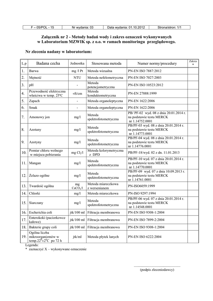 F – 05/POL - 15 Nr wydania: 03 Data wydania: 01.10.2012 Strona/stron: 1/1 Załącznik nr 2 - Metody badań wody i zakres oznaczeń wykonywanych w Laboratorium MZWIK sp. z o.o. w ramach monitoringu przeglądowego. Nr zlecenia nadany w laboratorium: Badana cecha L.p 1. Barwa 2. Mętność Jednostka mg /l Pt NTU Stosowana metoda Numer normy/procedury Metoda wizualna PN-EN ISO 7887:2012 Metoda nefelometryczna PN-EN ISO 7027:2003 Metoda potencjometryczna Metoda konduktometryczna 3. pH 4. Przewodność elektryczna właściwa w temp. 25ºC 5. Zapach - Metoda organoleptyczna PN-EN 1622:2006 6. Smak - Metoda organoleptyczna PN-EN 1622:2006 7. Amonowy jon mg/l Metoda spektrofotometryczna 8. Azotany mg/l Metoda spektrofotometryczna 9. Azotyny mg/l Metoda spektrofotometryczna Pomiar chloru wolnego 10. w miejscu pobierania µS/cm mg Cl2/l Metoda kolorymetryczna z DPD 11. Mangan mg/l Metoda spektrofotometryczna 12. Żelazo ogólne mg/l Metoda spektrofotometryczna PN-EN ISO 10523:2012 PN-EN 27888:1999 PB/ PF-02 wyd. 08 z dnia 20.01.2014 r. na podstawie testu MERCK nr 1.14752.0001 PB/PF-03 wyd. 08 z dnia 20.01.2014 r. na podstawie testu MERCK nr 1.14773.0001 PB/PF-04 wyd. 08 z dnia 20.01.2014 r. na podstawie testu MERCK nr 1.14776.0001 PB/PF-18/wyd. 02 z dn. 11.01.2013 PB/PF-10 wyd. 07 z dnia 20.01.2014 r. na podstawie testu MERCK nr 1.14770.0001 PB/PF-09 wyd. 07 z dnia 10.09.2013 r. na podstawie testu MERCK nr 1.14761.0001 CaCO3/l Metoda miareczkowa z wersenianem PN-ISO6059:1999 14. Chlorki mg/l Metoda miareczkowa PN-ISO 9297:1994 15. Siarczany mg/l Metoda spektrofotometryczna PB/PF-06 wyd. 07 z dnia 20.01.2014 r. na podstawie testu MERCK nr 1.14548.0001 13. Twardość ogólna 16. Escherichia coli Enterokoki (paciorkowce 17. kałowe) 18. Bakterie grupy coli mg jtk/100 ml Filtracja membranowa PN-EN ISO 9308-1:2004 jtk/100 ml Filtracja membranowa PN-EN ISO 7899-2:2004 jtk/100 ml Filtracja membranowa PN-EN ISO 9308-1:2004 Ogólna liczba 19. mikroorganizmów w jtk/ml Metoda płytek lanych temp.220±20C po 72 h Legenda: * zaznaczyć X – wykonywane oznaczenie PN-EN ISO 6222:2004 .................................................... (podpis zleceniodawcy) Zakres *