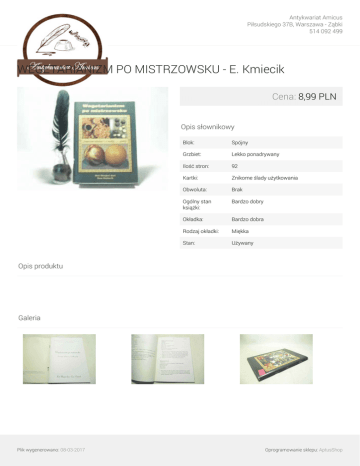 Antykwariat Amicus Piłsudskiego 37B, Warszawa - Ząbki 514 092 499 WEGETARIANIZM PO MISTRZOWSKU - E. Kmiecik Cena: 8,99 PLN Opis słownikowy Blok: Spójny Grzbiet: Lekko ponadrywany Ilość stron: 92 Kartki: Znikome ślady użytkowania Obwoluta: Brak Ogólny stan książki: Bardzo dobry Okładka: Bardzo dobra Rodzaj okładki: Miękka Stan: Używany Opis produktu Galeria Plik wygenerowano: 08-03-2017 Powered by TCPDF (www.tcpdf.org) Oprogramowanie sklepu: AptusShop
