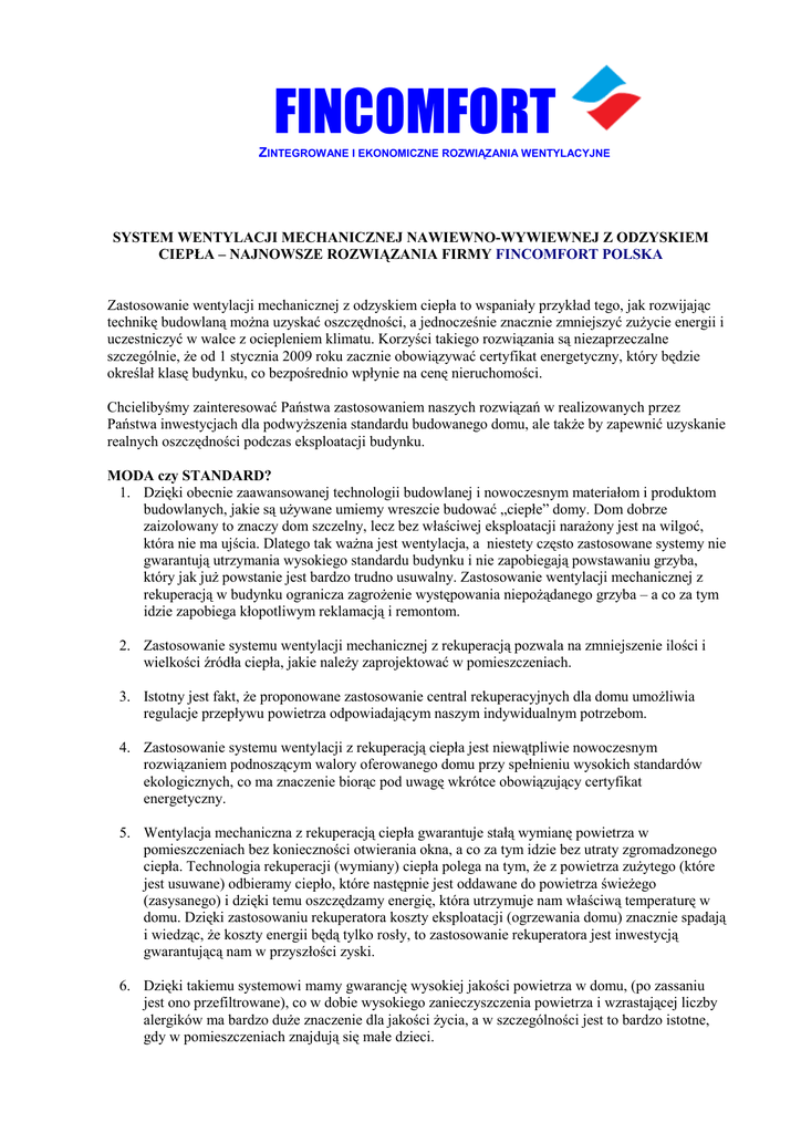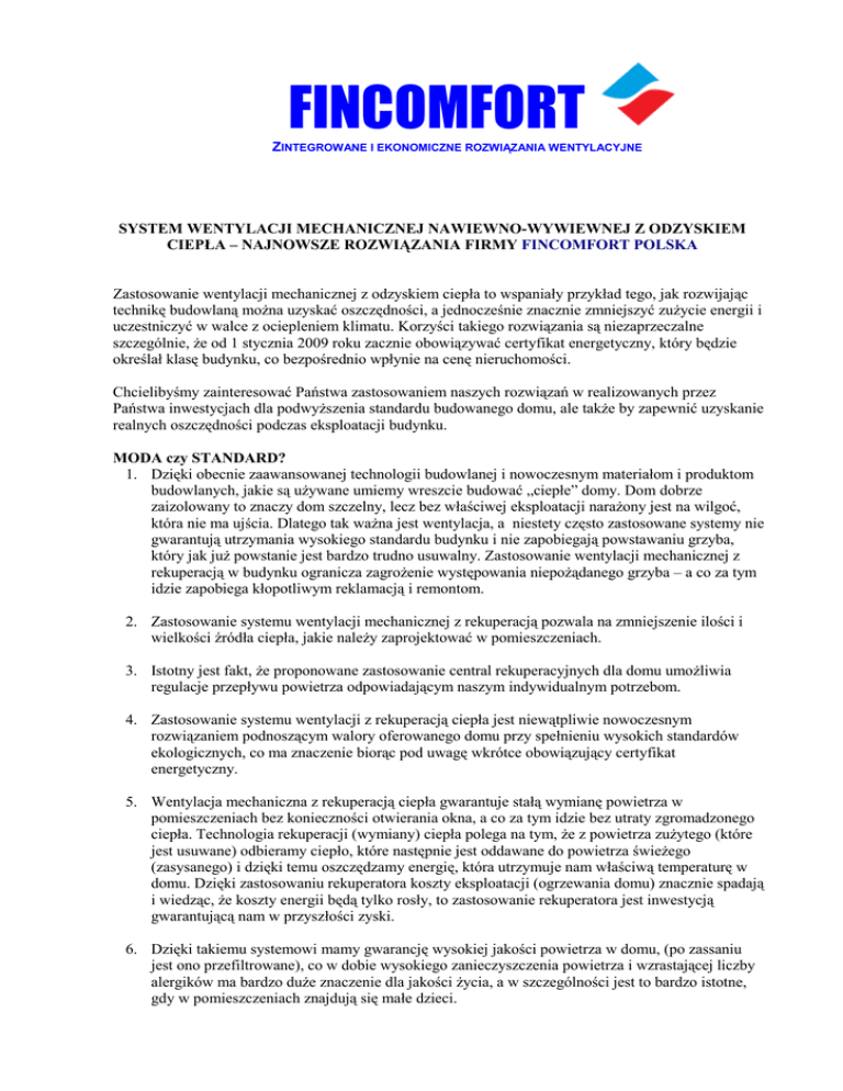 FINCOMFORT ZINTEGROWANE I EKONOMICZNE ROZWIĄZANIA WENTYLACYJNE SYSTEM WENTYLACJI MECHANICZNEJ NAWIEWNO-WYWIEWNEJ Z ODZYSKIEM CIEPŁA – NAJNOWSZE ROZWIĄZANIA FIRMY FINCOMFORT POLSKA Zastosowanie wentylacji mechanicznej z odzyskiem ciepła to wspaniały przykład tego, jak rozwijając technikę budowlaną moŜna uzyskać oszczędności, a jednocześnie znacznie zmniejszyć zuŜycie energii i uczestniczyć w walce z ociepleniem klimatu. Korzyści takiego rozwiązania są niezaprzeczalne szczególnie, Ŝe od 1 stycznia 2009 roku zacznie obowiązywać certyfikat energetyczny, który będzie określał klasę budynku, co bezpośrednio wpłynie na cenę nieruchomości. Chcielibyśmy zainteresować Państwa zastosowaniem naszych rozwiązań w realizowanych przez Państwa inwestycjach dla podwyŜszenia standardu budowanego domu, ale takŜe by zapewnić uzyskanie realnych oszczędności podczas eksploatacji budynku. MODA czy STANDARD? 1. Dzięki obecnie zaawansowanej technologii budowlanej i nowoczesnym materiałom i produktom budowlanych, jakie są uŜywane umiemy wreszcie budować „ciepłe” domy. Dom dobrze zaizolowany to znaczy dom szczelny, lecz bez właściwej eksploatacji naraŜony jest na wilgoć, która nie ma ujścia. Dlatego tak waŜna jest wentylacja, a niestety często zastosowane systemy nie gwarantują utrzymania wysokiego standardu budynku i nie zapobiegają powstawaniu grzyba, który jak juŜ powstanie jest bardzo trudno usuwalny. Zastosowanie wentylacji mechanicznej z rekuperacją w budynku ogranicza zagroŜenie występowania niepoŜądanego grzyba – a co za tym idzie zapobiega kłopotliwym reklamacją i remontom. 2. Zastosowanie systemu wentylacji mechanicznej z rekuperacją pozwala na zmniejszenie ilości i wielkości źródła ciepła, jakie naleŜy zaprojektować w pomieszczeniach. 3. Istotny jest fakt, Ŝe proponowane zastosowanie central rekuperacyjnych dla domu umoŜliwia regulacje przepływu powietrza odpowiadającym naszym indywidualnym potrzebom. 4. Zastosowanie systemu wentylacji z rekuperacją ciepła jest niewątpliwie nowoczesnym rozwiązaniem podnoszącym walory oferowanego domu przy spełnieniu wysokich standardów ekologicznych, co ma znaczenie biorąc pod uwagę wkrótce obowiązujący certyfikat energetyczny. 5. Wentylacja mechaniczna z rekuperacją ciepła gwarantuje stałą wymianę powietrza w pomieszczeniach bez konieczności otwierania okna, a co za tym idzie bez utraty zgromadzonego ciepła. Technologia rekuperacji (wymiany) ciepła polega na tym, Ŝe z powietrza zuŜytego (które jest usuwane) odbieramy ciepło, które następnie jest oddawane do powietrza świeŜego (zasysanego) i dzięki temu oszczędzamy energię, która utrzymuje nam właściwą temperaturę w domu. Dzięki zastosowaniu rekuperatora koszty eksploatacji (ogrzewania domu) znacznie spadają i wiedząc, Ŝe koszty energii będą tylko rosły, to zastosowanie rekuperatora jest inwestycją gwarantującą nam w przyszłości zyski. 6. Dzięki takiemu systemowi mamy gwarancję wysokiej jakości powietrza w domu, (po zassaniu jest ono przefiltrowane), co w dobie wysokiego zanieczyszczenia powietrza i wzrastającej liczby alergików ma bardzo duŜe znaczenie dla jakości Ŝycia, a w szczególności jest to bardzo istotne, gdy w pomieszczeniach znajdują się małe dzieci. 7. System ten zapewnia stałą temperaturę we wszystkich pomieszczeniach. Nie ma sytuacji, Ŝe w jednym pokoju jest chłodniej (bo np. okno otwarte), a w drugim jest duszno. 8. Wentylacja mechaniczna z rekuperacją gwarantuje utrzymanie dobrej wartości rynkowej domu w przyszłości, gdyŜ dom będzie spełniał obowiązujące normy ochrony środowiska i energetyczne. Firma Fincomfort posiadająca długoletnie doświadczenie w zakresie wentylacji mechanicznej nawiewnowywiewnej z rekuperacją ciepła ścisło współpracuje z najwyŜszej klasy specjalistami w tej dziedzinie, gwarantując swoim klientom profesjonalną obsługę i wysoki standard realizacji całego systemu. Fachowość i duŜy zasób wiedzy w tym zakresie są bardzo istotne by system działał poprawnie. Stąd ogromne znaczenia ma sam projekt systemu. Nie moŜna takiego systemu wykonać bez projektu opracowanego przez specjalistę projektanta w zakresie wentylacji, który właściwie rozplanuje kanały wentylacyjne, uwzględniając ilość i prędkości przepływu powietrza, co w rezultacie pozwoli na dokonanie doboru najstosowniejszej centrali rekuperacyjnej. RADY dla UśYTKOWNIKA Decydując się na system wentylacji mechanicznej z rekuperacją ciepła dobrze jest 1. zapoznać się z dostępną ofertą na rynku; 2. wybrać firmę specjalizującą się w tego typu systemach; 3. zapoznać się z danymi technicznymi poszczególnych central rekuperacyjnych; 4. sprawdzić zakres oferowanych usług przez firmę (projekt, dobór materiałów, montaŜ, serwis); 5. upewnić się, Ŝe montowane kanały wentylacyjne będą kanałami sztywnymi (nie miękkimi); Na rynku dostępnych jest wiele róŜnych central, lecz pamiętajmy by nie kierować się jedynie ceną. Inwestując w system wentylacji mechanicznej z rekuperacją musimy zwrócić uwagę na róŜnice poszczególnych rekuperatorów i ich realny poziom odzysku ciepła, co stanowi dla nas podstawę do wyliczenia okresu zwrotu poniesionych nakładów inwestycyjnych. Warto teŜ mieć świadomość, Ŝe dostępne są juŜ na rynku polskim rekuperatory (np. ILTO), które umoŜliwiają nam odzysk ciepła znad kominka, czy teŜ rekuperatory, które moŜemy podłączyć pod ogrzewanie CO lub ogrzewanie wodne podłogowe. Dokonując wyboru centrali naleŜy zwrócić uwagę na: - poziom hałasu rekuperatora – bardzo waŜny czynnik zapewniający komfort eksploatacji, dostępne są bardzo ciche systemy, które nie „buczą” w czasie pracy; - zuŜycie energii przez sam rekuperator; - moŜliwość podłączenia rekuperatora pod okap kuchenny (dodatkowe wykorzystanie ciepła znad kuchni); - ilość biegów pracy rekup