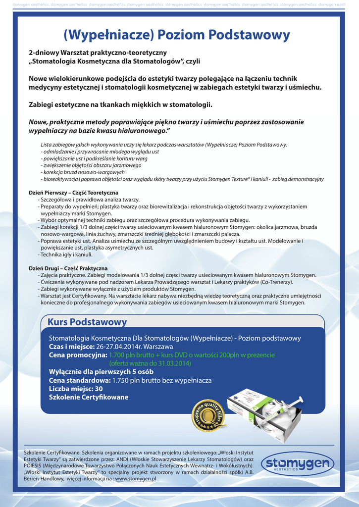 stomygen aesthetics stomygen aesthetics stomygen aesthetics stomygen aesthetics stomygen aesthetics stomygen aesthetics stomygen aesthetics stomygen aesthetics stomygen aesthetics (Wypełniacze) Poziom Podstawowy 2-dniowy Warsztat praktyczno-teoretyczny „Stomatologia Kosmetyczna dla Stomatologów”, czyli Nowe wielokierunkowe podejścia do estetyki twarzy polegające na łączeniu technik medycyny estetycznej i stomatologii kosmetycznej w zabiegach estetyki twarzy i uśmiechu. Zabiegi estetyczne na tkankach miękkich w stomatologii. Nowe, praktyczne metody poprawiające piękno twarzy i uśmiechu poprzez zastosowanie wypełniaczy na bazie kwasu hialuronowego.” Lista zabiegów jakich wykonywania uczy się lekarz podczas warsztatów (Wypełniacze) Poziom Podstawowy: - odmładzanie i przywracanie młodego wyglądu ust - powiększanie ust i podkreślanie konturu warg - zwiększenie objętości obszaru jarzmowego - korekcja bruzd nosowo-wargowych - bioreaktywacja i poprawa objętości oraz wyglądu skóry twarzy przy użyciu Stomygen Texture® i kaniuli - zabieg demonstracyjny Dzień Pierwszy – Część Teoretyczna - Szczegółowa i prawidłowa analiza twarzy. - Preparaty do wypełnień; plastyka twarzy oraz biorewitalizacja i rekonstrukcja objętości twarzy z wykorzystaniem wypełniaczy marki Stomygen. - Wybór optymalnej techniki zabiegu oraz szczegółowa procedura wykonywania zabiegu. - Zabiegi korekcji 1/3 dolnej części twarzy usieciowanym kwasem hialuronowym Stomygen: okolica jarzmowa, bruzda nosowo-wargowa, linia żuchwy, zmarszczki średniej głębokości i zmarszczki palacza. - Poprawa estetyki ust. Analiza uśmiechu ze szczególnym uwzględnieniem budowy i kształtu ust. Modelowanie i powiększanie ust, plastyka asymetrycznych ust. - Technika igły i kaniuli. Dzień Drugi – Część Praktyczna - Zajęcia praktyczne. Zabiegi modelowania 1/3 dolnej części twarzy usieciowanym kwasem hialuronowym Stomygen. - Ćwiczenia wykonywane pod nadzorem Lekarza Prowadzącego warsztat i Lekarzy praktyków (Co-Trenerzy). - Zabiegi wykonywane wyłącznie z użyciem produktów Stomygen. - Warsztat jest Certyfikowany. Na warsztacie lekarz nabywa niezbędną wiedzę teoretyczną oraz praktyczne umiejętności konieczne do profesjonalnego wykonywania zabiegów usieciowanym kwasem hialuronowym marki Stomygen. Kurs Podstawowy Stomatologia Kosmetyczna Dla Stomatologów (Wypełniacze) - Poziom podstawowy Czas i miejsce: 26-27.04.2014r. Warszawa Cena promocyjna: 1.700 pln brutto + kurs DVD o wartości 200pln w prezencie (oferta ważna do 31.03.2014) Wyłącznie dla pierwszych 5 osób Cena standardowa: 1.750 pln brutto bez wypełniacza Liczba miejsc: 30 Szkolenie Certyfikowane supr em e r y fille alit qu r y fille alit qu supr em e r y fille alit qu supr em e Q r y fille alit qu supr em e Szkolenie Certyfikowane. Szkolenia organizowane w ramach projektu szkoleniowego: „Włoski Instytut Estetyki Twarzy” są zatwierdzone przez: ANDI (Włoskie Stowarzyszenie Lekarzy Stomatologów) oraz POIESIS (Międzynarodowe Towarzystwo Połączonych Nauk Estetycznych Wewnątrz- i Wokółustnych). „Włoski Instytut Estetyki Twarzy” to specjalny projekt stworzony w ramach działalności spółki A.B. Berren-Handlowy, więcej informacji na : www.stomygen.pl stomygen aesthetics stomygen aesthetics stomygen aesthetics stomygen aesthetics stomygen aesthetics stomygen aesthetics stomygen aesthetics stomygen aesthetics stomygen aesthetics st