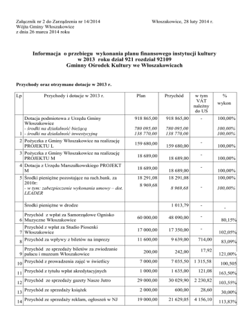 Załącznik nr 2 do Zarządzenia nr 14/2014 Wójta Gminy Włoszakowice z dnia 26 marca 2014 roku Włoszakowice, 28 luty 2014 r. Informacja o przebiegu wykonania planu finansowego instytucji kultury w 2013 roku dział 921 rozdział 92109 Gminny Ośrodek Kultury we Włoszakowicach Przychody oraz otrzymane dotacje w 2013 r. Lp Przychody i dotacje w 2013 r. Plan Przychód Dotacja podmiotowa z Urzędu Gminy Włoszakowice - środki na działalność bieżącą 1 - środki na działalność inwestycyjną 918 865,00 918 865,00 780 095,00 138 770,00 780 095,00 138 770,00 2 Pożyczka z Gminy Włoszakowice na realizację PROJEKTU L 159 680,00 159 680,00 3 Pożyczka z Gminy Włoszakowice na realizację PROJEKTU M 18 689,00 18 689,00 4 Dotacja z Urzędu Marszałkowskiego PROJEKT M 18 689,00 18 689,00 18 291,08 18 291,08 5 Środki pieniężne pozostające na rach.bank. za 2010r: - w tym: zabezpieczenie wykonania umowy – dot. LEADER 8 969,68 Środki pieniężne w drodze w tym VAT należny do US - % wykon 100,00% 100,00% 100,00% - 100,00% 100,00% 100,00% 100,00% 8 969,68 - 100,00% 1 013,79 - - Przychód z wpłat za Samorządowe Ognisko 6 Muzyczne Włoszakowice 60 000,00 48 090,00 - Przychód z wpłat za Studio Piosenki 7 Włoszakowice 17 000,00 17 350,00 - 8 Przychód za wpływy z biletów na imprezy 11 600,00 9 639,00 714,00 200,00 242,00 17,92 10 Przychód z prowadzenia zajęć w świetlicy 7 000,00 7 035,50 1 315,58 100,505 11 Przychód z tytułu wpłat akredytacyjnych 1 000,00 1 635,00 121,08 163,50% 29 000,00 30 029,90 2 230,82 103,55% 2 000,00 600,00 28,60 30,00% 19 000,00 21 629,05 4 156,10 113,83% Przychód ze sprzedaży biletów za zwiedzanie 9 pałacu i muzeum Włoszakowice 12 Przychód ze sprzedaży gazety Nasze Jutro 13 Przychód ze sprzedaży książek 14 Przychód ze sprzedaży reklam, ogłoszeń w NJ 80,15% 102,05% 83,09% 121,00% Lp Przychody i dotacje w 2013 r. 15 Wynajem pokoi gościnnych 16 Przychód z tytułu wysyłki gazety NJ i książek 17 Wynajem sal w gminie Włoszakowice Plan Wynajem sprzętu pozostałego wykon 2 205,57 124,15% 200,00 81,60 5,72 40,80% 33 0000,00 31 204,20 5 482,42 94,55% 834,00 177,90 11 878,58 2 274,58 791,73 72,72 781,48 146,12 505,59 94,54 20 Przychód za usługę transportową 270,00 22 Przychód za usługę telekomunikacyjną 23 Odsetki bankowe na rachunku bankowym 250,00 258,22 - Odsetki za nieterminowe regulowanie należności 24 SOM i SP 200,00 273,59 - Pozostałe przychody operacyjne – sprzedaż 25 środków trwałych % 11 795,00 5 000,00 21 Przychód za energię elektryczną w tym VAT należny do US 9 500,00 18 Wynajem stołów i krzeseł 19 Przychód 72,00 237,57% 289,43% 103,28% 136,79% - - 26 Rozliczenia międzyokresowe przychodów 330,00 - - 27 Mylne wpłaty i wypłaty 158,82 - - Ogółem 1 329 434,08 1 330 443,13 19 043,67 100,07% Wykonanie planu finansowego Gminnego Ośrodka Kultury w 2013 roku przebiegło prawidłowo. Na dzień 1 stycznia 2013 r. na rachunku bankowym pozostała kwota 18 291,08 zł, w tym 8 969,68 zł to część zabezpieczenia wykonania umowy w związku z przeprowadzoną inwestycją, a stan kasy (tj. środków pieniężnych w drodze) wyniósł 1 013,79 zł. Z kolei na koniec 2013 roku stan środków pieniężnych na rachunku bankowym wyniósł 33 360,18 zł. W omawianym roku Gminny Ośrodek Kultury uzyskał dotacje z Urzędu Gminy Włoszakowice na działalność bieżącą w wysokości 780 095,00 zł oraz działalność inwestycyjną w wysokości 138 770,00 zł. Oprócz tego otrzymał pożyczkę od organizatora na pokrycie kosztów kwalifikowalnych inwestycji współfinansowanych z Urzędu Marszałkowskiego, realizowanych w 2013 roku: − zgodnie z umową pożyczki nr 1/2013 z dnia 3-04-2013r. na pokrycie kosztów kwalifikowalnych projektu pod nazwą „Doposażenie świetlicy wiejskiej w Bukówcu Górnym i Włoszakowicach” w kwocie 18 689,00 zł, która została zwrócona po otrzymaniu dotacji z UM; − zgodnie z umową pożyczki nr 2/2013 z dnia 3-04-2013r. i jej aneksem z dnia 16-04-2013r. na pokrycie kosztów kwalifikowalnych operacji pod nazwą „Poprawa stanu infrastruktury społeczno kulturalnej w gminie Włoszakowice poprzez remonty świetlic wiejskich we wsiach Grotniki i Jezierzyce Kościelne” w kwocie 159 680,00 zł, przy czym zwrot nastąpi po otrzymaniu dotacji z Urzędu Marszałkowskiego, tj. w 2014 roku. Nieco wyższe niż zaplanowane przychody własne w kwocie 26.262,50 zł osiągnięto z tytułu wpłat za naukę śpiewu w Studiu Piosenki, sprzedaży biletów za zwiedzanie pałacu oraz muzeum Karola Kurpińskiego i Izby Regionalnej, prowadzenia zajęć w świetlicy oraz wpłat akredytacyjnych za uczestnictwo w turniejach. Ponadto wyższe okazały się również przychody ze sprzedaży większej liczby gazety Nasze Jutro, ogłoszeń i reklam umieszczanych w gazecie, wynajmu pokoi gościnnych oraz sprzętu pozostałego, który otrzymano w omawianym roku w drodze darowizny. Zdecydowanie niższe okazały się wpływy ze sprzedaży biletów na imprezy organizowane przez jednostkę, książek i wysyłki oraz wynajmu sal gminnych i wyniosły 42.098,59 zł. Oprócz ww, GOK Wł-ce osiągnął nieplanowane przychody z tytułu wynajmu stołów i krzeseł – 834,00 zł. Inne przychody tj. za usługę transportową – 791,73 zł, energię elektryczną – 781,48 zł oraz usługę telekomunikacyjną – 505,59 zł stanowiły refundację kosztów. Pozostałe przychody w wysokości 603,81 zł uzyskano z odsetek bankowych oraz odsetek za nieterminowe regulowanie należności SOM i SP, a także złomowania nieużytecznego środka trwałego. Wydatki poniesione w 2013 r. Wydatki poniesione w 2013 r. 411 – Zużycie materiałów Plan w zł Wydatki w zł. % wykon 145 866,93 124 145,65 85,10% 50 760,00 46 097,77 90,81% 420 – Usługi obce 151 645,00 144 974,12 95,60% 430 – Wynagrodzenia osobowe 262 509,30 262 087,79 99,83% 431 – Wynagrodzenia bezosobowe 213 990,00 211 142,09 98,66% 441 – Inne świadczenia na rzecz p