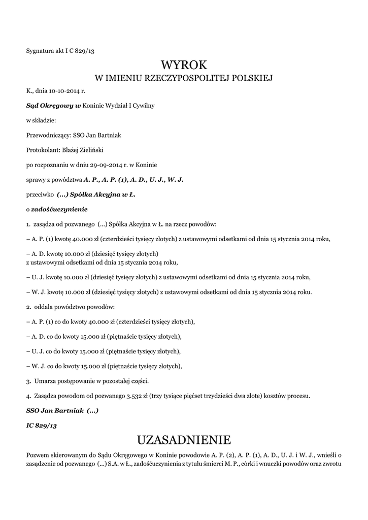 Sygnatura akt I C 829/13 WYROK W IMIENIU RZECZYPOSPOLITEJ POLSKIEJ K., dnia 10-10-2014 r. Sąd Okręgowy w Koninie Wydział I Cywilny w składzie: Przewodniczący: SSO Jan Bartniak Protokolant: Błażej Zieliński po rozpoznaniu w dniu 29-09-2014 r. w Koninie sprawy z powództwa A. P., A. P. (1), A. D., U. J., W. J. przeciwko (...) Spółka Akcyjna w Ł. o zadośćuczynienie 1. zasądza od pozwanego (...) Spółka Akcyjna w Ł. na rzecz powodów: – A. P. (1) kwotę 40.000 zł (czterdzieści tysięcy złotych) z ustawowymi odsetkami od dnia 15 stycznia 2014 roku, – A. D. kwotę 10.000 zł (dziesięć tysięcy złotych) z ustawowymi odsetkami od dnia 15 stycznia 2014 roku, – U. J. kwotę 10.000 zł (dziesięć tysięcy złotych) z ustawowymi odsetkami od dnia 15 stycznia 2014 roku, – W. J. kwotę 10.000 zł (dziesięć tysięcy złotych) z ustawowymi odsetkami od dnia 15 stycznia 2014 roku. 2. oddala powództwo powodów: – A. P. (1) co do kwoty 40.000 zł (czterdzieści tysięcy złotych), – A. D. co do kwoty 15.000 zł (piętnaście tysięcy złotych), – U. J. co do kwoty 15.000 zł (piętnaście tysięcy złotych), – W. J. co do kwoty 15.000 zł (piętnaście tysięcy złotych), 3. Umarza postępowanie w pozostałej części. 4. Zasądza powodom od pozwanego 3.532 zł (trzy tysiące pięćset trzydzieści dwa złote) kosztów procesu. SSO Jan Bartniak (...) IC 829/13 UZASADNIENIE Pozwem skierowanym do Sądu Okręgowego w Koninie powodowie A. P. (2), A. P. (1), A. D., U. J. i W. J., wnieśli o zasądzenie od pozwanego (...) S.A. w Ł., zadośćuczynienia z tytułu śmierci M. P., córki i wnuczki powodów oraz zwrotu kosztów postępowania, w tym kosztów zastępstwa procesowego. Powodowie (rodzice zmarłej) wnieśli o zasądzenie kwot po 80.000 złotych dla każdego z nich, a pozostali z powodów (dziadkowie zmarłej) kwot po 45.000 złotych. Wszystkie kwoty z odsetkami ustawowymi od dnia wniesienia pozwu. Wnieśli nadto o zwolnienie powodów w całości od konieczności ponoszenia kosztów sądowych w niniejszej sprawie. W uzasadnieniu pozwu powodowie wskazali, że zdarzenie które doprowadziło do tragicznej śmierci M. P. (ur. (...))w wypadku drogowym z dnia 16 marca 2012 r., „diametralnie zmieniło życie całej rodziny,” odebrano im szansę uczestnictwa w kolejnych etapach jej dorosłego życia: jak zakładania rodziny, „kolejnych radości i trosk związanych z życiem rodzinnym i zawodowym.” Dla dziadków zmarłej „perspektywa ta jest równie bolesna… , gdyż czynnie uczestniczyli oni w jej wychowaniu, mając z nią niemal codzienny, bardzo bliski kontakt. Pełniła ona centralną rolę w rodzinie, w pewnym sensie scalając ją wokół swojej osoby.” Po prawomocnym oddaleniu wniosku powodów o zwolnienie ich od kosztów sądowych,(postanowieniem Sądu Apelacyjnego w Poznaniu z dnia 29.11.2013 r. k.39-40), powodowie pismem z dnia 19.12.,2013 r. ograniczyli żądania pozwu w ten sposób, że powódka A. P. (2) (matka zmarłej) cofnęła zadanie pozwu w całości, bez zrzeczenia się roszczenia. Dziadkowie zmarłej, cofnęli żądania, także bez zrzeczenia się roszczenia ograniczając je do kwot po 15.000 zł. dla każdego z uprawnionych.(k.43-45) W odpowiedzi na pozew (...) S.A. w Ł. wniosło o oddalenie powództwa w całości i zasądzenie na jego rzecz kosztów procesu, w tym kosztów zastępstwa procesowego według norm przepisanych. Podnoszono, że w sprawie (...). (...) (ostatecznie (...)) P. R. w T., przeprowadzono opinię biegłego z zakresu medycyny sądowej na okoliczność „czy w chwili wypadku M. P. miała zapięty pas bezpieczeństwa,” ponadto z wykonanych w ww. sprawie badań u zmarłej oznaczono: w krwi pobranej podczas sekcji zwłok 0,28 ‰ i w moczu 0,05 ‰, alkoholu etylowego, a u kierującego pojazdem E. J. obecność alkoholu etylowego oznaczono na: w krwi 0,34 ‰ i 1,06 ‰ w moczu. Pozwane T. przyznało fakt zawarcia umowy ubezpieczenia odpowiedzialności cywilnej przez sprawcę wypadku i wskazało, że z tytułu zadośćuczynienia i odszkodowania ( art.446 § 3 i 4 k.c.) wypłaciło każdemu z rodziców zmarłej: tytułem zadośćuczynienia kwoty po 40.000 zł. i kwoty po 20.000 zł. tytułem odszkodowania, natomiast dziadkom zmarłej tytułem zadośćuczynienia kwoty po 5.000 zł. Dalsze żądania winny być oddalone gdyż „osoba która decyduje się na jazdę samochodem z kierowcą będącym po spożyciu alkoholu, przyczynia się do odniesionej szkody w wypadku komunikacyjnym (…)”(vide k.55-58). Wskazywano nadto, że zadośćuczynienie musi być przyznane w rozsądnych granicach, odpowiadających aktualnym warunkom życia i przeciętnej stopie życiowej społeczeństwa. Co więcej powodowie nie wykazali by korzystali w następstwie zdarzenia z pomocy lekarza psychiatry czy też psychologa stąd przebieg „procesu leczenia doznanej traumy” nie wskazuje by łączyła ich ze zmarłą więź tak silna jak opisana w pozwie. Sąd ustalił następujący stan faktyczny: Córka i wnuczka powodów: M. P. (ur. (...)) będąc pasażerem samochodu osobowego marki F. (...) nr rej. (...), jak i kierujący pojazdem E. J.: ponieśli śmierć w wypadku jaki miał miejsce w dniu 16 marca 2012 r. około godz. 16.40, w R. na drodze prowadzącej z U. w kierunku T.. (niesporne). Sprawca wypadku miał ubezpieczenie odpowiedzialności cywilnej w pozwanym T. U.). Śledztwo prowadzone w sprawie wypadku drogowego zaistniałego w dniu 16 marca 2012 r. w R. w sprawie (...) ostatecznie umorzono postanowieniem z dnia 27 grudnia 2012 r. z uwagi na to, że sprawca zmarł. (niesporne) Prokurator podzielił wnioski opinii powołanych na potrzeby śledztwa biegłych ustalając, że kierujący samochodem marki F. (...), E. J. wykonując manewr wyprzedzania poprzedzających go dwu pojazdów, poruszał się z prędkością 93,5 km/godz., która była niedozwoloną i niebezpieczną w danych warunkach drogowych, zjechał lewymi kołami na lewe pobocze i