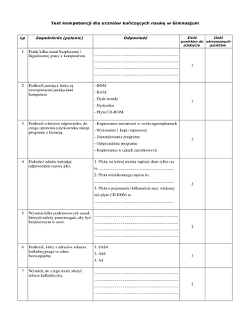 Test kompetencji dla uczniów kończących naukę w Gimnazjum Lp 1 Zagadnienie (pytanie) Podaj kilka zasad bezpiecznej i higienicznej pracy z komputerem. Odpowiedź Ilość Ilość punktów do otrzymanych zdobycia punktów ................................................................................ ................................................................................ ................................................................................ 1 ................................................................................ 2 Podkreśl pamięci, które są zewnętrznymi pamięciami komputera - ROM - RAM - Dysk twardy - Dyskietka 1 - Płyta CD-ROM 3 Podkreśl właściwe odpowiedzi, do czego uprawnia użytkownika zakup programu z licencją. - Kopiowania zawartości w wielu egzemplarzach - Wykonania 1 kopii zapasowej - Zainstalowania programu - Odsprzedania programu 2 - Kopiowania w celach zarobkowych 4 Dokończ zdania wpisując odpowiednie nazwy płyt. 1. Płyta, na której można zapisać dane tylko raz to ........................................................................ 2. Płyta wielokrotnego zapisu to ............................................................................ 3. Płyta o pojemności kilkanaście razy większej 2 niż płyta CD-ROM to ............................................................................ 5 Wymień kilka podstawowych zasad, których należy przestrzegać, aby być ................................................................................ bezpiecznym w sieci. ................................................................................ ................................................................................ 2 ................................................................................ 6 Podkreśl, który z adresów arkusza kalkulacyjnego to adres bezwzględny. 1. $A$4 2. A$4 2 3. A4 7 Wymień, do czego może służyć arkusz kalkulacyjny. ................................................................................ ................................................................................ ................................................................................ ................................................................................ 2 Lp 8 Zagadnienie (pytanie) Napisz, w jaki sposób można przenosić, kopiować, usuwać i wklejać pliki i foldery. Odpowiedź Ilość Ilość punktów do otrzymanych zdobycia punktów 1. Przenoszenie plików lub folderów: ................................................................................ ................................................................................ ................................................................................ 2. Kopiowanie plików lub folderów: ................................................................................ ................................................................................ ................................................................................ 3. Usuwanie plików lub folderów: 8 ................................................................................ ................................................................................ ................................................................................ 4. Wklejanie plików lub folderów: ................................................................................ ................................................................................ ................................................................................ 9 Spójrz na strukturę folderów i odpowiedz na pytania: Które z folderów są główne? Wypisz ich nazwy: ................................................................................ ................................................................................ ................................................................................ Wypisz nazwy podfolderów: ................................................................................ 2 ................................................................................ ................................................................................ ................................................................................ 10 Wypisz przykładowe (wymyślone przez Ciecie) nazwy plików oraz odpowiadające im rozszerzenia, np. wypracowanie.doc, rozliczenie.xls itp. 1. Pliki tekstowe: ................................................................................ ................................................................................ ................................................................................ 2. Pliki graficzne: ................................................................................ ................................................................................ ................................................................................ 3. Obliczenia: ................................................................................ ................................................................................ ................................................................................ 5 Lp Zagadnienie (pytanie) Odpowiedź Ilość Ilość punktów do otrzymanych zdobycia punktów 4. Pliki dźwiękowe: ................................................................................ ................................................................................ ................................................................................ 5. Inne ................................................................................ ................................................................................ ................................................................................ 11 Odszukaj w Internecie strony dotyczące Ostrowca. Zapisz adresy stron, które znalazłeś. .........................................................................