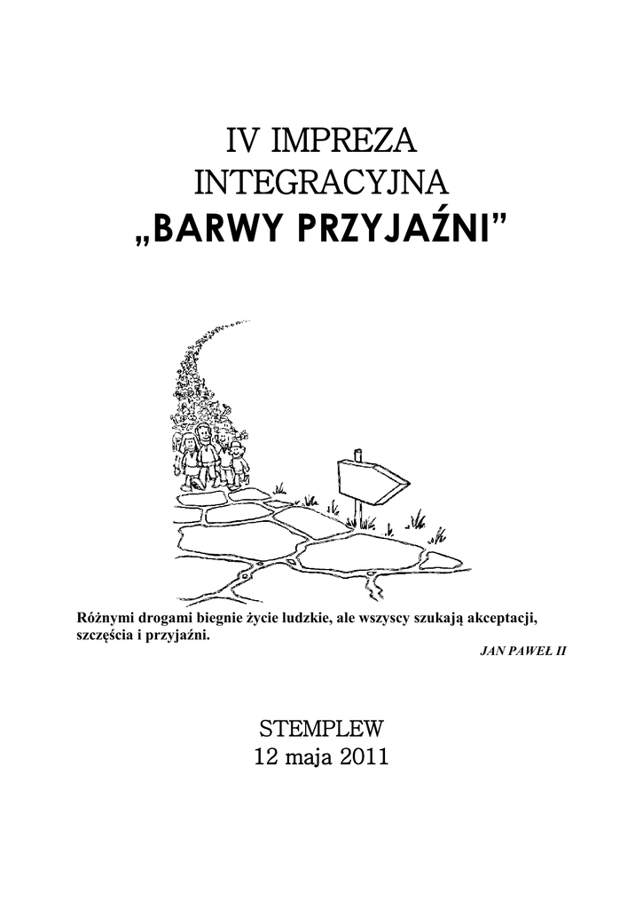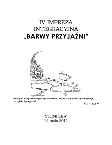 IV IMPREZA INTEGRACYJNA „BARWY PRZYJAŹNI” Różnymi drogami biegnie życie ludzkie, ale wszyscy szukają akceptacji, szczęścia i przyjaźni. JAN PAWEŁ II STEMPLEW 12 maja 2011 IV IMPREZA INTEGRACYJNA BARWY PRZYJAŹNI 12 MAJA 2011 Stowarzyszenie „Mamy Wielkie Serca” w ŚWINICACH WARCKICH, powiat ŁĘCZYCKI. woj. ŁÓDZKIE zaprasza do wspólnej zabawy. Dnia 12 maja 2011 roku na terenie Specjalnego Ośrodka Szkolno Wychowawczego im. Juliana Tuwima w Stemplewie odbędzie się impreza integracyjna BARWY PRZYJAŹNI. Drużyny powinny być reprezentowane przez sześcioosobowe zespoły oraz 1 lub 2 pełnoletnich opiekunów. O uczestnictwie w imprezie decyduje kolejność zgłoszeń. Zgłoszenie (formularz w załączeniu) winno zawierać imię i nazwisko, datę urodzenia, imię i nazwisko opiekuna, podpis osoby delegującej (jednostki). Informacje organizacyjne Uczestnicy przyjeżdżają na koszt własny oraz ubezpieczają się we własnym zakresie. Zgłoszenie należy przesłać do dnia 30 kwietnia 2011 r. na adres: Stowarzyszenie „Mamy Wielkie Serca” Ul. Kościuszki 14 99 -140 Świnice Warckie Powiat ŁĘCZYCA, woj. ŁÓDŹ Z dopiskiem: „BARWY PRZYJAŹNI” TEL./FAX 63 288-11-07 Organizator po otrzymaniu zgłoszenia przesyła informację o zakwalifikowaniu drużyny na imprezę. Ze względu na ograniczoną liczbę miejsc o przyjęciu decyduje kolejność zgłoszeń. Wszelkich informacji udziela Sekretariat Specjalnego Ośrodka Szkolno Wychowawczego im. Juliana Tuwima w Stemplewie w godz. 700 -1500, tel. 63 288-11-06 lub 288-11-07. Cele imprezy integracja dzieci i młodzieży niepełnosprawnej ze zdrowymi rówieśnikami poprzez wspólne działania wychowawcze i edukacyjne zainteresowanie środowiska problemami osoby niepełnosprawnej oraz ukazanie możliwości działań wspierających i integracyjnych promocja Ośrodka i działalności Stowarzyszenia w regionie w zakresie wspierania osób niepełnosprawnych wychowanie do poszanowania godności każdego człowieka niezależnie od sprawności intelektualnej, fizycznej nabywanie umiejętności zgodnej rywalizacji i współdziałania w grupach rówieśniczych dzieci zdrowych z niepełnosprawnymi poszerzenie horyzontów poznawczych i społecznych młodzieży prezentacja umiejętności sportowych, plastycznych, zręcznościowych wzajemne uzupełnianie się i ubogacanie się swoją obecnością pobudzanie do różnego rodzaju aktywności twórczej i umysłowej wzmacnianie pewności siebie nabywanie umiejętności prezentacji własnych możliwości propagowanie jazdy konnej i hipoterapii Organizatorzy i współorganizatorzy Stowarzyszenie „Mamy Wielkie Serca” Specjalny Ośrodek Szkolno Wychowawczy im. J. Tuwima w Stemplewie Regionalne Centrum Polityki Społecznej w Łodzi Starostwo Powiatu Łęczyckiego BARWY PRZYJAŹNI to impreza integrująca środowiska osób niepełnosprawnych ze zdrowymi rówieśnikami, spędzanie razem czasu, prezentowanie swoich możliwości i umiejętności. To propozycja działań kreatywnych i zdrowej rywalizacji mającej zapewnić zadowolenie i radość uczestników. Spotkanie także propaguje zdrowy styl spędzania czasu. PROGRAM IMPREZY INTEGRACYJNEJ BARWY PRZYJAŹNI 12 maja 2011 r. do 900 – dojazd drużyn do Stemplewa 900 – 910 – otwarcie imprezy, powitanie gości i uczestników 910 - 1200 Część I Koń nasz przyjaciel Konkurs plastyczny Koń w przyrodzie Ognisko z kiełbaskami Przejażdżki konne 1200 - 1400 Część II W poszukiwaniu przyjaźni Warsztaty twórcze o różnorodnym charakterze ukazujące zdolności manualne, intelektualne, sportowe, zręcznościowe Prezentacja bazy rehabilitacyjnej SOSW 1400 -1430 – Obiad 1430 – 1500 – Część III Przyjaźń to cenny skarb Podsumowanie imprezy Wystawa prac plastycznych Utworzenie wielobarwnego kręgu przyjaźni Rozdanie nagród i dyplomów 1500 – 1700 - Część IV Triumf przyjaźni (dla chętnych uczestników imprezy, którzy chcą jeszcze pozostać z nami) Zabawy przy muzyce Lista zgłoszeniowa IV Impreza Integracyjna „BARWY PRZYJAŹNI” Drużyna z ……………………………………………………………………………………. (nazwa i adres placówki) …………………………………………………………………………………………………... Lp Nazwisko i imię Data urodzenia Uwagi 1. 2. 3. 4. 5. 6. Opiekun(owie): ………………………………………………… tel kontaktowy………………. …………………………………………………………. Placówka delegująca: