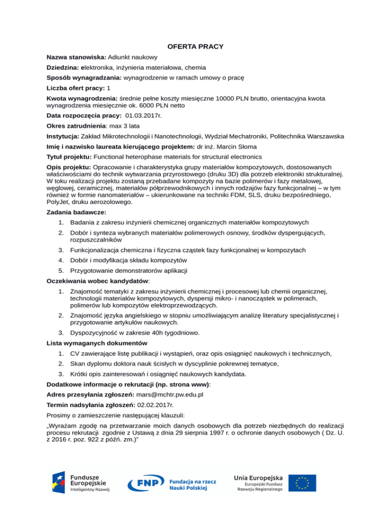 OFERTA PRACY Nazwa stanowiska: Adiunkt naukowy Dziedzina: elektronika, inżynieria materiałowa, chemia Sposób wynagradzania: wynagrodzenie w ramach umowy o pracę Liczba ofert pracy: 1 Kwota wynagrodzenia: średnie pełne koszty miesięczne 10000 PLN brutto, orientacyjna kwota wynagrodzenia miesięcznie ok. 6000 PLN netto Data rozpoczęcia pracy: 01.03.2017r. Okres zatrudnienia: max 3 lata Instytucja: Zakład Mikrotechnologii i Nanotechnologii, Wydział Mechatroniki, Politechnika Warszawska Imię i nazwisko laureata kierującego projektem: dr inż. Marcin Słoma Tytuł projektu: Functional heterophase materials for structural electronics Opis projektu: Opracowanie i charakterystyka grupy materiałów kompozytowych, dostosowanych właściwościami do technik wytwarzania przyrostowego (druku 3D) dla potrzeb elektroniki strukturalnej. W toku realizacji projektu zostaną przebadane kompozyty na bazie polimerów i fazy metalowej, węglowej, ceramicznej, materiałów półprzewodnikowych i innych rodzajów fazy funkcjonalnej – w tym również w formie nanomateriałów – ukierunkowane na techniki FDM, SLS, druku bezpośredniego, PolyJet, druku aerozolowego. Zadania badawcze: 1. Badania z zakresu inżynierii chemicznej organicznych materiałów kompozytowych 2. Dobór i synteza wybranych materiałów polimerowych osnowy, środków dyspergujących, rozpuszczalników 3. Funkcjonalizacja chemiczna i fizyczna cząstek fazy funkcjonalnej w kompozytach 4. Dobór i modyfikacja składu kompozytów 5. Przygotowanie demonstratorów aplikacji Oczekiwania wobec kandydatów: 1. Znajomość tematyki z zakresu inżynierii chemicznej i procesowej lub chemii organicznej, technologii materiałów kompozytowych, dyspersji mikro- i nanocząstek w polimerach, polimerów lub kompozytów elektroprzewodzących. 2. Znajomość języka angielskiego w stopniu umożliwiającym analizę literatury specjalistycznej i przygotowanie artykułów naukowych. 3. Dyspozycyjność w zakresie 40h tygodniowo. Lista wymaganych dokumentów 1. CV zawierające listę publikacji i wystąpień, oraz opis osiągnięć naukowych i technicznych, 2. Skan dyplomu doktora nauk ścisłych w dyscyplinie pokrewnej tematyce, 3. Krótki opis zainteresowań i osiągnięć naukowych kandydata. Dodatkowe informacje o rekrutacji (np. strona www): Adres przesyłania zgłoszeń: [email protected] Termin nadsyłania zgłoszeń: 02.02.2017r. Prosimy o zamieszczenie następującej klauzuli: „Wyrażam zgodę na przetwarzanie moich danych osobowych dla potrzeb niezbędnych do realizacji procesu rekrutacji zgodnie z Ustawą z dnia 29 sierpnia 1997 r. o ochronie danych osobowych ( Dz. U. z 2016 r. poz. 922 z późń. zm.)”