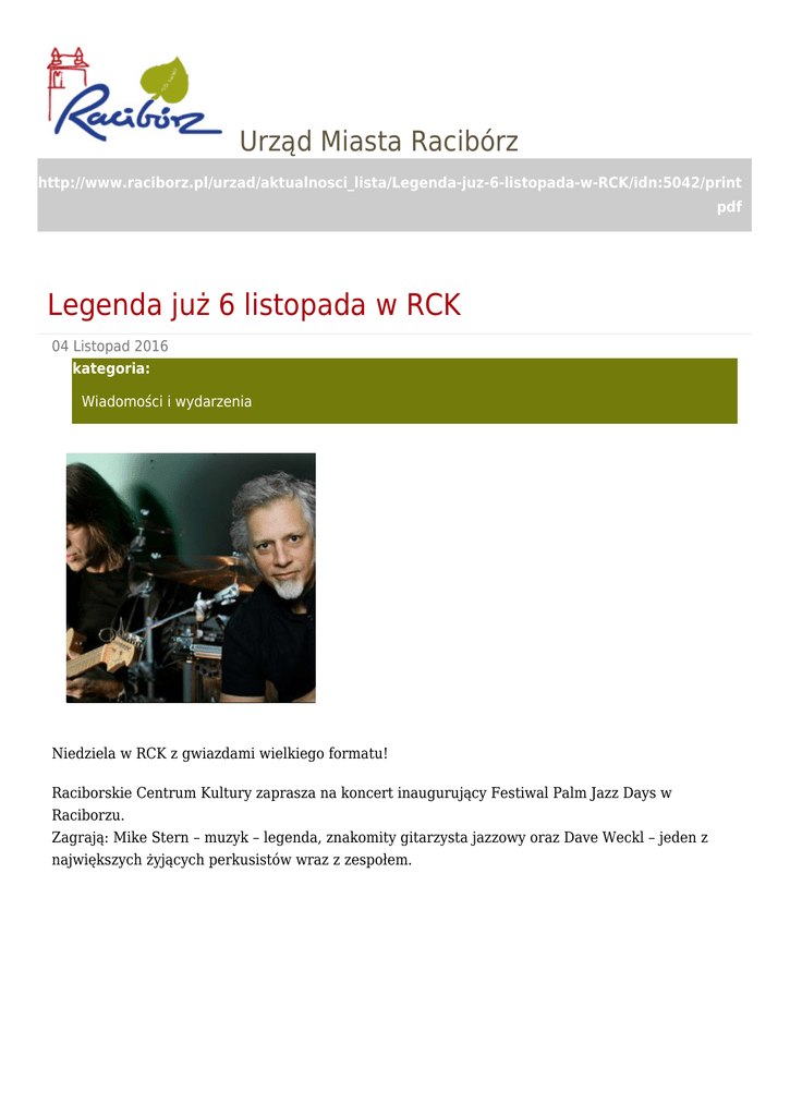 Urząd Miasta Racibórz http://www.raciborz.pl/urzad/aktualnosci_lista/Legenda-juz-6-listopada-w-RCK/idn:5042/print pdf Legenda już 6 listopada w RCK 04 Listopad 2016 kategoria: Wiadomości i wydarzenia Niedziela w RCK z gwiazdami wielkiego formatu! Raciborskie Centrum Kultury zaprasza na koncert inaugurujący Festiwal Palm Jazz Days w Raciborzu. Zagrają: Mike Stern – muzyk – legenda, znakomity gitarzysta jazzowy oraz Dave Weckl – jeden z największych żyjących perkusistów wraz z zespołem. Legenda już 6 listopada na deskach RCK. Koncert odbędzie się 6 listopada o godzinie 19.00 w Raciborskim Domu Kultury przy ul. Chopina 21. Bilety wciąż do nabycia w kasach RCK. Więcej informacji znajdziecie Państwo na stronie www.rck.com.pl Serdecznie zapraszamy! (autor. Patrycja Kowalska)