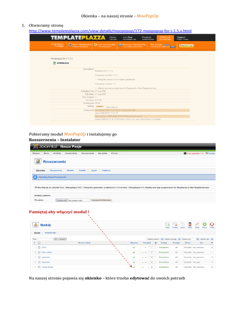 Okienka – na naszej stronie - MooPopUp 1. Otwieramy stronę http://www.templateplazza.com/view-details/moopopup/172-moopopup-for-j-1.5.x.html Pobieramy moduł MooPopUp i instalujemy go Rozszerzenia – Instalator Pamiętaj aby włączyć moduł ! Na naszej stronie pojawia się okienko – które trzeba edytować do swoich potrzeb Otwieramy moduł i zmieniamy parametry Rozszerzenia – Moduły - TP Moo Pop Up