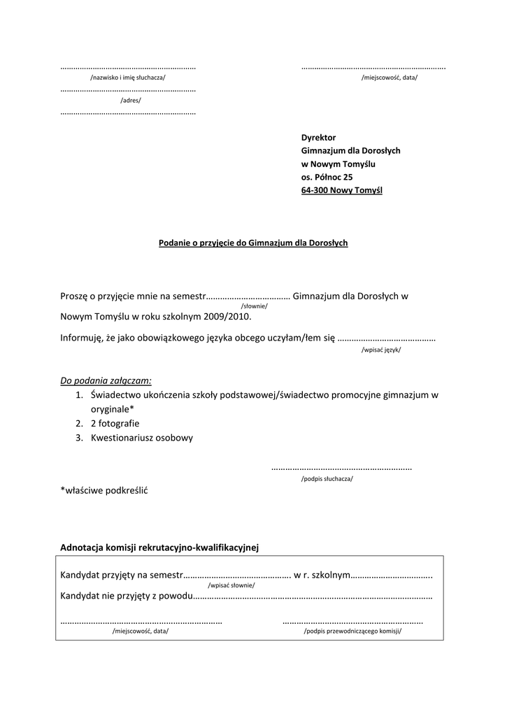 ……………………………………………………… …………………………………………………………. /nazwisko i imię słuchacza/ /miejscowośd, data/ ……………………………………………………… /adres/ ……………………………………………………… Dyrektor Gimnazjum dla Dorosłych w Nowym Tomyślu os. Północ 25 64-300 Nowy Tomyśl Podanie o przyjęcie do Gimnazjum dla Dorosłych Proszę o przyjęcie mnie na semestr……………………………… Gimnazjum dla Dorosłych w /słownie/ Nowym Tomyślu w roku szkolnym 2009/2010. Informuję, że jako obowiązkowego języka obcego uczyłam/łem się …………………………………… /wpisad język/ Do podania załączam: 1. Świadectwo ukooczenia szkoły podstawowej/świadectwo promocyjne gimnazjum w oryginale* 2. 2 fotografie 3. Kwestionariusz osobowy …………………………………………………… /podpis słuchacza/ *właściwe podkreślid Adnotacja komisji rekrutacyjno-kwalifikacyjnej Kandydat przyjęty na semestr………………………………………. w r. szkolnym…………………………….. /wpisad słownie/ Kandydat nie przyjęty z powodu………………………………………………………………………………………… …………………………………………………………… …………………………………………………… /miejscowośd, data/ /podpis przewodniczącego komisji/