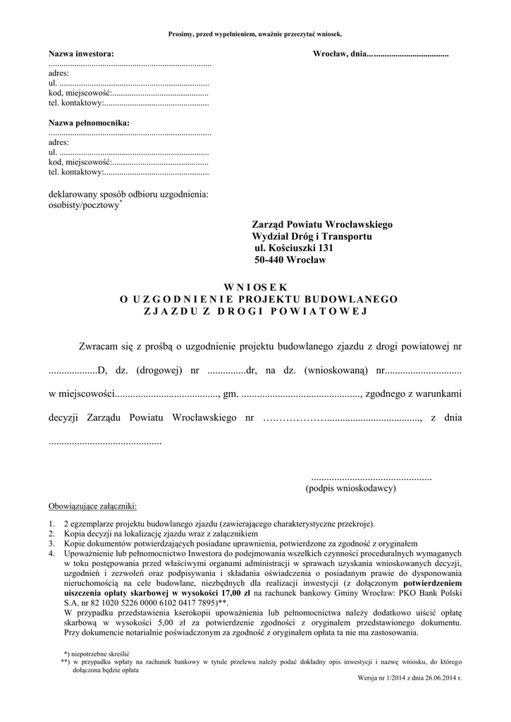 Prosimy, przed wypełnieniem, uważnie przeczytać wniosek. Nazwa inwestora: ............................................................................ adres: ul. ...................................................................... kod, miejscowość:............................................. tel. kontaktowy:................................................. Wrocław, dnia... ................................... Nazwa pełnomocnika: ............................................................................ adres: ul. ...................................................................... kod, miejscowość:............................................. tel. kontaktowy:................................................. deklarowany sposób odbioru uzgodnienia: osobisty/pocztowy* Zarząd Powiatu Wrocławskiego Wydział Dróg i Transportu ul. Kościuszki 131 50-440 Wrocław W N I OS E K O U Z G O D N I E N I E PROJEKTU BUDOWLANEGO ZJAZDU Z DROGI POWIATOWEJ Zwracam się z prośbą o uzgodnienie projektu budowlanego zjazdu z drogi powiatowej nr ...................D, dz. (drogowej) nr ...............dr, na dz. (wnioskowaną) nr.............................. w miejscowości........................................, gm. .............................................., zgodnego z warunkami decyzji Zarządu Powiatu Wrocławskiego nr ….……………...................................., z dnia ............................................ ............................................... (podpis wnioskodawcy) Obowiązujące załączniki: 1. 2. 3. 4. 2 egzemplarze projektu budowlanego zjazdu (zawierającego charakterystyczne przekroje). Kopia decyzji na lokalizację zjazdu wraz z załącznikiem Kopie dokumentów potwierdzających posiadane uprawnienia, potwierdzone za zgodność z oryginałem Upoważnienie lub pełnomocnictwo Inwestora do podejmowania wszelkich czynności proceduralnych wymaganych w toku postępowania przed właściwymi organami administracji w sprawach uzyskania wnioskowanych decyzji, uzgodnień i zezwoleń oraz podpisywania i składania oświadczenia o posiadanym prawie do dysponowania nieruchomością na cele budowlane, niezbędnych dla realizacji inwestycji (z dołączonym potwierdzeniem uiszczenia opłaty skarbowej w wysokości 17,00 zł na rachunek bankowy Gminy Wrocław: PKO Bank Polski S.A. nr 82 1020 5226 0000 6102 0417 7895)**. W przypadku przedstawienia kserokopii upoważnienia lub pełnomocnictwa należy dodatkowo uiścić opłatę skarbową w wysokości 5,00 zł za potwierdzenie zgodności z oryginałem przedstawionego dokumentu. Przy dokumencie notarialnie poświadczonym za zgodność z oryginałem opłata ta nie ma zastosowania. *) niepotrzebne skreślić **) w przypadku wpłaty na rachunek bankowy w tytule przelewu należy podać dokładny opis inwestycji i nazwę wniosku, do którego dołączona będzie opłata Wersja nr 1/2014 z dnia 26.06.2014 r.