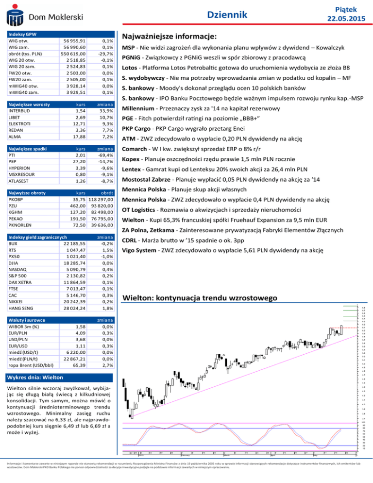 Piątek 22.05.2015 Dziennik Indeksy GPW WIG otw. WIG zam. obrót (tys. PLN) WIG 20 otw. WIG 20 zam. FW20 otw. FW20 zam. mWIG40 otw. mWIG40 zam. 56 955,91 56 990,60 550 619,00 2 518,85 2 524,83 2 503,00 2 505,00 3 928,14 3 929,51 0,1% 0,1% -29,7% -0,1% 0,1% 0,0% 0,1% 0,0% 0,1% Największe wzrosty INTERBUD LIBET ELEKTROTI REDAN ALMA kurs 1,54 2,69 12,71 3,36 17,88 zmiana 33,9% 10,7% 9,3% 7,7% 7,2% Największe spadki PTI PEP HYPERION MSXRESOUR ATLASEST kurs 2,01 27,20 3,39 0,80 1,26 zmiana -69,4% -14,7% -9,6% -9,1% -8,7% Najważniejsze informacje: MSP - Nie widzi zagrożeń dla wykonania planu wpływów z dywidend – Kowalczyk PGNiG - Związkowcy z PGNiG weszli w spór zbiorowy z pracodawcą Lotos - Platforma Lotos Petrobaltic gotowa do uruchomienia wydobycia ze złoża B8 S. wydobywczy - Nie ma potrzeby wprowadzania zmian w podatku od kopalin – MF S. bankowy - Moody's dokonał przeglądu ocen 10 polskich banków S. bankowy - IPO Banku Pocztowego będzie ważnym impulsem rozwoju rynku kap.-MSP Najwyższe obroty PKOBP PZU KGHM PEKAO PKNORLEN Millennium - Przeznaczy zysk za '14 na kapitał rezerwowy PGE - Fitch potwierdził ratingi na poziomie „BBB+” PKP Cargo - PKP Cargo wygrało przetarg Enei ATM - ZWZ zdecydowało o wypłacie 0,20 PLN dywidendy na akcję Comarch - W I kw. zwiększył sprzedaż ERP o 8% r/r Kopex - Planuje oszczędności rzędu prawie 1,5 mln PLN rocznie Lentex - Gamrat kupi od Lenteksu 20% swoich akcji za 26,4 mln PLN Mostostal Zabrze - Planuje wypłacić 0,05 PLN dywidendy na akcję za ‘14 Mennica Polska - Planuje skup akcji własnych kurs obrót 35,75 118 297,00 462,00 93 820,00 127,20 82 498,00 191,50 76 795,00 72,50 39 636,00 Indeksy giełd zagranicznych BUX 22 185,55 RTS 1 047,47 PX50 1 021,40 DJIA 18 285,74 NASDAQ 5 090,79 S&P 500 2 130,82 DAX XETRA 11 864,59 FTSE 7 013,47 CAC 5 146,70 NIKKEI 20 242,39 HANG SENG 28 024,24 zmiana -0,2% 1,5% -1,0% 0,0% 0,4% 0,2% 0,1% 0,1% 0,3% 0,2% 1,8% Waluty i surowce WIBOR 3m (%) EUR/PLN USD/PLN EUR/USD miedź (USD/t) miedź (PLN/t) ropa Brent (USD/bbl) zmiana 0,0% 0,3% 0,0% 0,3% 0,0% 0,0% 2,7% 1,58 4,09 3,68 1,11 6 220,00 22 867,21 65,39 Mennica Polska - ZWZ zdecydowało o wypłacie 0,4 PLN dywidendy na akcję OT Logistics - Rozmawia o akwizycjach i sprzedaży nieruchomości Wielton - Kupi 65,3% francuskiej spółki Fruehauf Expansion za 9,5 mln EUR ZA Polna, Zetkama - Zainteresowane prywatyzacją Fabryki Elementów Złącznych CDRL - Marża brutto w ’15 spadnie o ok. 3pp Vigo System - ZWZ zdecydowało o wypłacie 5,61 PLN dywidendy na akcję Wielton: kontynuacja trendu wzrostowego 6.8 6.7 6.6 6.5 6.4 6.3 6.2 6.1 6.0 5.9 5.8 5.7 5.6 5.5 5.4 5.3 5.2 5.1 5.0 4.9 4.8 4.7 Wykres dnia: Wielton 4.6 4.5 Wielton silnie wczoraj zwyżkował, wybijając się długą białą świecą z kilkudniowej konsolidacji. Tym samym, można mówić o kontynuacji średnioterminowego trendu wzrostowego. Minimalny zasięg ruchu należy szacować na 6,33 zł, ale najprawdopodobniej kurs sięgnie 6,49 zł lub 6,69 zł a może i wyżej. 4.4 4.3 4.2 4.1 4.0 3.9 3.8 3.7 100 90 80 70 60 50 40 30 20 10 15 22 29 5 2015 12 19 26 2 February 9 16 23 2 March 9 16 23 30 7 April 13 20 27 4 May 11 18 25 1 June Informacje i komentarze zawarte w niniejszym raporcie nie stanowią rekomendacji w rozumieniu Rozporządzenia Ministra Finansów z dnia 19 października 2005 roku w sprawie informacji stanowiących rekomendacje dotyczące instrumentów finansowych, ich emitentów lub wystawców. Dom Maklerski PKO Banku Polskiego nie ponosi odpowiedzialności za decyzje inwestycyjne podjęte na podstawie informacji zawartych w niniejszym opracowaniu. Dziennik Najważniejsze informacje MSP Nie widzi zagrożeń dla wykonania planu wpływów z dywidend – Kowalczyk Plan wpływów z dywidend zapisany w budżecie wynosi 4,5 mld PLN. PGNiG Związkowcy z PGNiG weszli w spór zbiorowy z pracodawcą Organizacje związkowe weszły w spór po tym, jak spółka odrzuciła ich żądania, w tym m.in. 6% wzrost wynagrodzeń w tym roku, wzrost wartości bonów w skali roku do 2 tys. PLN i wypłata premii za 2014 r. w wysokości 11,5 jej bazy. PGNiG podało, że dwa z pierwszych żądań nie mogą być przedmiotem sporu zbiorowego, gdyż kwestie te reguluje obowiązujący w firmie Zakładowy Układ Zbiorowy Pracy. Z kolei oczekiwania co do premii nie zostały zrealizowane ze względu na liberalizację rynku gazu w Polsce i wzrost konkurencji, zmiany w otoczeniu rynkowym (spadek ceny ropy) i zmiany w otoczeniu regulacyjnym. (M. Kalwasińska) Lotos Platforma Lotos Petrobaltic gotowa do uruchomienia wydobycia ze złoża B8 Lotos poinformował, że zakończył się remont platformy wiertniczej Lotos Petrobaltic i platforma jest gotowa do uruchomienia wydobycia ze złoża B8, a rozpoczęcie wstępnej produkcji zaplanowano na IV kwartał. (M. Kalwasińska) Sektor wydobywczy Nie ma potrzeby wprowadzania zmian w podatku od kopalin - Szczurek Minister Finansów Mateusz Szczurek poinformował w wywiadzie dla Agencji Bloomberg, że MF monitoruje sytuację płatników tego podatku i analizy pokazują, że nie ma podstaw aby go zmieniać. Sektor bankowy Moody's dokonał przeglądu ocen 10 polskich banków w związku ze zmianą metodologii Agencja podwyższyła długoterminowe ratingi depozytowe dla siedmiu banków, a obniżyła dla jednego. Moody's podtrzymał rating A2/Prime-1 dla PKO BP, ze zmianą perspektywy ze stabilnej na negatywną. Podtrzymał też rating dla Getin Noble Bank na poziomie Ba2. Agencja podwyższyła dla BZ WBK (do A3 z Baa1), dla mBanku (do Baa2/Prime-2 z Baa3/Prime-3), dla ING (do A3 z Baa1), dla Millennium (do Ba1 z Ba2), dla BGŻ (do Baa2/Prime-2 z Baa3/Prime-3), dla Credit Agricole Bank Polska (do Baa1/Prime-2 z Baa3/Prime-3) i dla Banku Handlowego (do A3/Prime-2 z Baa3/Prime-3). Z kolei rating dla BPH został obniżony do Ba2/Not-Prime z Baa3/Prime-3. Nowa metodologia Moody’s została wydana 16 marca 2015 r. Sektor bankowy MSP liczy, że IPO Banku Pocztowego będzie kolej