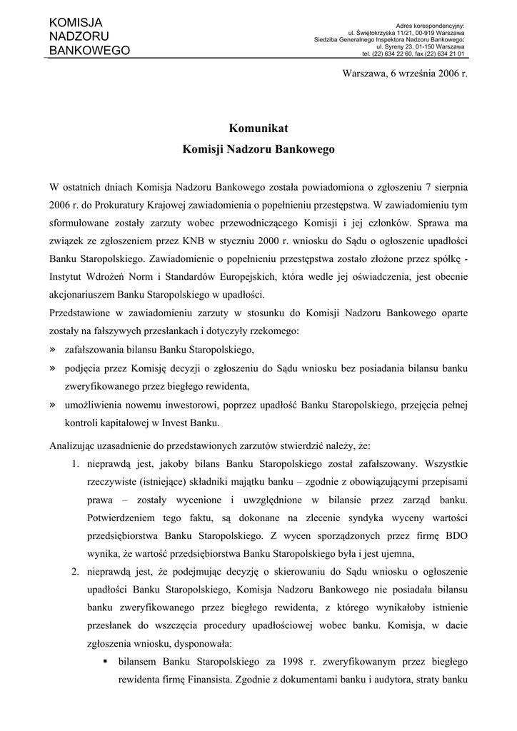 KOMISJA NADZORU BANKOWEGO Adres korespondencyjny: ul. Świętokrzyska 11/21, 00-919 Warszawa Siedziba Generalnego Inspektora Nadzoru Bankowego: ul. Syreny 23, 01-150 Warszawa tel. (22) 634 22 60, fax (22) 634 21 01 Warszawa, 6 września 2006 r. Komunikat Komisji Nadzoru Bankowego W ostatnich dniach Komisja Nadzoru Bankowego została powiadomiona o zgłoszeniu 7 sierpnia 2006 r. do Prokuratury Krajowej zawiadomienia o popełnieniu przestępstwa. W zawiadomieniu tym sformułowane zostały zarzuty wobec przewodniczącego Komisji i jej członków. Sprawa ma związek ze zgłoszeniem przez KNB w styczniu 2000 r. wniosku do Sądu o ogłoszenie upadłości Banku Staropolskiego. Zawiadomienie o popełnieniu przestępstwa zostało złożone przez spółkę Instytut Wdrożeń Norm i Standardów Europejskich, która wedle jej oświadczenia, jest obecnie akcjonariuszem Banku Staropolskiego w upadłości. Przedstawione w zawiadomieniu zarzuty w stosunku do Komisji Nadzoru Bankowego oparte zostały na fałszywych przesłankach i dotyczyły rzekomego: » zafałszowania bilansu Banku Staropolskiego, » podjęcia przez Komisję decyzji o zgłoszeniu do Sądu wniosku bez posiadania bilansu banku zweryfikowanego przez biegłego rewidenta, » umożliwienia nowemu inwestorowi, poprzez upadłość Banku Staropolskiego, przejęcia pełnej kontroli kapitałowej w Invest Banku. Analizując uzasadnienie do przedstawionych zarzutów stwierdzić należy, że: 1. nieprawdą jest, jakoby bilans Banku Staropolskiego został zafałszowany. Wszystkie rzeczywiste (istniejące) składniki majątku banku – zgodnie z obowiązującymi przepisami prawa – zostały wycenione i uwzględnione w bilansie przez zarząd banku. Potwierdzeniem tego faktu, są dokonane na zlecenie syndyka wyceny wartości przedsiębiorstwa Banku Staropolskiego. Z wycen sporządzonych przez firmę BDO wynika, że wartość przedsiębiorstwa Banku Staropolskiego była i jest ujemna, 2. nieprawdą jest, że podejmując decyzję o skierowaniu do Sądu wniosku o ogłoszenie upadłości Banku Staropolskiego, Komisja Nadzoru Bankowego nie posiadała bilansu banku zweryfikowanego przez biegłego rewidenta, z którego wynikałoby istnienie przesłanek do wszczęcia procedury upadłościowej wobec banku. Komisja, w dacie zgłoszenia wniosku, dysponowała: bilansem Banku Staropolskiego za 1998 r. zweryfikowanym przez biegłego rewidenta firmę Finansista. Zgodnie z dokumentami banku i audytora, straty banku ponad dwukrotnie przewyższały jego fundusze. Audytor w swojej opinii stwierdził, że dalsze samodzielne działanie banku zagraża bezpieczeństwu środków zgromadzonych na rachunkach, bilansem Banku Staropolskiego na 31 października 1999 r. wraz ze wstępnym raportem audytora firmy Deloitte & Touche z badania tego bilansu. Z dokumentów banku i audytora wynikało, że sytuacja banku wymaga pilnych działań w trybie nadzoru. Jednocześnie Komisja posiadała sprawozdawczość banku składaną do NBP, z której wynikało, że w październiku 1999 r. nastąpił ponad trzykrotny przyrost strat w stosunku do końca 1998 r., 3. nieprawdą jest, że Komisja, poprzez zgłoszenie wniosku o ogłoszenie upadłości Banku Staropolskiego, umożliwiła przejęcie nowemu inwestorowi pełnej kontroli kapitałowej w Invest Banku. Gdyby - w tamtym czasie - nowy inwestor nie dokapitalizował Invest Banku, wówczas zagrożonymi upadłością byłyby dwa banki. W ocenie Komisji Nadzoru Bankowego, formułowane obecnie wobec niej zarzuty mają ścisły związek z prowadzonym postępowaniem przed Sądem Rejonowym w Poznaniu, w którym oskarżonymi są członkowie władz Banku Staropolskiego o spowodowanie strat w wysokości 560 mln zł.