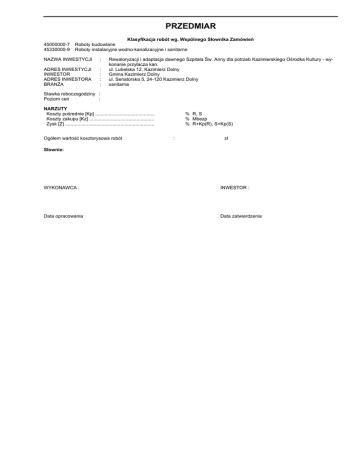PRZEDMIAR 45000000-7 45330000-9 Klasyfikacja robót wg. Wspólnego Słownika Zamówień Roboty budowlane Roboty instalacyjne wodno-kanalizacyjne i sanitarne NAZWA INWESTYCJI : ADRES INWESTYCJI INWESTOR ADRES INWESTORA BRANŻA : : : : Rewaloryzacji i adaptacja dawnego Szpitala Św. Anny dla potrzeb Kazimierskiego Ośrodka Kultury - wykonanie przyłacza kan. ul. Lubelska 12, Kazimierz Dolny Gmina Kazimierz Dolny ul. Senatorska 5, 24-120 Kazimierz Dolny sanitarna Stawka roboczogodziny : Poziom cen : NARZUTY Koszty pośrednie [Kp] ............................................ Koszty zakupu [Kz] ................................................ Zysk [Z] .................................................................. Ogółem wartość kosztorysowa robót % R, S % Mbezp % R+Kp(R), S+Kp(S) : zł Słownie: WYKONAWCA : INWESTOR : Data opracowania Data zatwierdzenia KOK przylacze v04 Lp. Nazwa TABELA ELEMENTÓW SCALONYCH Robocizna Materiały Sprzęt Kosztorys Słownie: -2- Norma STD Wersja 4.30 Licencja: 2639 Kp Kz Z RAZEM OBMIAR Lp. Nr Podst spec. techn. przyłącze kanalizacyjne 1 1 ST przy- KNR 2-31 d.1 łącze 0805-02 2 ST przy- KNR 2-31 d.1 łącze 0802-01 3 ST przy- KNR 2-31 d.1 łącze 1103-07 4 ST przy- KNR 2-01 d.1 łącze 0317-02 5 ST przy- KNR 2-01 d.1 łącze 0320-02 6 ST przy- KNR 2-01 d.1 łącze 0211-01 7 ST przy- KNR 2-01 d.1 łącze 0214-01 8 ST przy- KNR 2-18 d.1 łącze 0501-02 9 ST przy- KNR 2-18 d.1 łącze 0501-04 Opis i wyliczenia Przyłącze kanalizacyjne Ręczne rozebranie nawierzchni z kostki kamiennej nieregularnej o wys. 10 cm na podsypce piaskowej 1.5*6.0 j.m. m2 m2 1.5*6.0 m2 Remont cząstkowy nawierzchni z kostki kamiennej nieregularnej o wys. 10 cm na podsypce cem.piaskowej z wyp.spoin zapr.cement. 1.5*6.0 m2 m2 Wykopy liniowe pod fundamenty, rurociągi, kolektory w gruntach suchych m3 kat.III-IV z wydobyciem urobku łopatą lub wyciągiem ręcznym głębokość do 1.5 m - szerokość 0.8-1.5 m 0.8*(1.4*2.0+1.35*10)+0.7*1.5*1.5 m3 m3 Nakłady uzupełn.za każde dalsze rozp. 0.5 km transportu ponad 1 km samochodami samowyładowczymi po terenie lub drogach gruntowych ziemi kat.I-II - dopłata za 14km Krotność = 28 0.8*0.5*10+1.7 m3 Kanały rurowe - podłoża z materiałów sypkich o grub.15 cm m2 0.8*12 m2 Kanały rurowe - zasypka I warstwa m2 0.8*12 m2 m3 10 ST przy- KNR-W 2- Zabezpieczenie rurociągów przed zamarzaniem - izolacja keramzytem d.1 łącze 18 0614-01 pod osloną folii polietylenowej 1.3 m3 11 ST przy- KNR-W 2- Kanały z rur PVC łączonych na wcisk o śr. zewn. 160 mm d.1 łącze 18 0408-02 12 m m3 m 12 ST przy- KNR-W 2- Studnie rewizyjne z kręgów betonowych o śr. 1000 mm w gotowym wyko- stud. d.1 łącze 18 0513-01 pie o głębok. 3m 1 stud. 14 ST przy- KNR 2-25 d.1 łącze 0519-05 zabezp. zabezp. Studzienki kanalizacyjne rewizyjne z kręgów betonowych do głębok. 2 m kpl. - rozebranie szamba 2 kpl. -3- Norma STD Wersja 4.30 Licencja: 2639 9.000 RAZEM 9.000 9.000 RAZEM 9.000 9.000 RAZEM 9.000 14.615 RAZEM 14.615 11.915 RAZEM 11.915 5.700 RAZEM 5.700 5.700 RAZEM 5.700 9.600 RAZEM 9.600 9.600 RAZEM 9.600 1.300 RAZEM 1.300 12.000 RAZEM 12.000 1.000 RAZEM 1.000 m3 Roboty ziemne wyk.koparkami przedsiębiernymi 0.15 m3 w ziemi kat.I-III m3 uprzednio zmagazynowanej w hałdach z transportem urobku samochodami samowyładowczymi na odl.do 1 km 0.8*0.5*10+1.7 m3 13 ST przy- KNR-W 2- Zabezpieczenie kabla w ziemi d.1 łącze 19 0218-01 2 Razem m2 Ręczne rozebranie podbudowy z gruntu stabilizowanego o grub. 10 cm Zasypywanie wykopów liniowych o ścianach pionowych głębokości do 1.5 m kat.gr.III-IV - szerokość 0.8-1.5 m 14.615-0.8*0.5*10-1.7 + 3.0 Poszcz 2.000 RAZEM 2.000 2.000 RAZEM 2.000