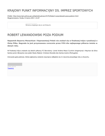 KRAJOWY PUNKT INFORMACYJNY DS. IMPREZ SPORTOWYCH Źródło: http://www.kpk.policja.gov.pl/kpk/aktualnosci/3176,Robert-Lewandowski-poza-podium.html Wygenerowano: Środa, 8 marca 2017, 21:07 Strona znajduje się w archiwum. ROBERT LEWANDOWSKI POZA PODIUM Napastnik Bayernu Monachium i Reprezentacji Polski nie znalazł się w finałowej trójce rywalizacji o Złotą Piłkę. Nagroda ta jest przyznawana corocznie przez FIFA dla najlepszego piłkarza świata w danym roku. W finałowej trójce znalazło się dwóch piłkarzy FC Barcelony: Lionel Andres Massi Cucittini (Argentyna) i Neymar da Silva Santos Junior (Brazylia) oraz jeden Realu Madryt: Cristiano Ronaldo dos Santos Aveiro (Portugalia). Uroczysta gala podczas, której ogłoszony zostanie zwycięzca odbędzie się 11 stycznia przyszłego roku w Zurychu. Ocena: 0/5 (0) Tweetnij